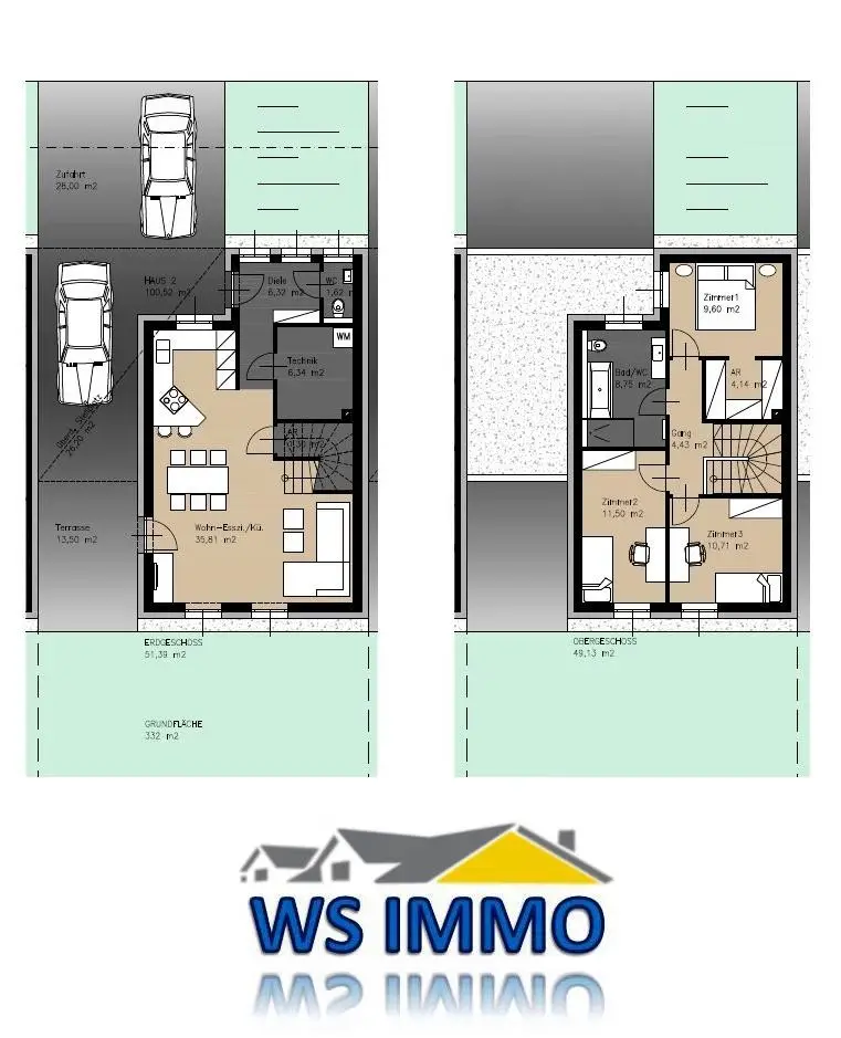 Die Gesamtwohnfläche je Haus beträgt 101,55 m2: im Erdgeschoß befindet sich ein offener Wohn-Essbereich mit Küche, außerdem Diele, WC, Technikraum und ein Abstellraum. Über die offene Treppe gelangt man im Obergeschoß zu drei Schlafräumen, davon einer mit angrenzendem Schrankraum, sowie zum Bad mit Toilette.