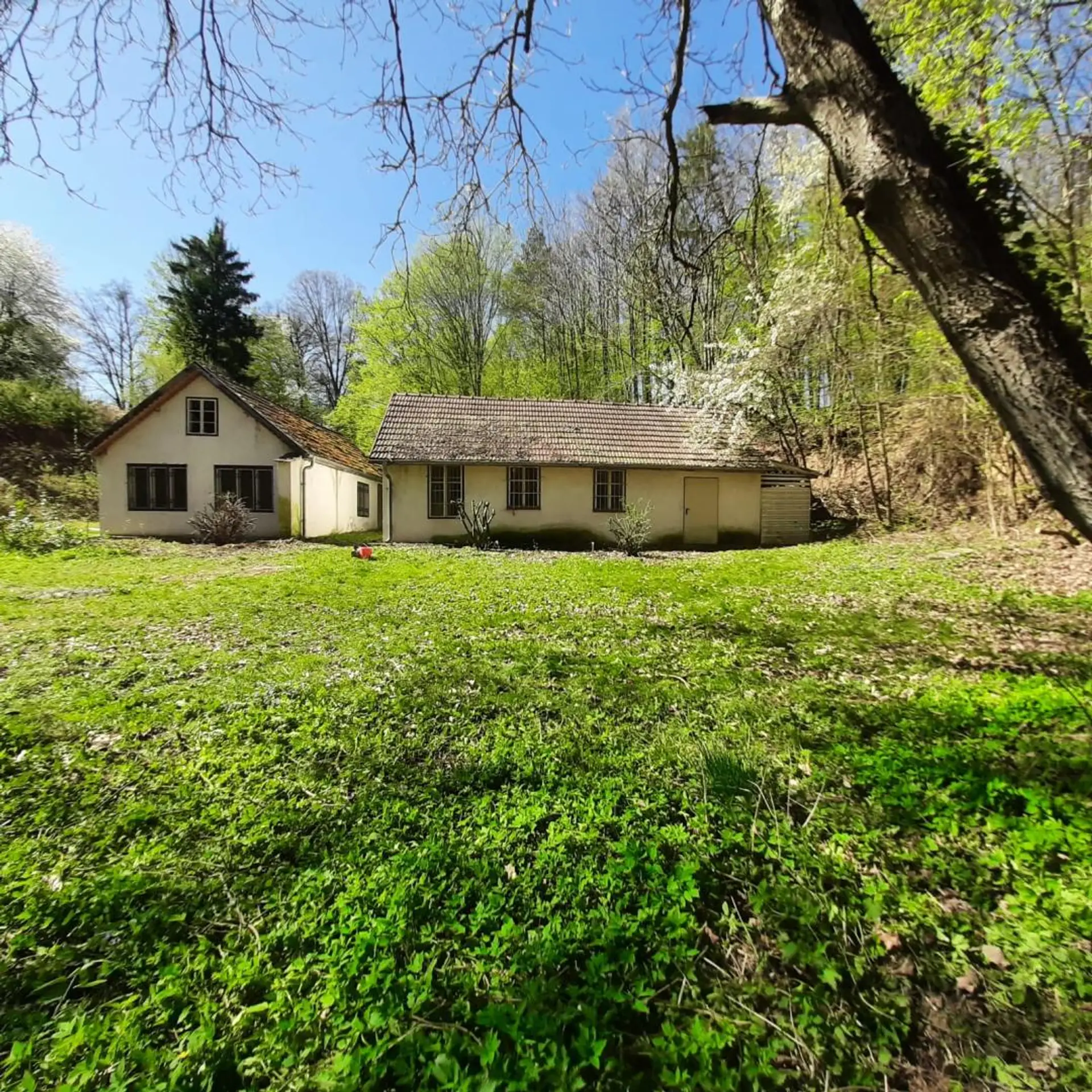 Durch die Liegenschaft fließt ein kleiner Bach, über den eine gut erhaltene Brücke zu den höher liegenden Gebäuden führt.