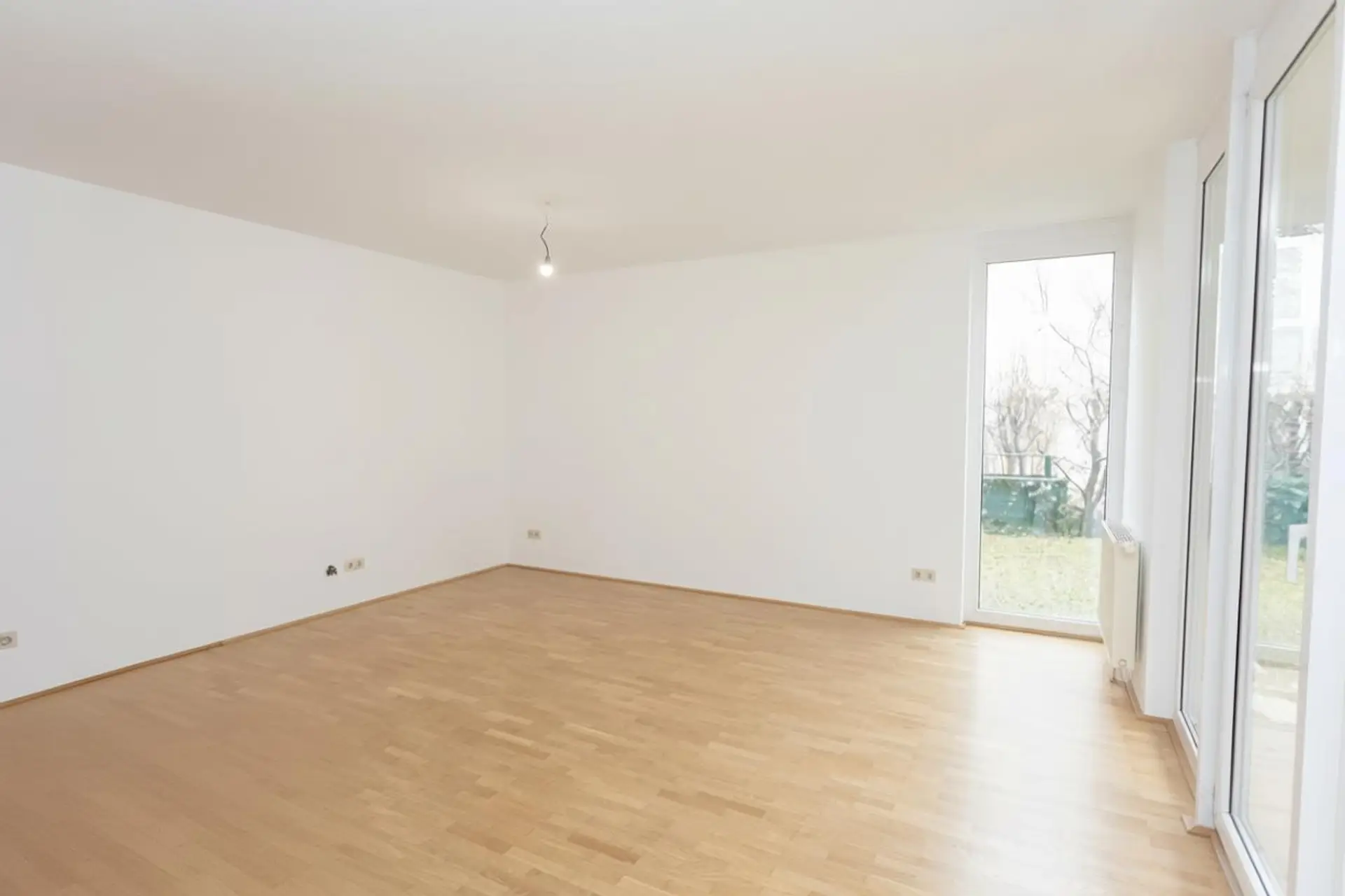 Aus dem ca. 10 m² großen, zentralen Vorraum gelangen Sie in das ca. 20 m² große Wohnzimmer mit Zugang zur ca. 8 m² großen Küche und Ausgang zur ca. 13 m² großen Terrasse samt Garten; des Weiteren zum ca. 14 m² großen Schlafzimmer, welches ebenfalls über einen Zugang zum Garten verfügt.
