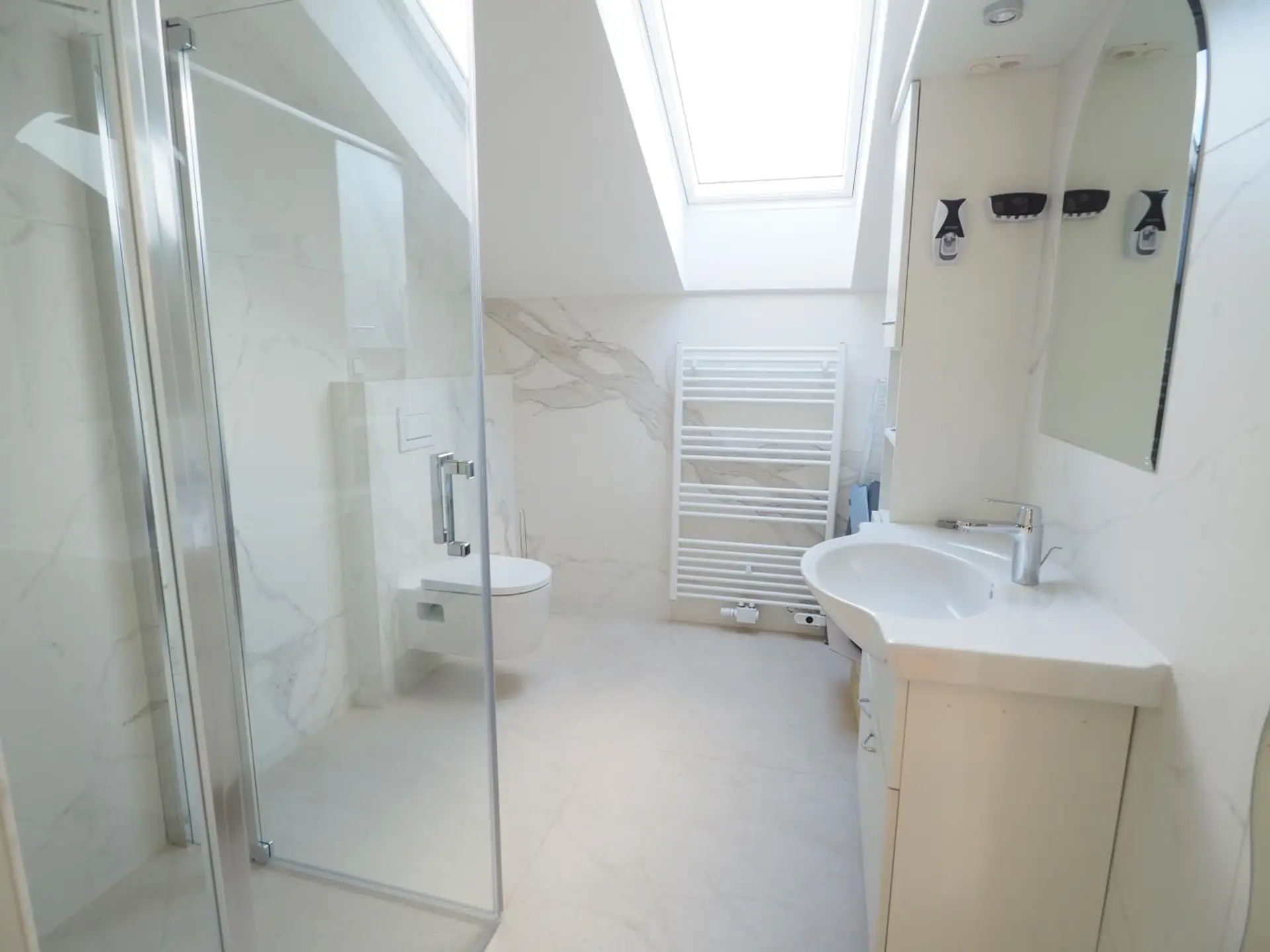 2. EBENE: Über eine Treppe gelangt man in einen kleinen Vorbereich im Dachgeschoss, von hier sind das Schlafzimmer mit einem schönen Ausblick, das Kabinett und das Badezimmer zentral begehbar.