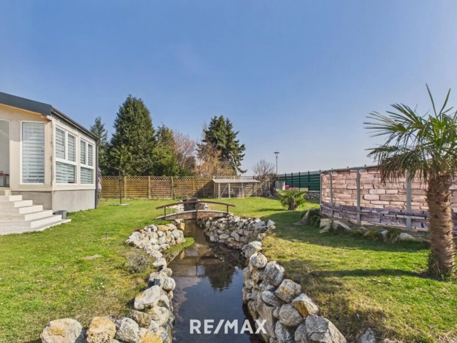 Der liebevoll angelegte Bachlauf, der sich durch den Garten zieht, verleiht dem Außenbereich eine außergewöhnliche Atmosphäre. Natursteine, Grünflächen und eine kleine Brücke schaffen ein harmonisches Gesamtbild und machen diesen Garten zu einer echten Wohlfühloase.
