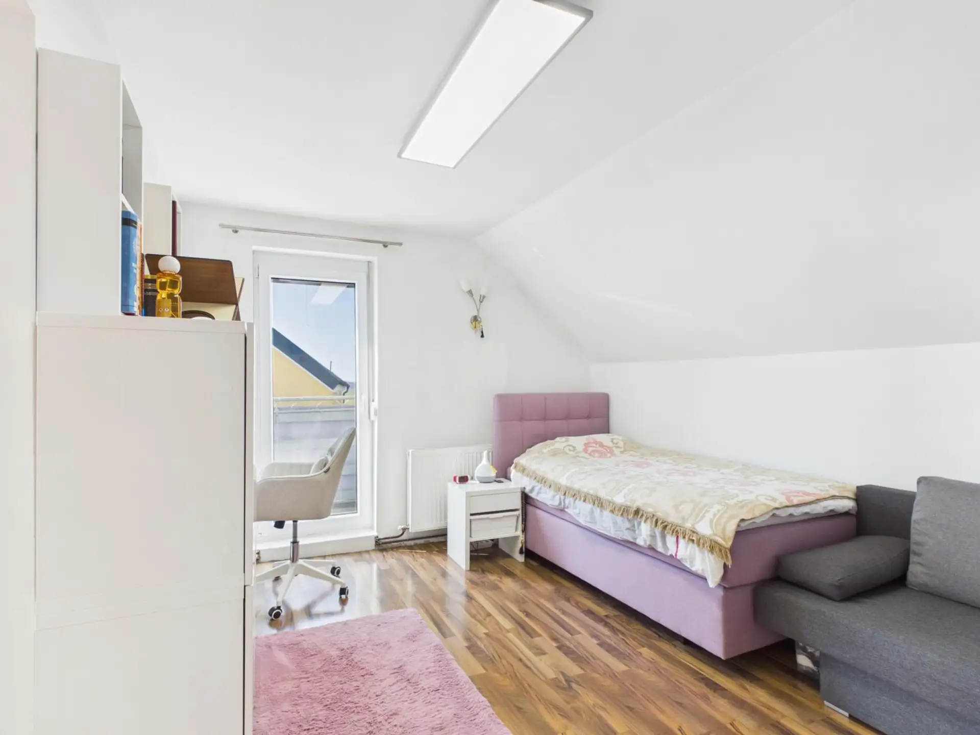 Hier befinden sich drei gut geschnittene Schlafzimmer, die flexibel als Kinderzimmer, Gästezimmer oder Homeoffice genutzt werden können. Die Räume sind hell und freundlich und versprechen ein angenehmes Wohnklima. Auch gibt es einen Balkon, der von einem der Zimmer aus zugänglich ist und einen wunderschönen Blick auf die umliegende Landschaft sowie den idyllischen Garten mit seinem eigenen Bach bietet.