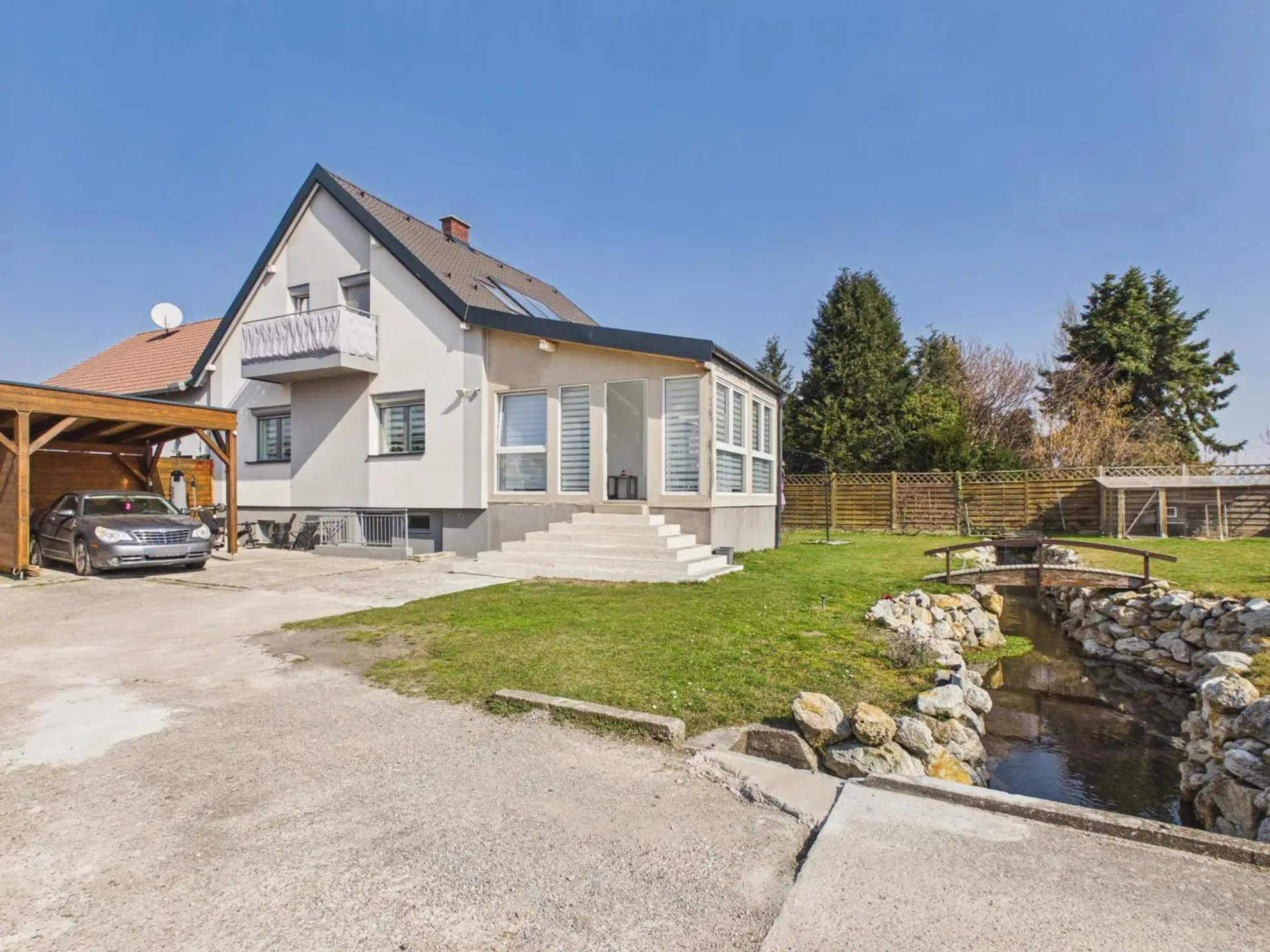 In einer ruhigen und familienfreundlichen Wohnlage erwartet Sie dieses gepflegte Wohnhaus mit einem ganz besonderen Highlight: Ein idyllischer Bachlauf im eigenen Garten, der dieser Liegenschaft eine außergewöhnliche und einmalige Atmosphäre verleiht. Das sanfte Plätschern des Wassers schafft eine natürliche Ruheoase und verleiht dem Außenbereich einen ganz besonderen Charme. Hier erleben Sie Wohnen in einer Umgebung, die Naturverbundenheit, Privatsphäre und Wohnkomfort auf harmonische Weise miteinander verbindet.