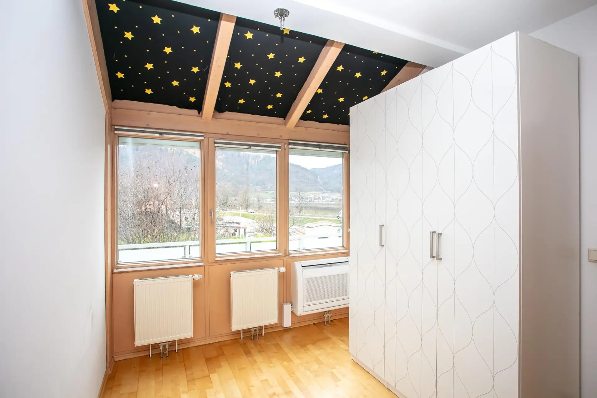 Für angenehme Temperaturen in den Sommermonaten sorgt eine Klimaanlage im Obergeschoss , an die die beiden südlich gelegenen Zimmer angeschlossen sind.