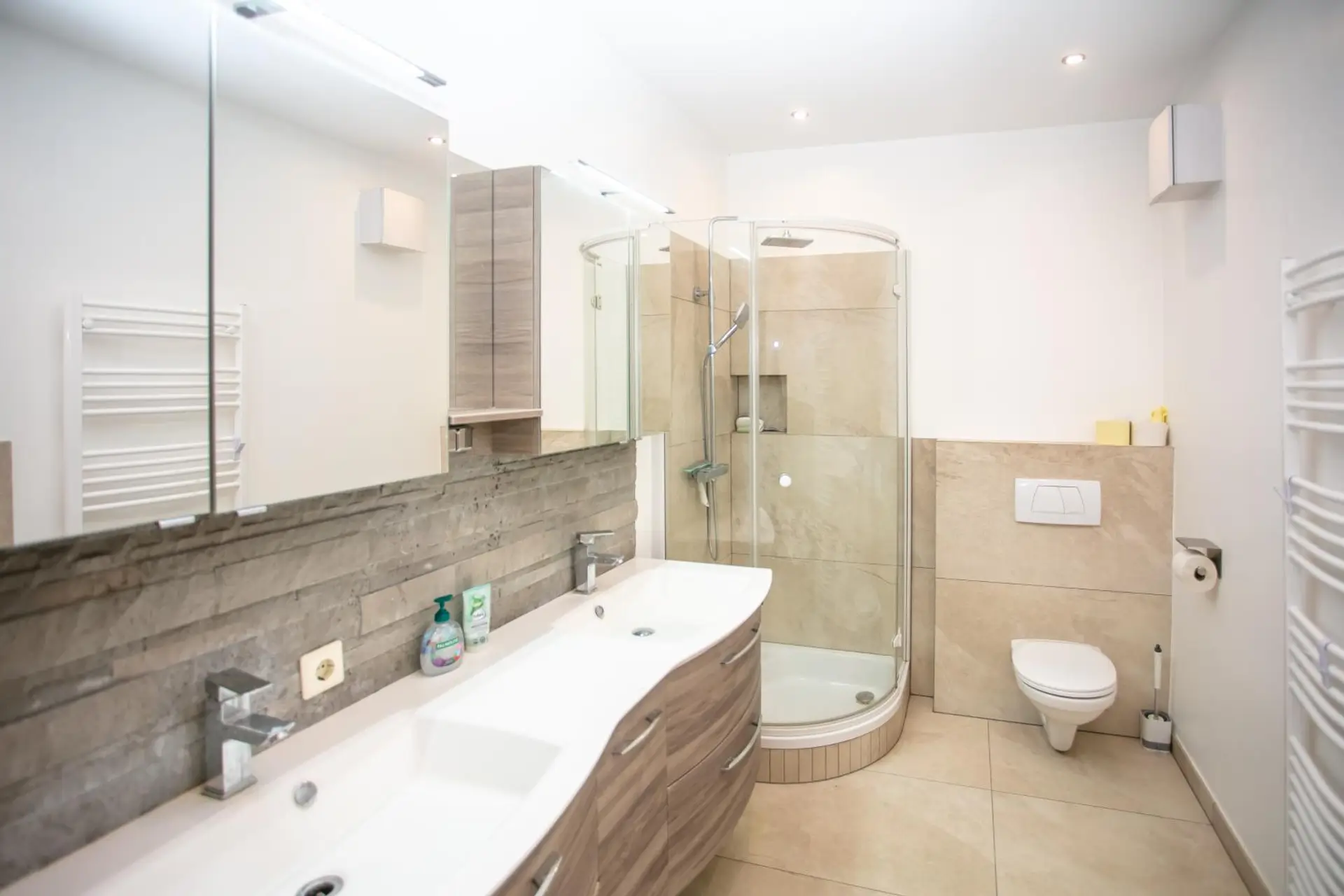 • Großes Badezimmer mit Wanne, Dusche, Doppelwaschbecken und WC