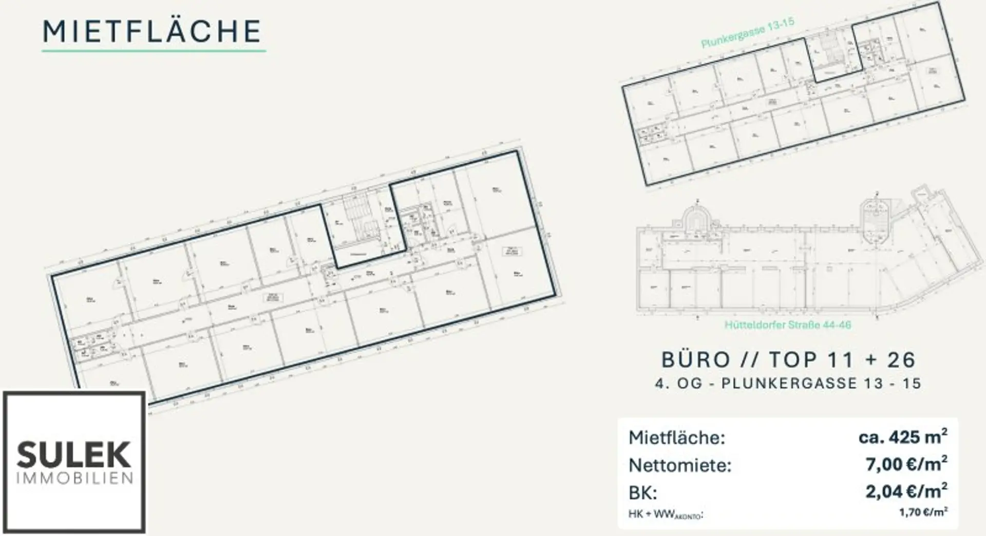 Die Liegenschaft umfasst zwei Gebäudeteile: das repräsentative Gründerzeithaus „Fröhlich Hof“ an der Hütteldorfer Straße sowie einen modernen Neubau in der ruhigeren Plunkergasse – ein attraktiver Standort für vielseitige gewerbliche Nutzungen.