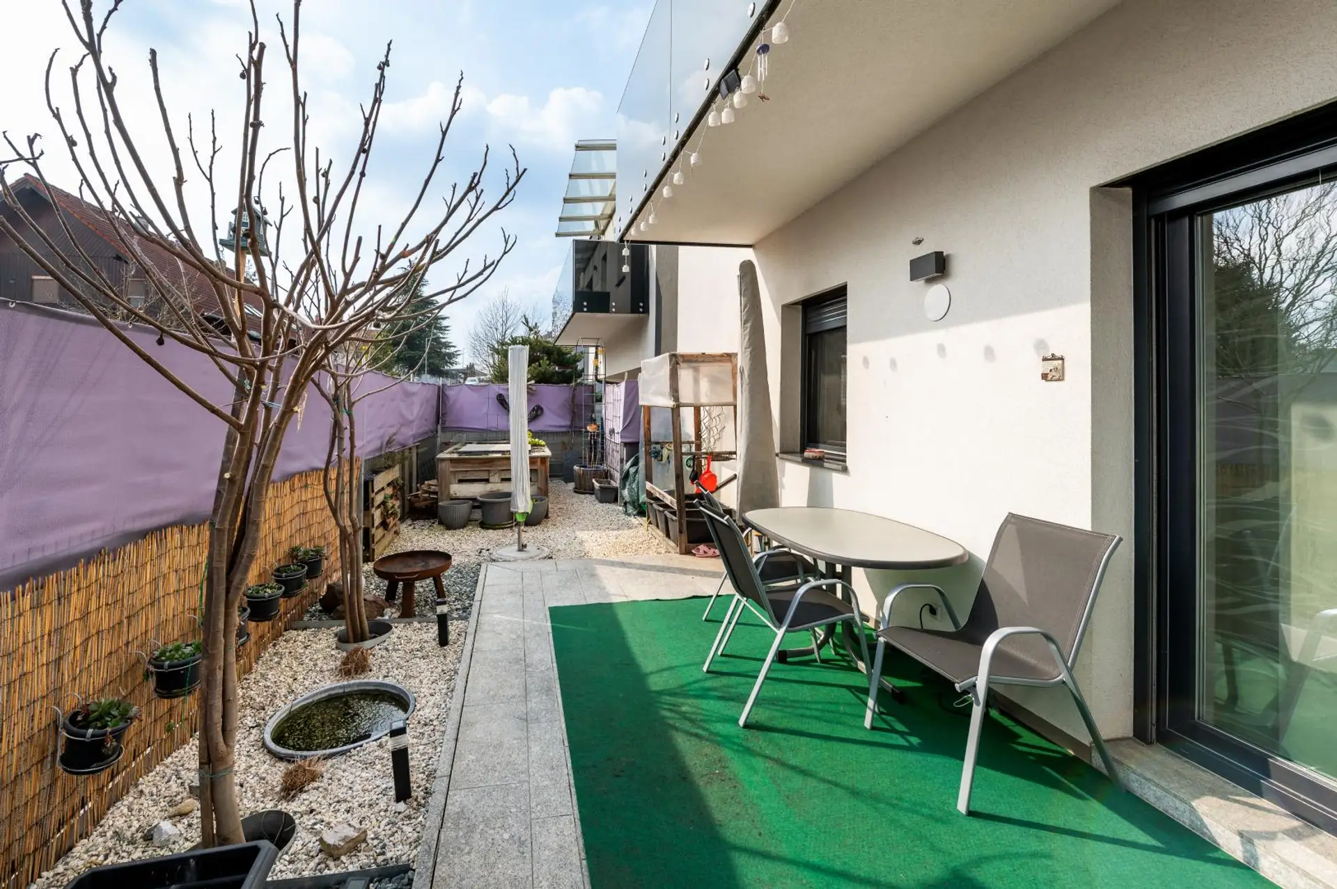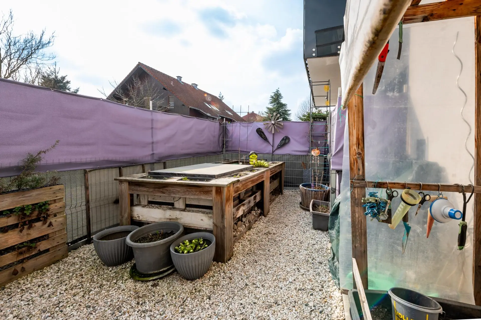 Ein besonderes Highlight ist der gemütliche Außenbereich mit Terrasse und Hochbeet, der ausreichend Platz für entspannte Stunden im Grünen bietet.