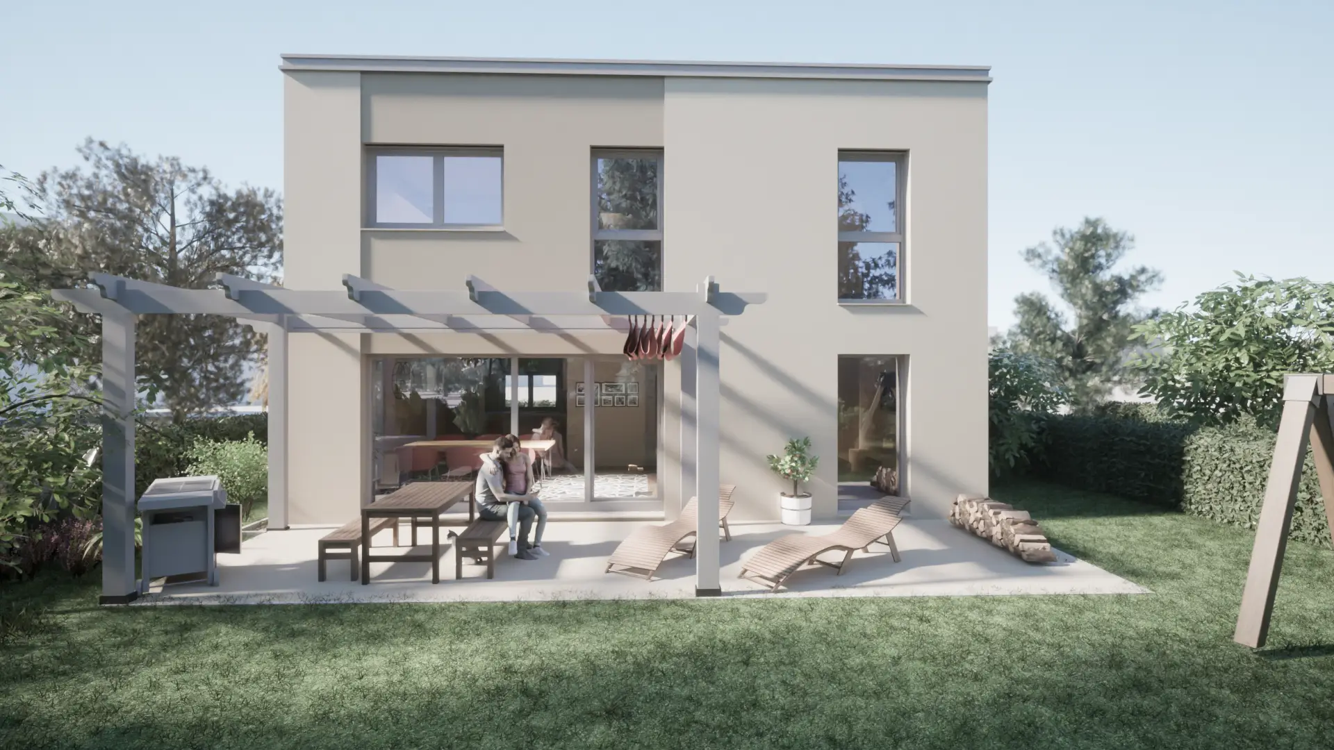Die modernen Eigenheime in nachhaltiger Holzmassivbauweise erfüllen den Niedrigstenergiestandard und überzeugen durch durchdachte Grundrisse, helle Räume und niedrige Energiekosten.