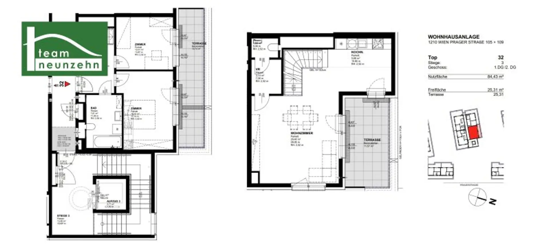 Die 3-Zimmer-Wohnung mit ca. 84,43 m² Wohnfläche sowie mit ca. 25,31 m² Terrasse befindet sich im 1. Dachgeschoss - 2. Dachgeschoss und orientiert sich Richtung Osten.