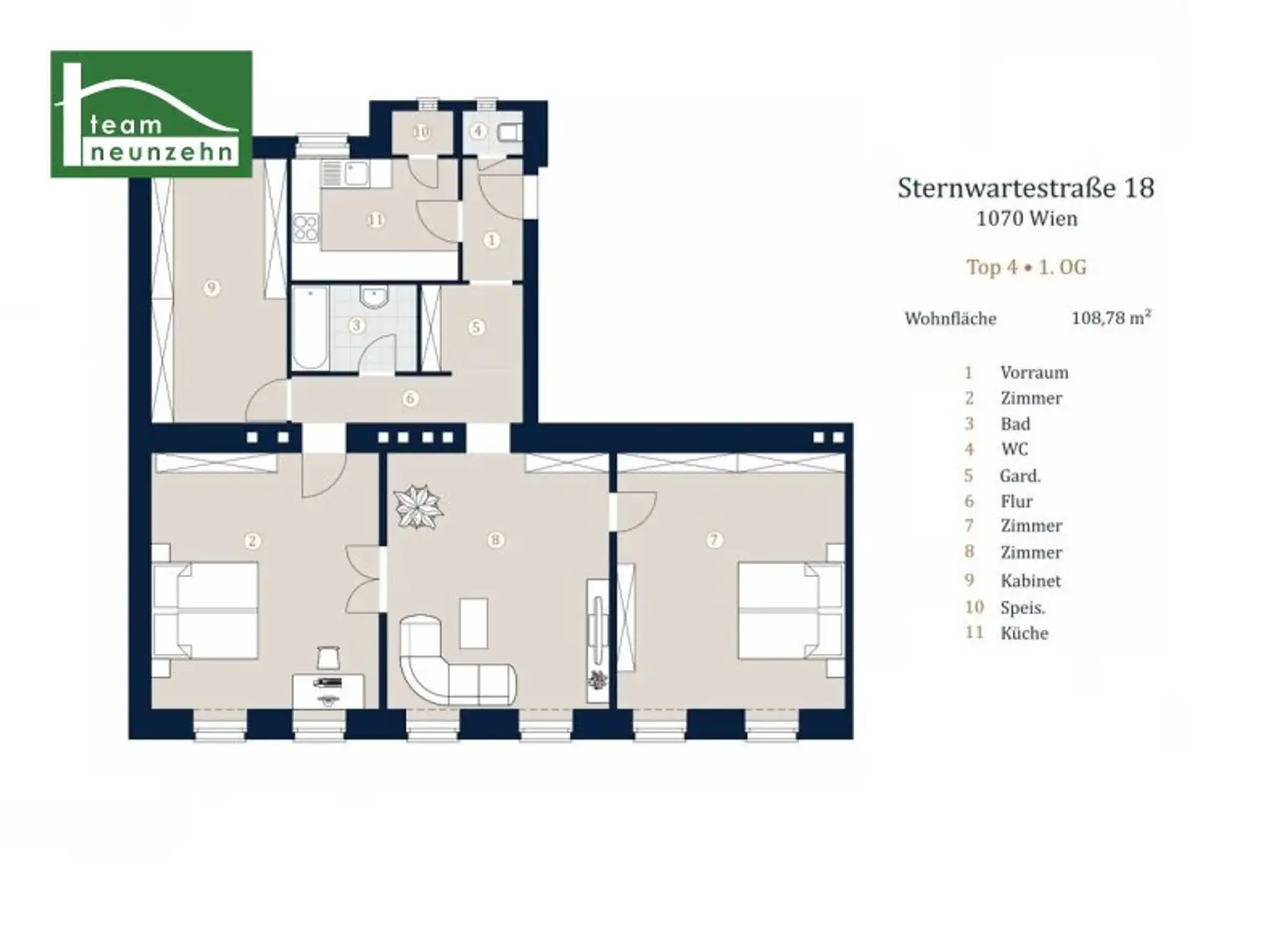 Die 4-Zimmer-Wohnung mit ca. 108,87 m² befindet sich im 1.Obergeschoss und hat folgende Raumaufteilung: