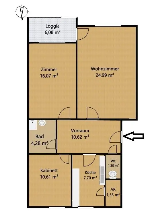 Die Wohnung liegt im 2. Stock eines gepflegten Wohnhauses und bietet eine großzügige Wohnfläche von 77,10 Quadratmetern und einer Loggia mit einer Größe von 6,08 m², Ost-West-Ausrichtung.