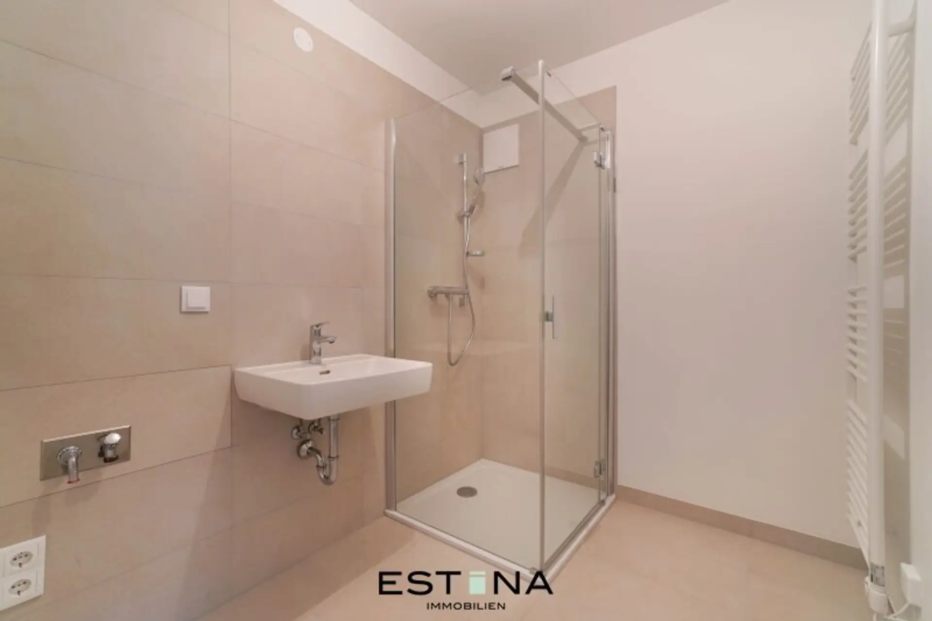 - Badezimmer mit Dusche, Waschbecken und Waschmaschinenanschluss