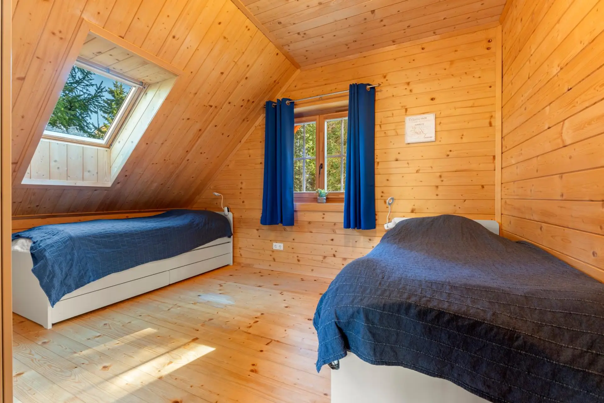 Es erstreckt sich über zwei Ebenen: Im Erdgeschoss befinden sich ein Vorraum, ein Schlafzimmer, ein Badezimmer mit Dusche und WC sowie der offene Wohnbereich mit moderner Küche, Esstisch und behaglichem Holzofen. Von hier aus gelangen Sie direkt auf die sonnige Terrasse, die zu geselligen Runden oder entspannten Momenten mit Blick in die Natur einlädt.