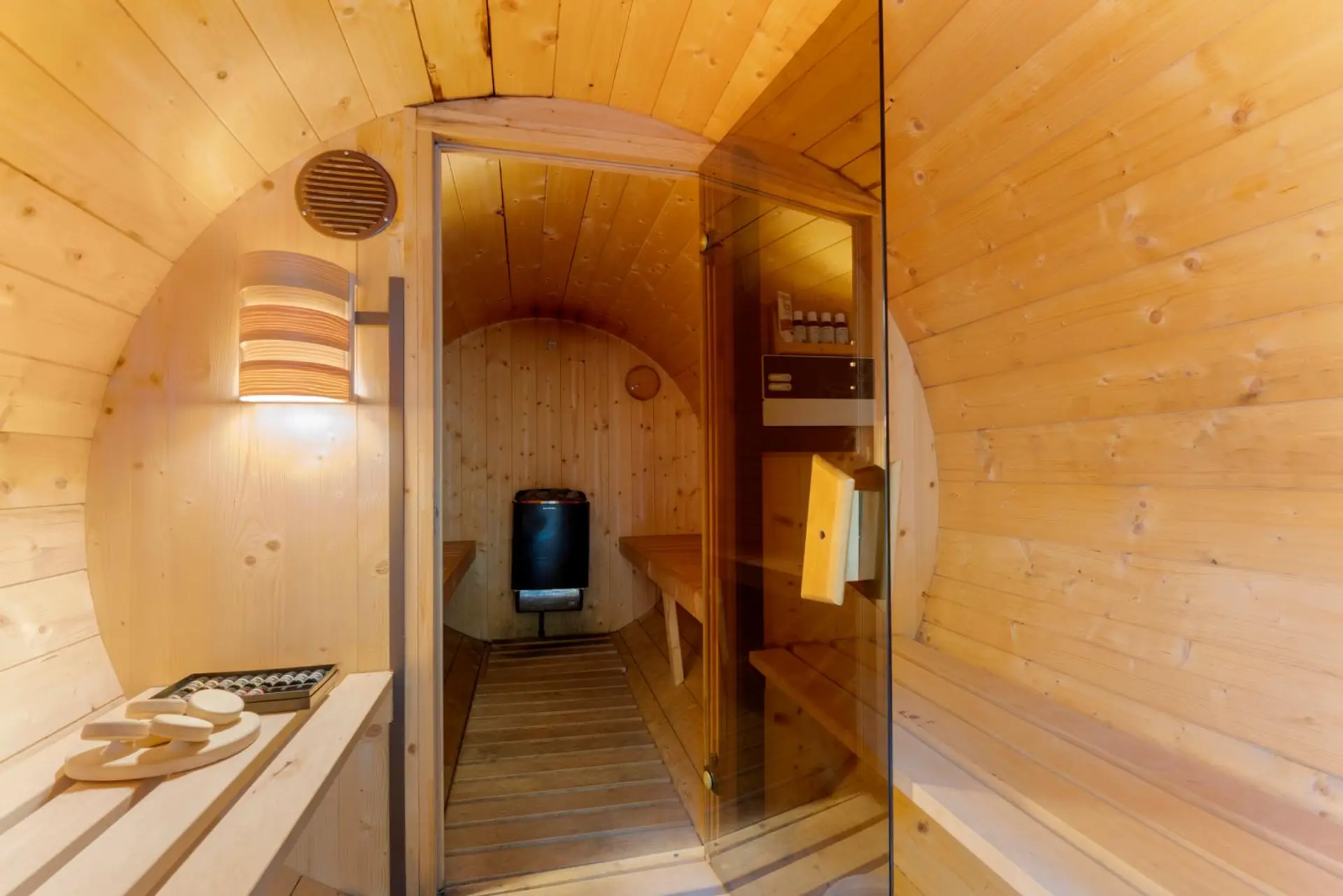 Ein besonderes Highlight ist die Fass-Sauna im Garten, die zur Entspannung und Regeneration einlädt. Der naturbelassene Garten und die angrenzenden Wald- und Weideflächen schaffen eine Atmosphäre der Ruhe und Erholung.