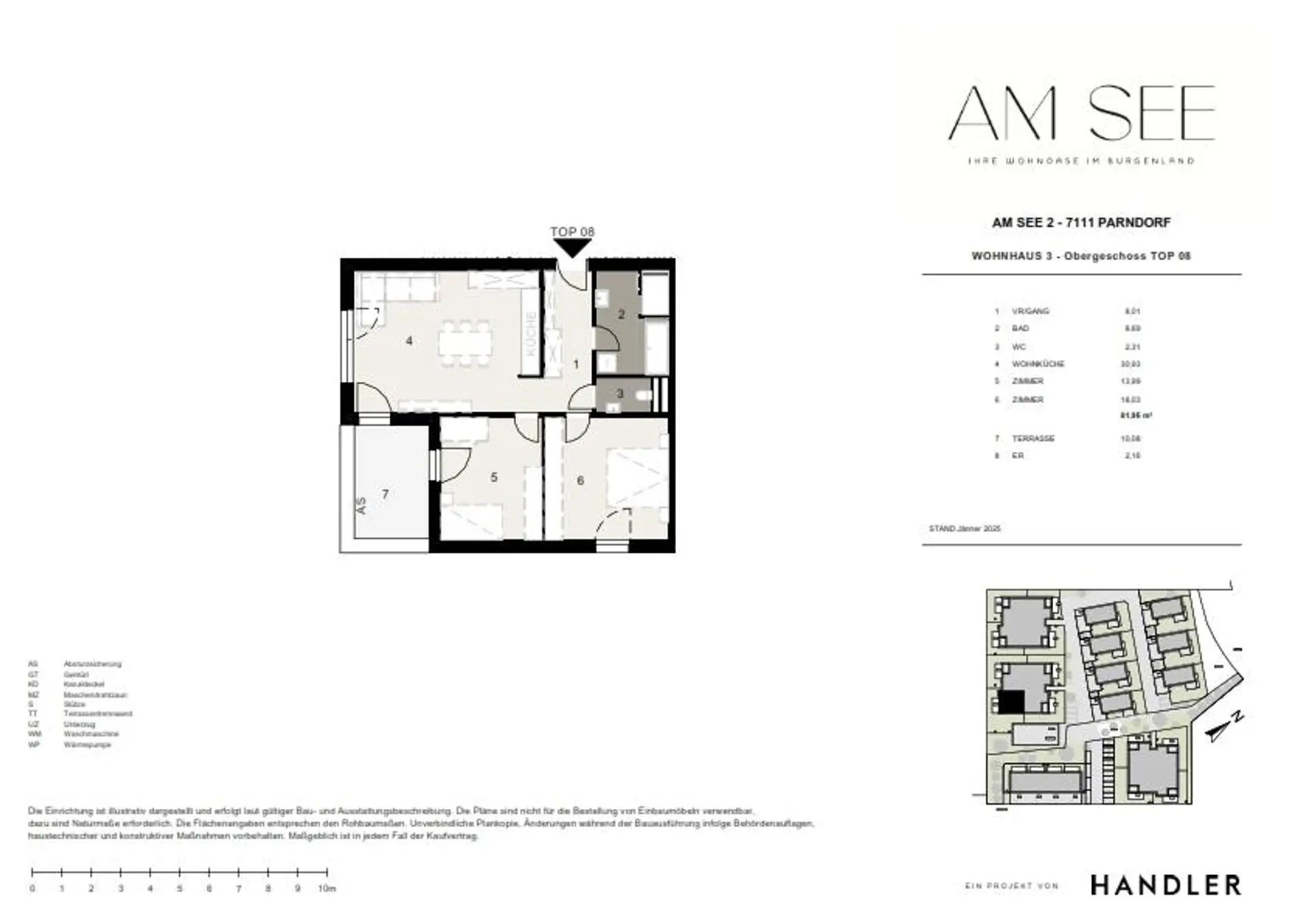 Die Wohnung Top 08 im Obergeschoss von Wohnhaus 3 im Projekt Wohnen am See bietet auf rund 82 m² Wohnfläche eine praktische Raumaufteilung. Sie umfasst einen offenen Wohn- und Essbereich mit Küche, zwei Schlafzimmer, ein Badezimmer, ein separates WC sowie einen Vorraum. Große Fensterflächen sorgen für helle Räume und ein angenehmes Wohngefühl.