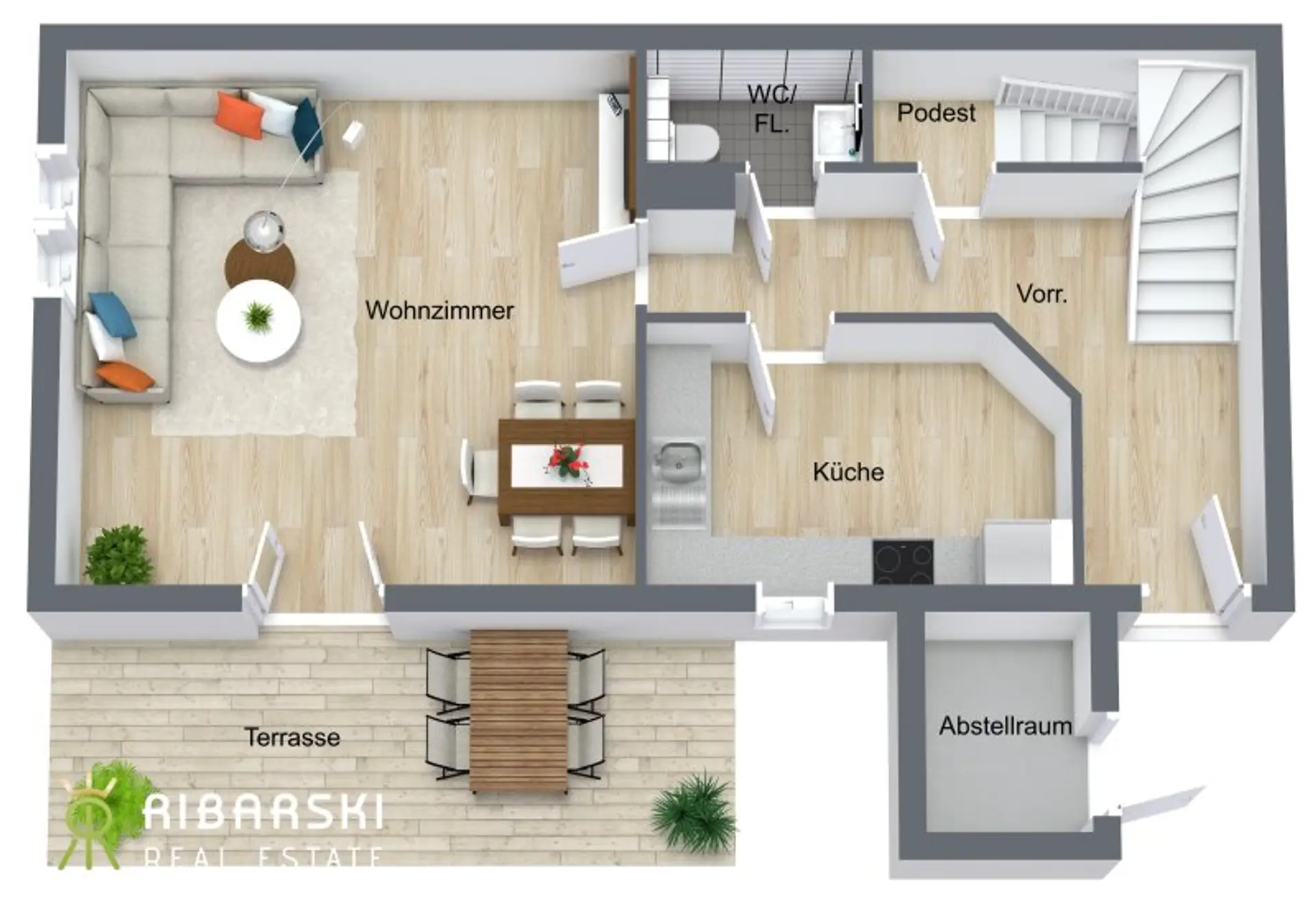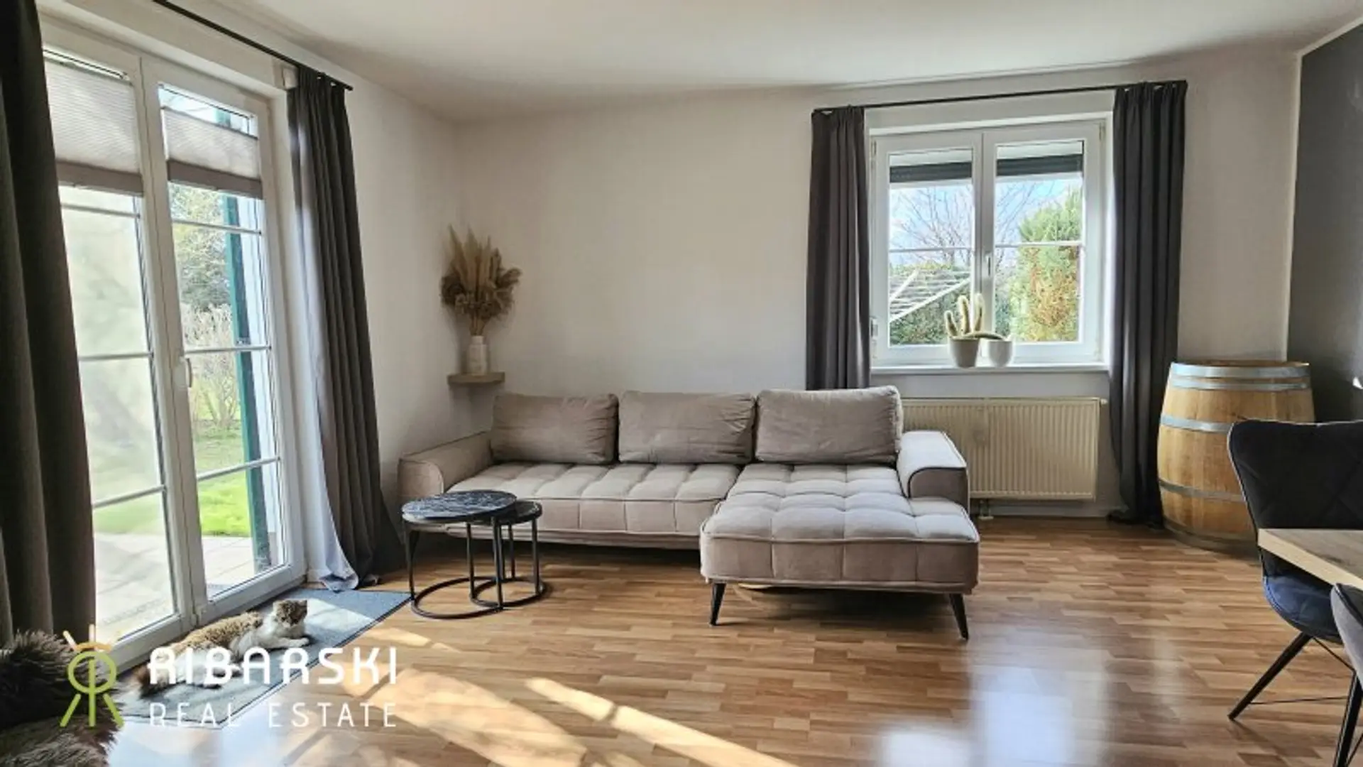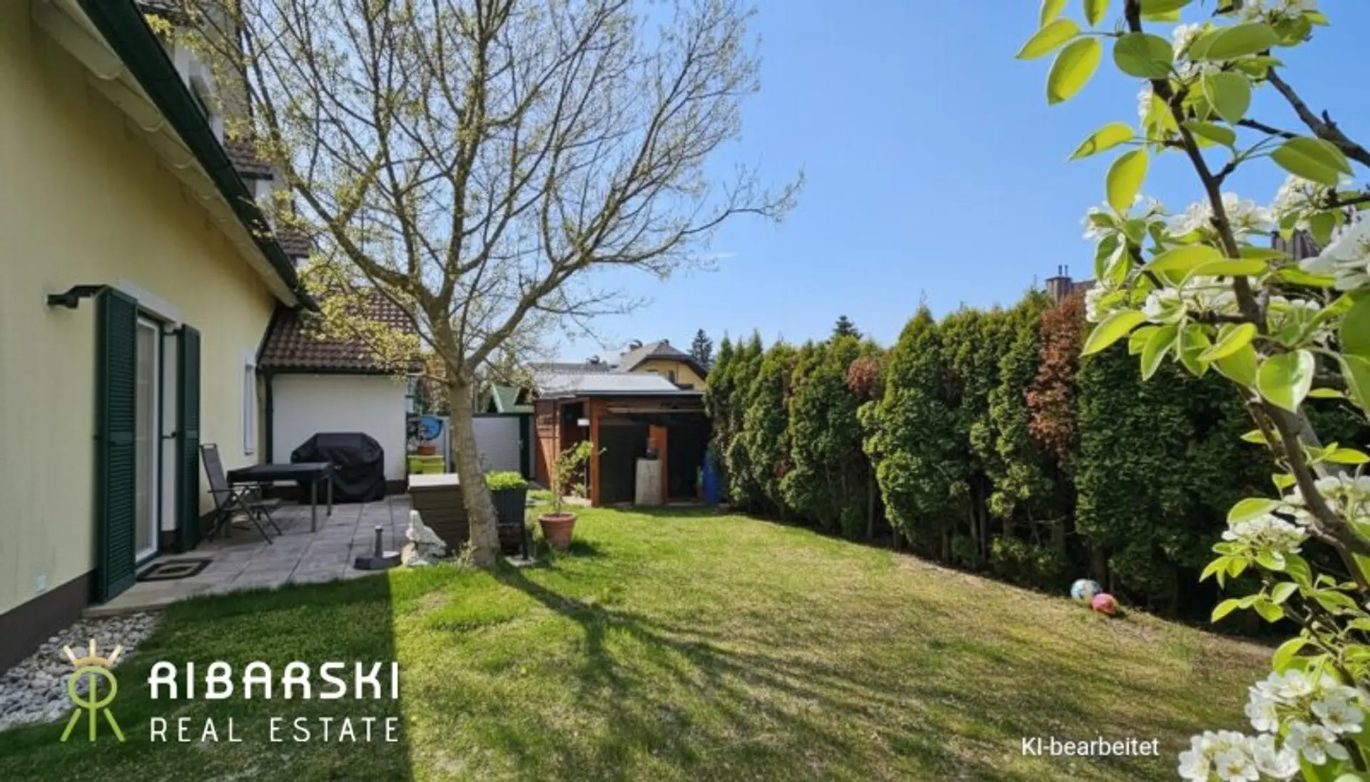 Die Wohnung liegt abseits der Straße, sodass Sie im Garten die Südwest-Ausrichtung, den freien Blick ins Grüne sowie Ihre Privatsphäre lieben werden. Ein großer Abstellraum im Eingangsbereich sowie ein Gartenhaus und ein Parkplatz direkt vor dem Eingang runden das praktische Familienerlebnis ab.