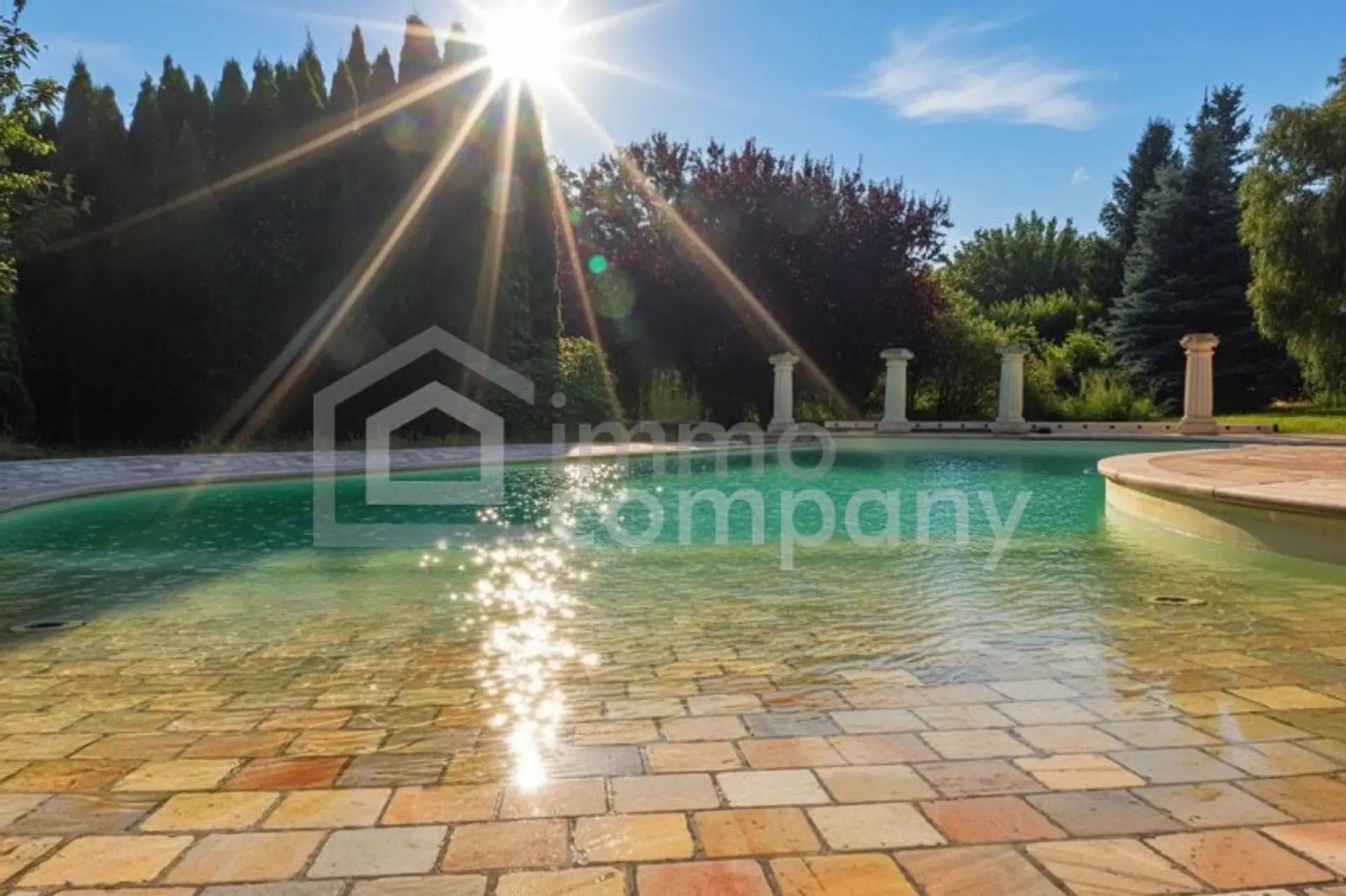 - großzügige Diele, Garderobe, WC, Kellerabgang, Zimmer 1, Zimmer 2 mit eigenem Vorraum - Bad und Schrankraum. Die Küche mit ~28m² mit herrlichem Blick ins weitläufige Grün, ist vom Gang aber auch über das Esszimmer zu erreichen. Das zentrale Wohnzimmer mit ~84m², Kamin und 3 Zugängen auf die Terrasse (etwa 140m², dazu der elegante Pool) und in den Garten verleiht einem das Gefühl von luftiger Freiheit und angenehmen Wohlfühlgefühl. Von hier aus sind 2 weitere Zimmer sowie das Esszimmer zu begehen.
