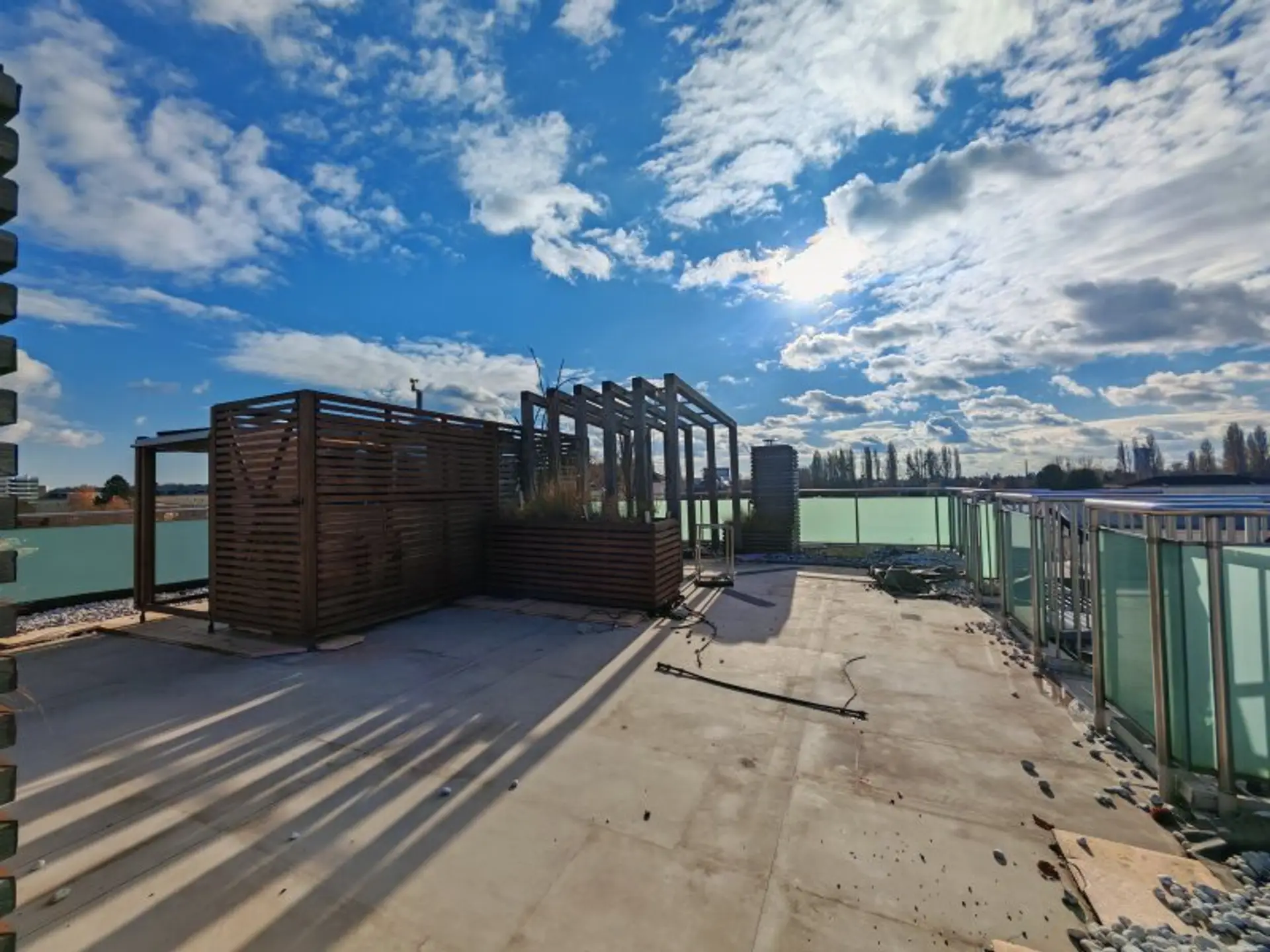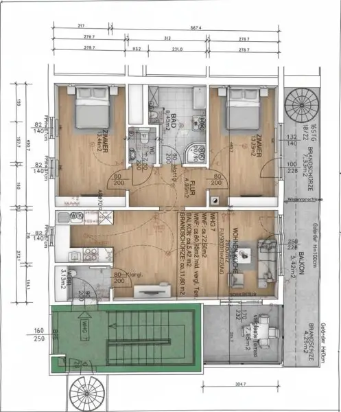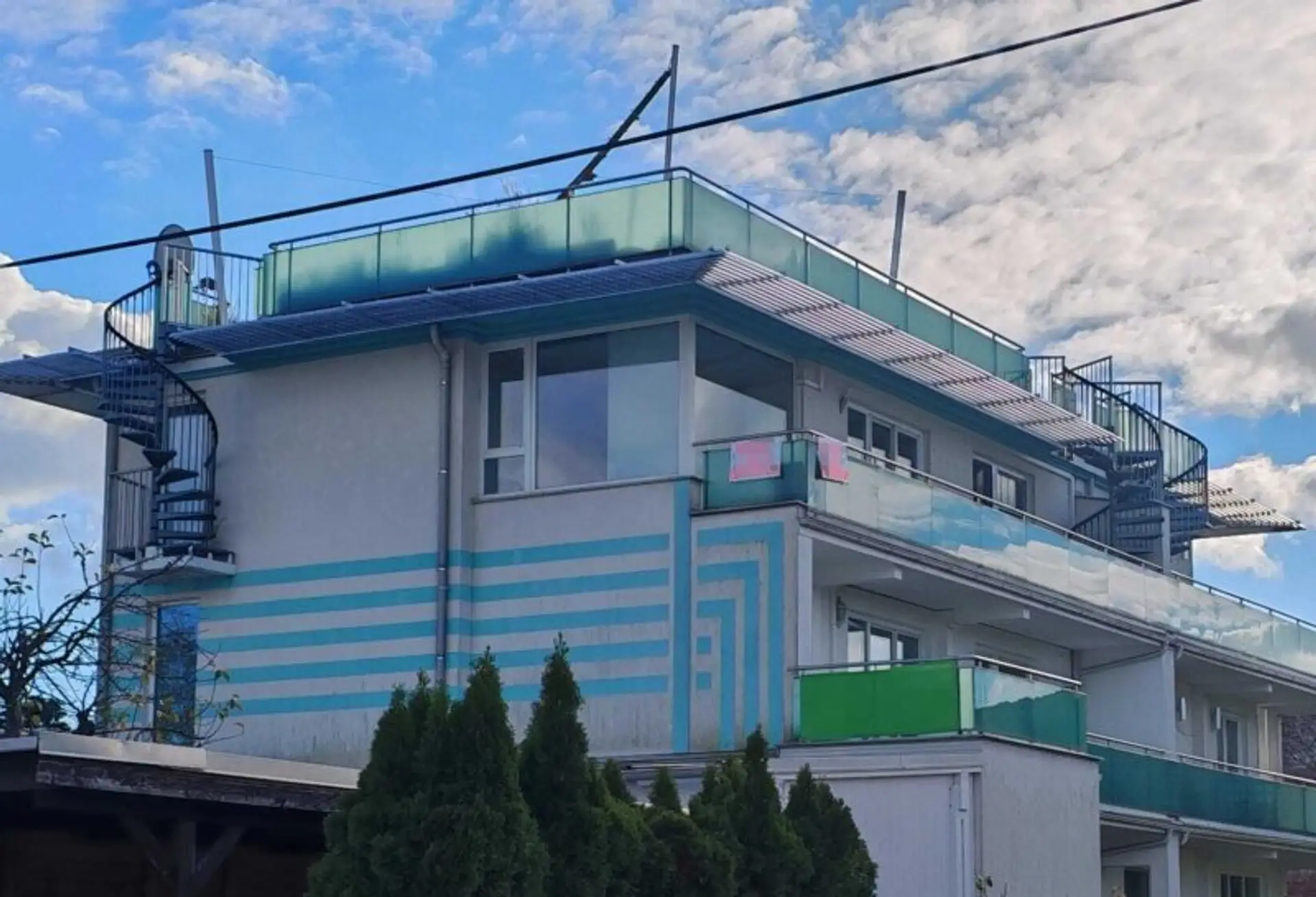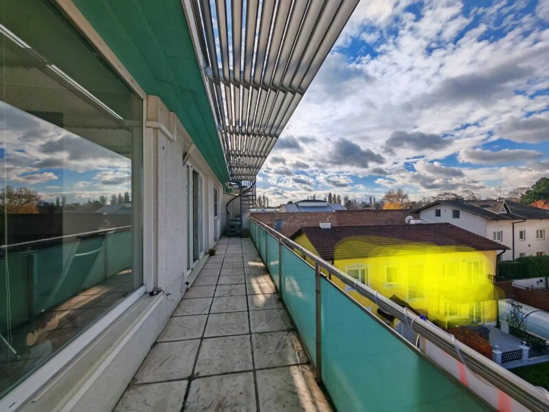 • großen Terrasse auf der Wohnungsebene (ca. 17 m2) und ca. 40 m2 großen Dachterrasse (derzeit wegen Sanierung nur eingeschränkt nutzbar)