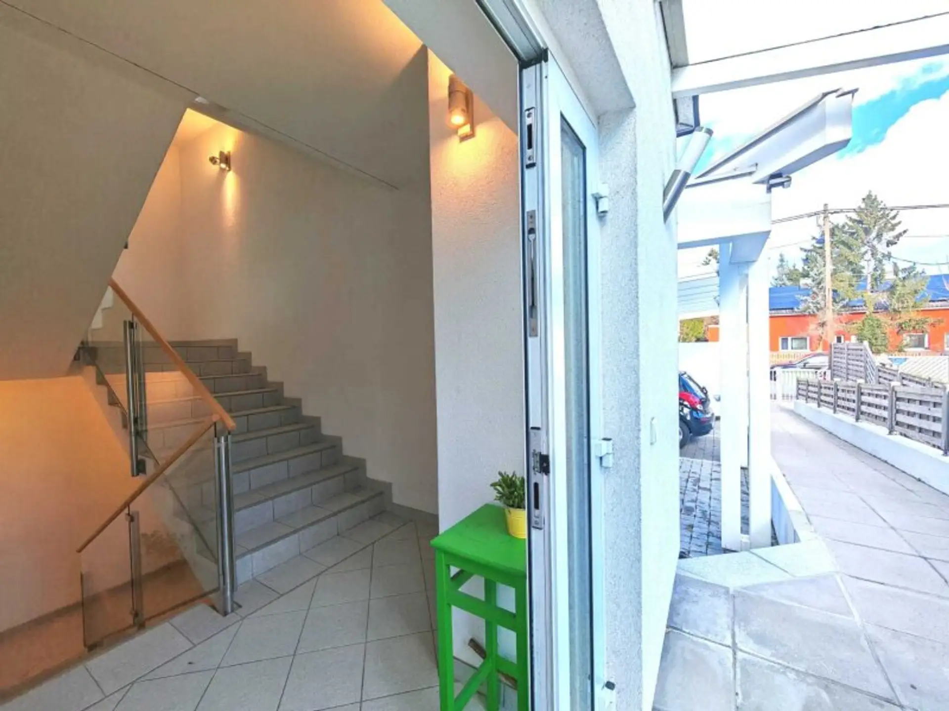 Das Auto parkt man gemütlich unterm Dach direkt vorm Haus. Die Straßenbahn 25 und Bus 93A sind nur in wenigen Gehminuten erreichbar und somit ist man rasch beim Donauzentrum und U1 oder bei der U2-Donaustadtbrücke.