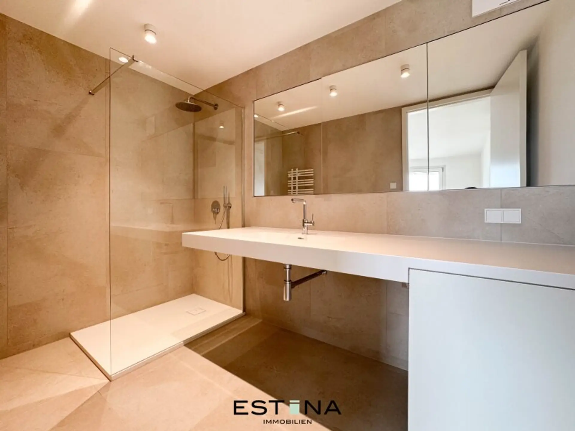 - Badezimmer mit Walk-In Dusche, Doppelwaschbecken und Waschmaschinenanschluss