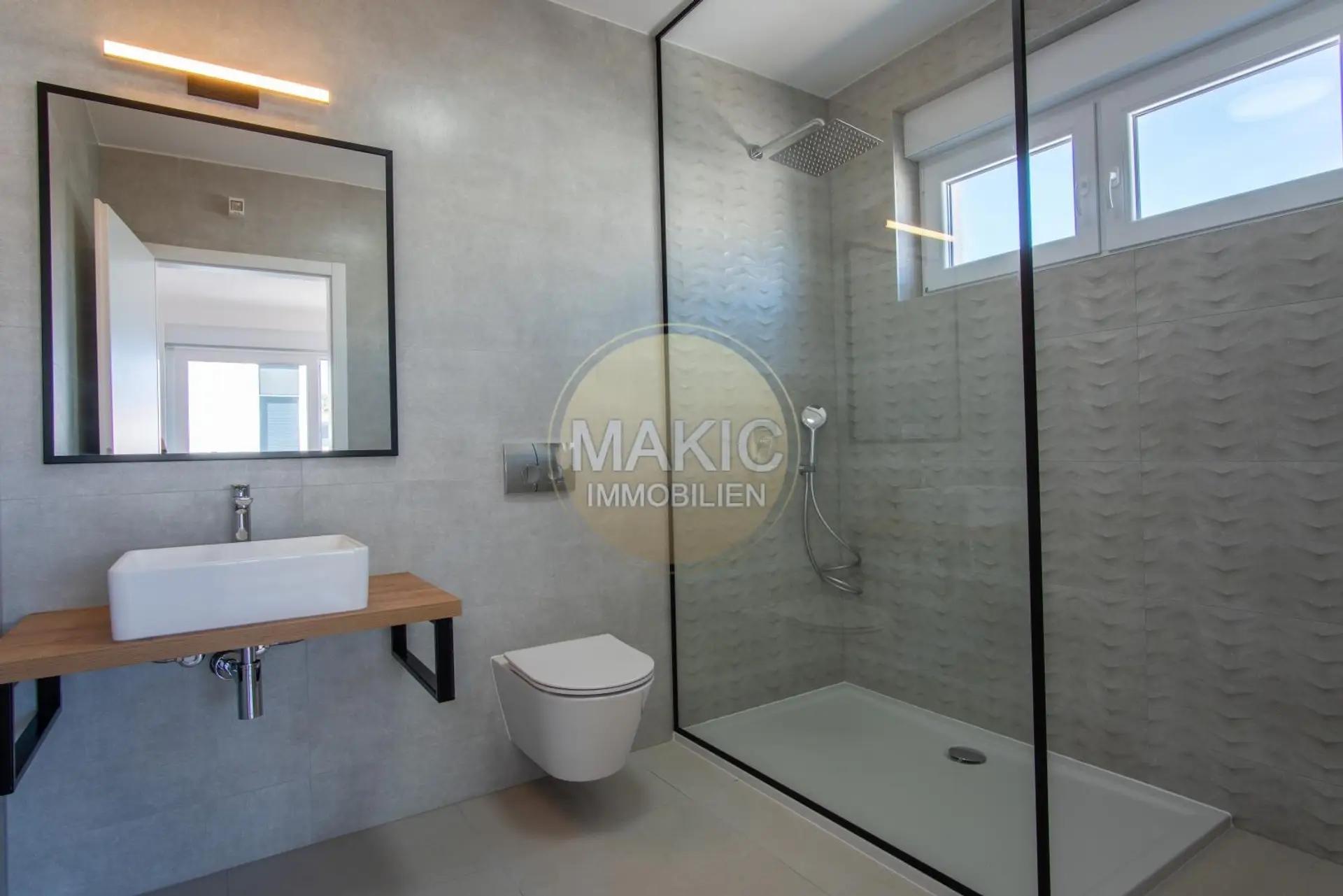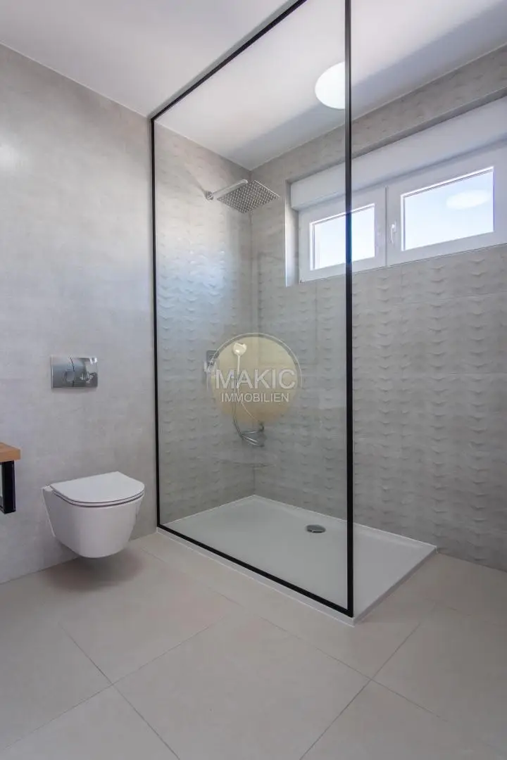 *BADEZIMMER: Fußbodenheizung, hochwertige Keramik 120X40, begehbare Glasduschen, Kopfmischer und Duschköpfe, Elektroboiler, Vorbereitung für einen elektrischen Badheizkörper, Jalousien mit elektrischem Hub, eingebautes Waschbecken und Wasserhahn, SIKA-Imprägnierung, GEBERIT Wassertanks