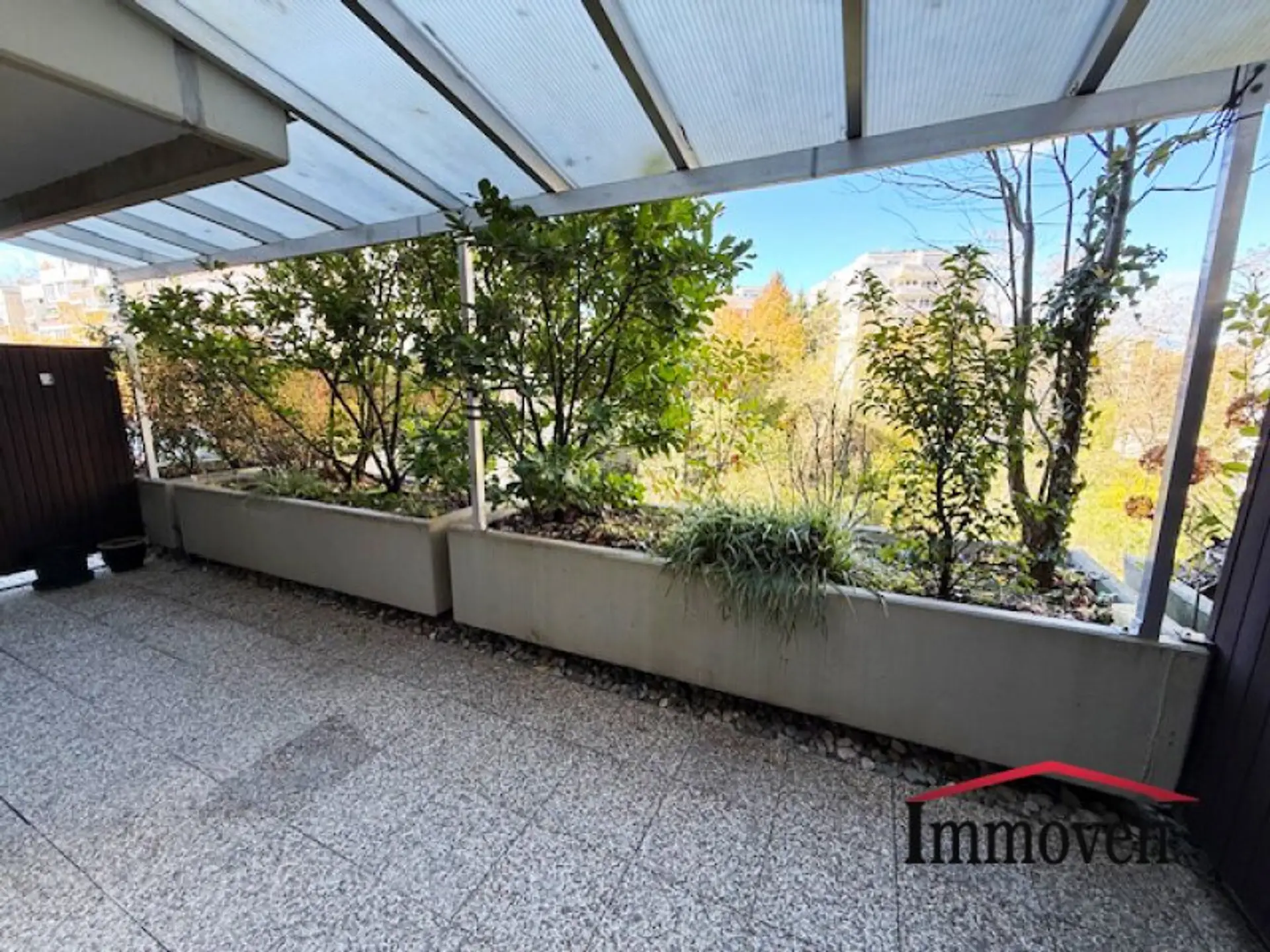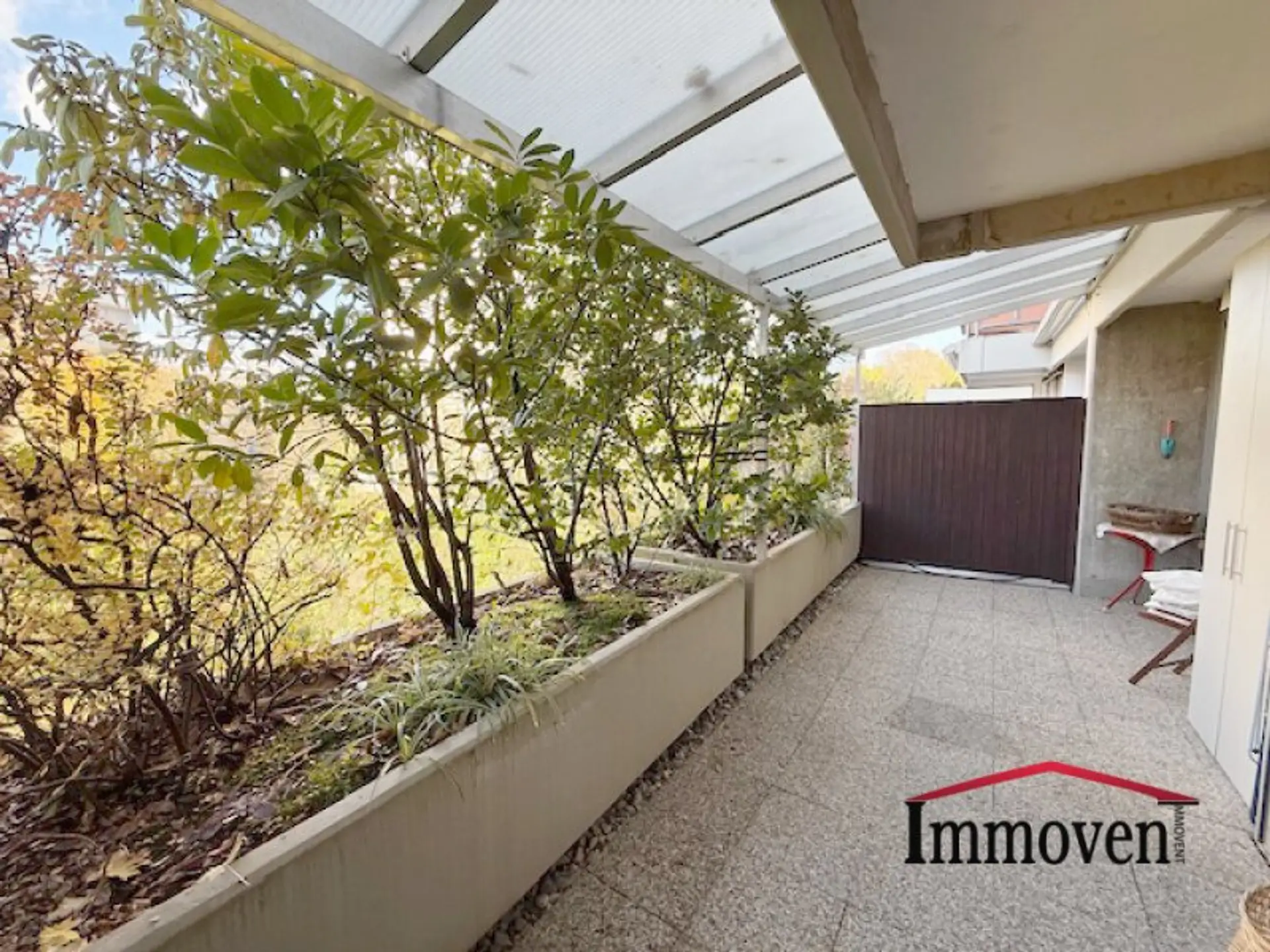 Auf der Terrasse mit Aussicht lässt es sich herrlich entspannen, da durch das viele Grün ein natürlicher Sichtschutz gegeben ist. Zu dieser freundlichen und einladenden Wohnung gehört auch ein Garagenstellplatz.