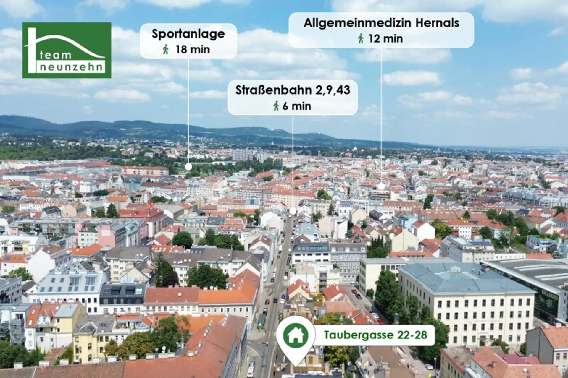Die Immobilie in der Taubergasse liegt in einer ruhigen Seitenstraße, unweit der Hernalser Hauptstraße, und vereint die Vorzüge urbaner Infrastruktur mit einer entspannten Wohnlage.