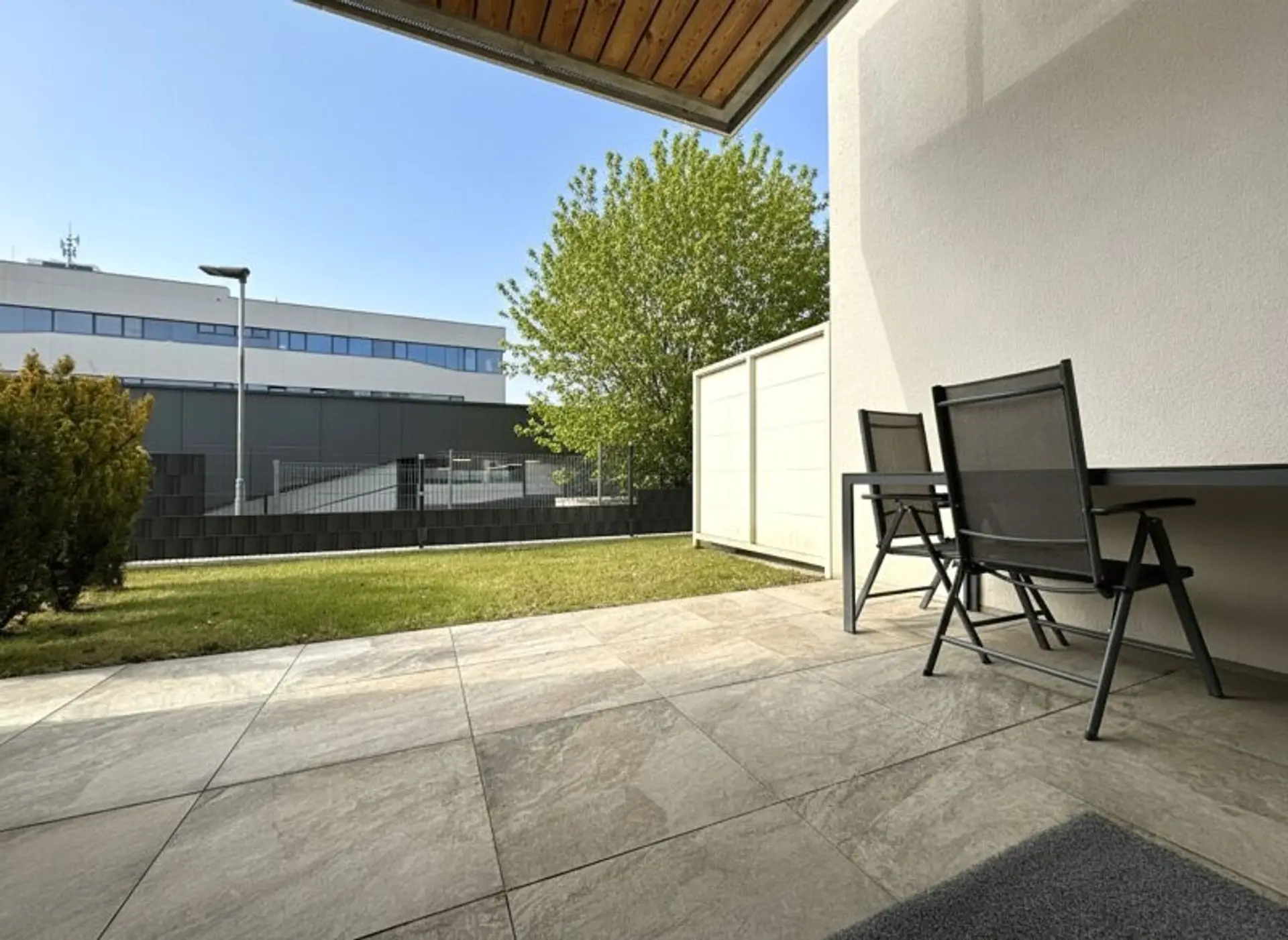 Die große Terrasse erweitert den Wohnraum nach draußen und lädt zum Entspannen ein. Der kleine Gartenanteil bietet zusätzliche Gestaltungsmöglichkeiten – sei es für eine Bepflanzung oder eine individuelle Nutzung durch die Mieter.
