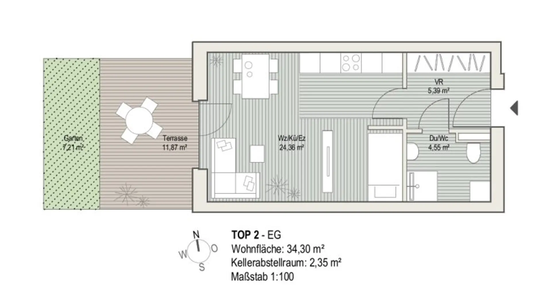 Die perfekt geschnittene Wohnung bietet auf 34,3 m² alles, was eine gefragte Mietwohnung ausmacht. Dank der westlichen Ausrichtung ist sie hell und freundlich, während Terrasse und Garten für zusätzlichen Wohnkomfort sorgen.