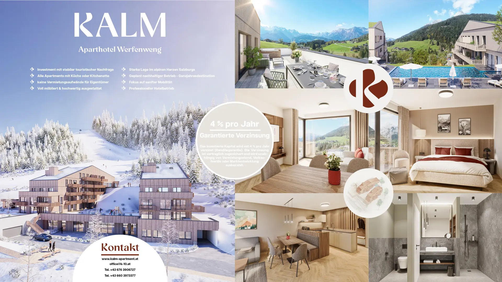 Stellen Sie sich einen Ort vor, an dem alpiner Charme, moderne Architektur und ein professionelles touristisches Konzept zu einer nachhaltigen Investmentchance verschmelzen. Mit dem Aparthotel KALM Werfenweng entsteht ein Projekt, das Urlaubsqualität, Komfort und Wertstabilität vereint: 40 voll ausgestattete Apartments, geführt nach einem zeitgemäßen Hotelbetriebskonzept – konsequent auf den touristischen Markt ausgerichtet. Eingebettet in die beeindruckende Bergwelt des Salzburger Landes erfüllt das Projekt höchste Ansprüche an Ausstattung, Design und Servicequalität. Vom Wellnessbereich und hauseigenen Restaurant über vielfältige Entertainment-Zonen bis hin zu durchdachten Grundrissen – jedes Detail ist darauf ausgelegt, Gästen besondere Momente zu bieten und Investor*innen ein stabiles, renditestarkes Investment zu ermöglichen.