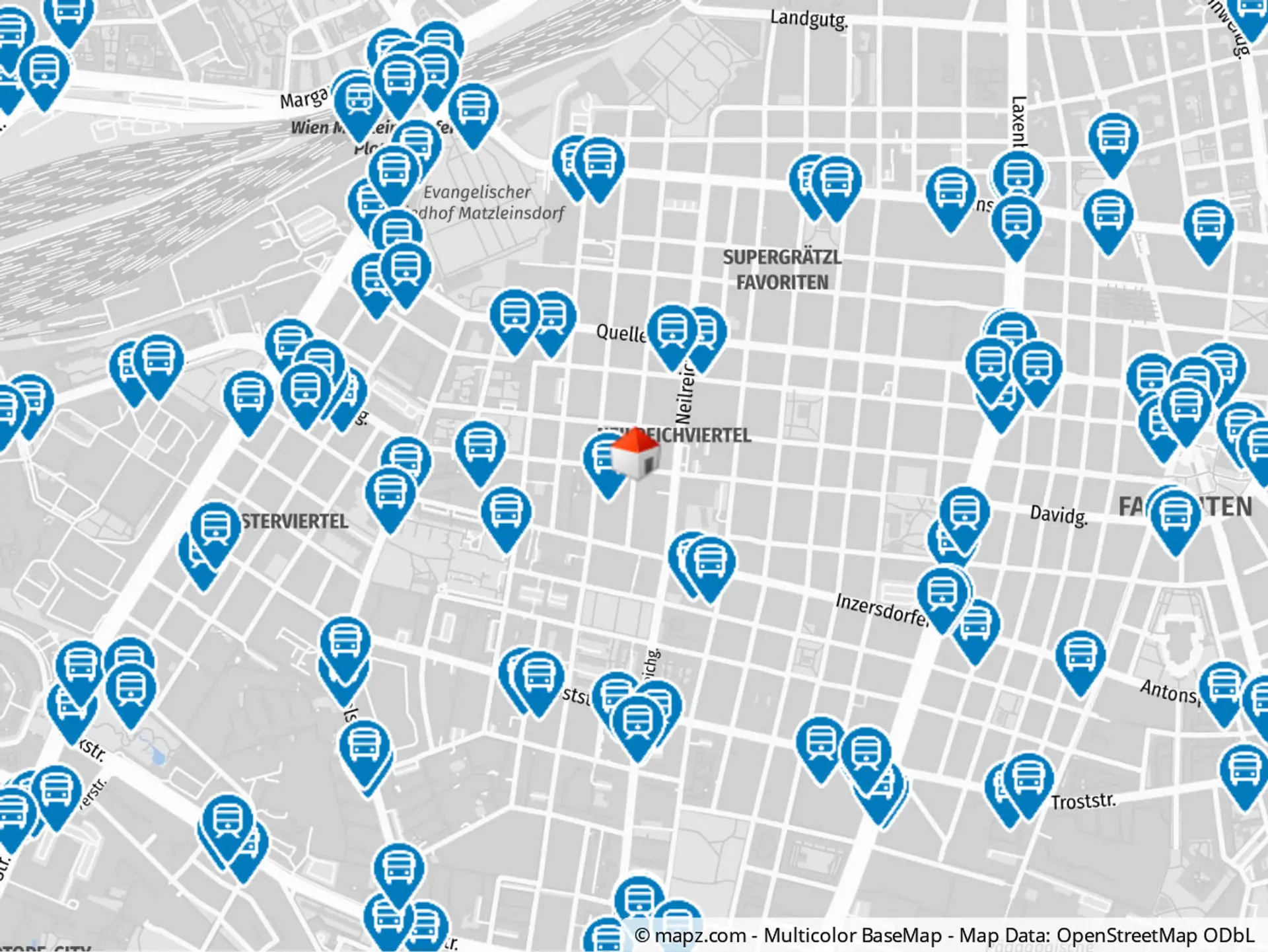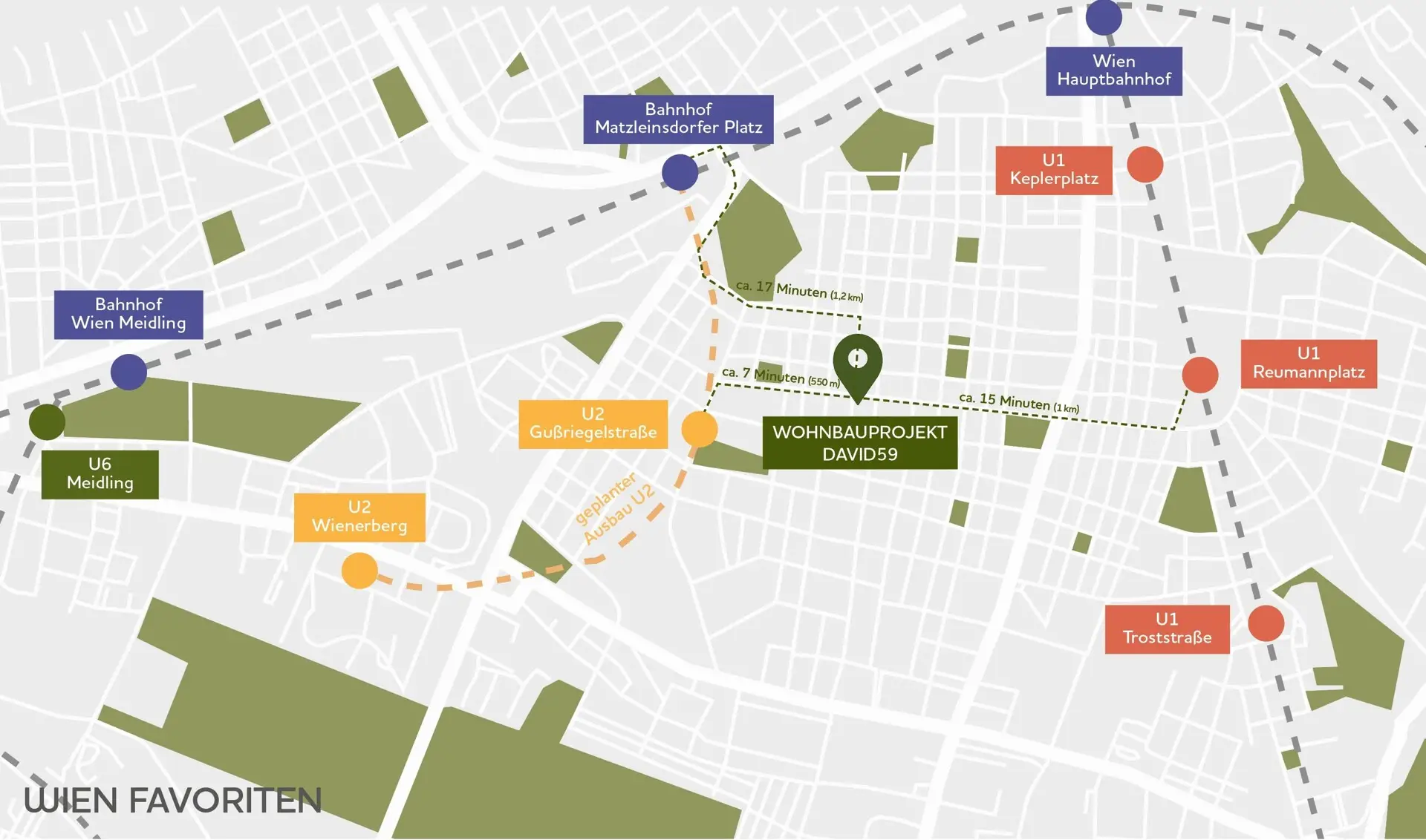 Die Nähe zu wichtigen Verkehrsknotenpunkten wie dem Matzleinsdorfer Platz, dem Hauptbahnhof und dem Reumannplatz macht das Wohnbauprojekt in der Davidgasse in Favoriten nicht nur gut erreichbar, sondern auch zu einem zentralen Punkt in der Stadt.