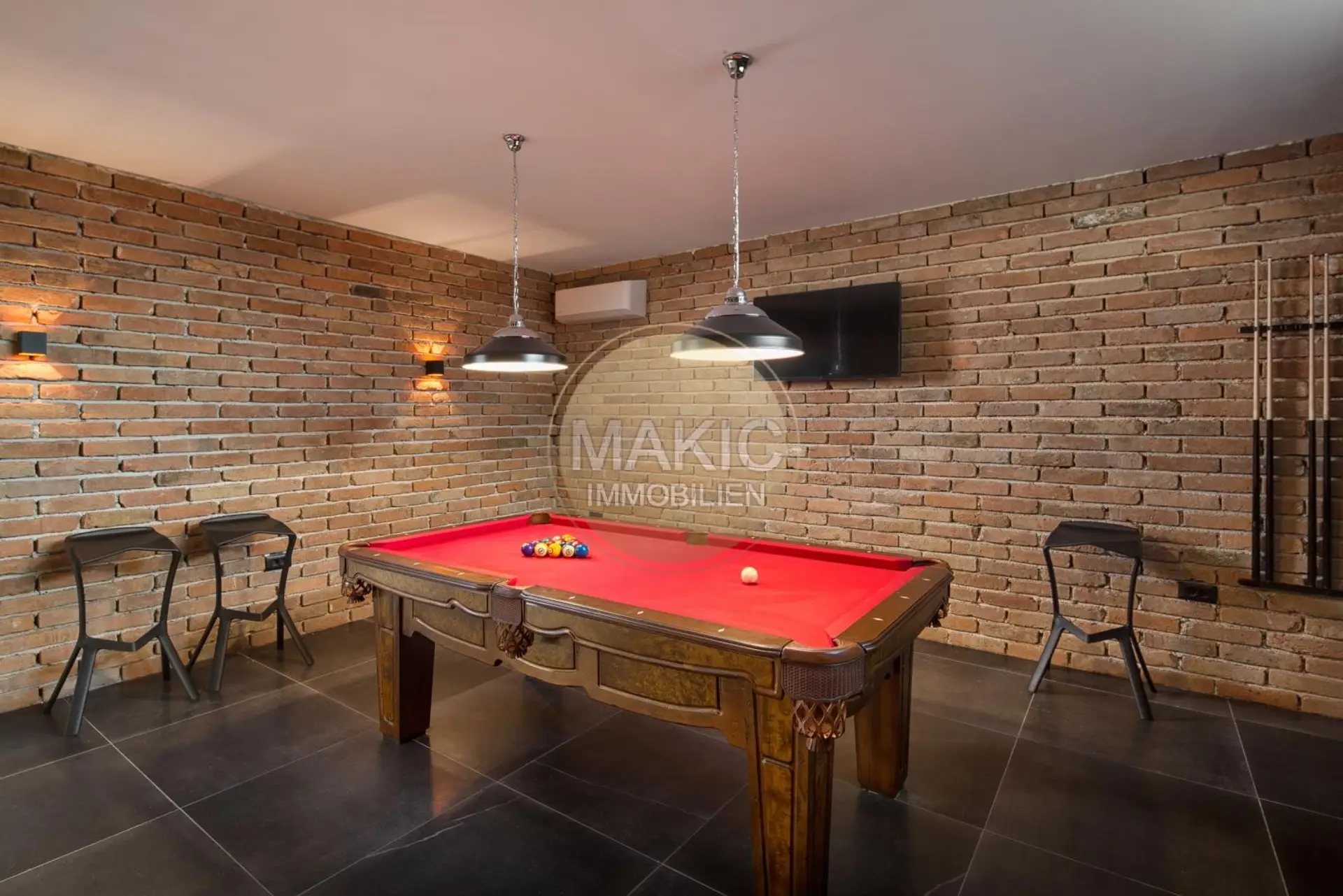 Im Untergeschoss befindet sich der Weinkeller, eine Taverne mit Kamin, ein Billardraum und eine Abstellkammer.