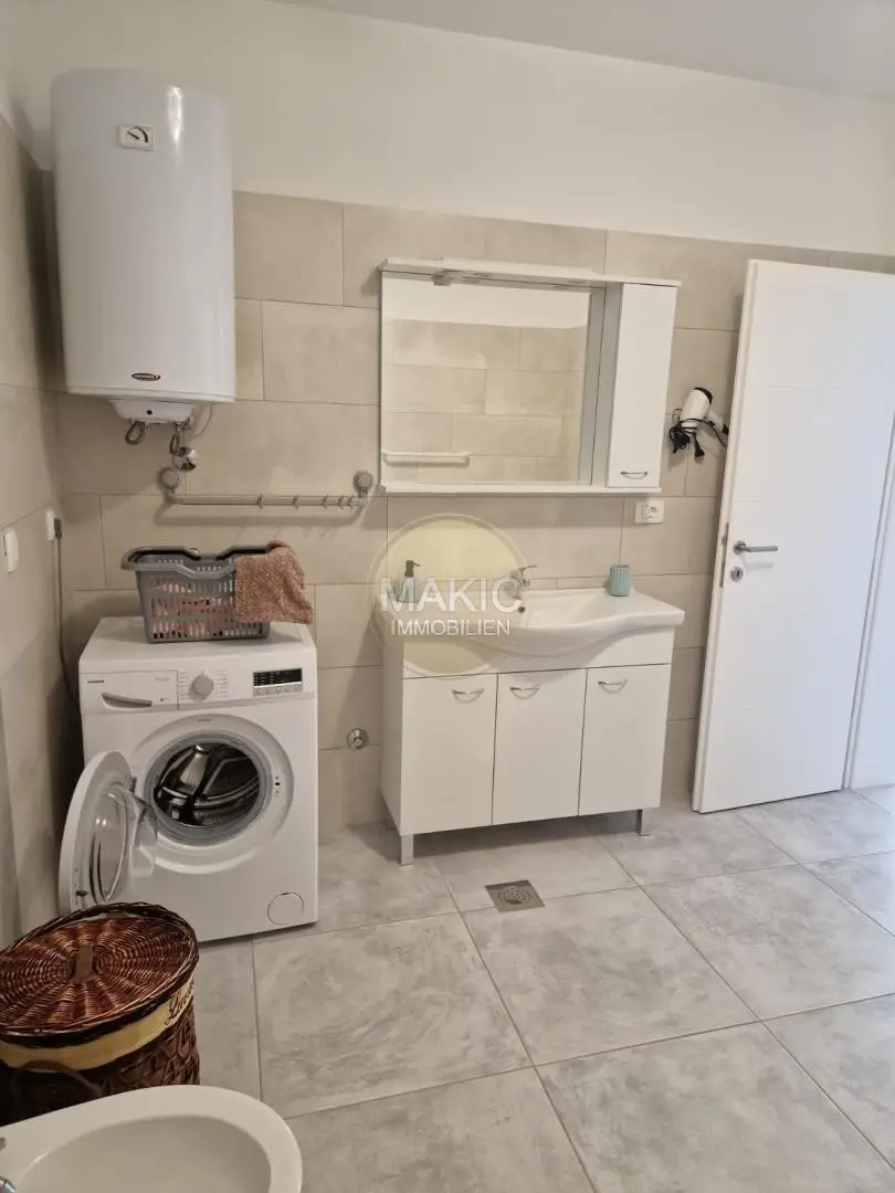 Wenn man das Haus den Flur hinunter betritt, befindet sich auf der linken Seite ein Badezimmer und ein kleineres Schlafzimmer, auf der rechten Seite des Flurs befinden sich zwei weitere Schlafzimmer und ein geräumiges Badezimmer mit einer großen Badewanne, während wir direkt den Flur hinunter zu einem geräumigen kommen Wohnzimmer mit einem Esszimmer und einer Küche, maßgefertigt mit Geräten und einem kleinen Abstellraum, das Wohnzimmer hat Zugang zu einem überdachten Balkon mit Blick auf den Pool von ca. 20m2, eine Sonnenterrasse, Grill, viel Grün und junge Oliven Bäume, die gerade gepflanzt wurden.