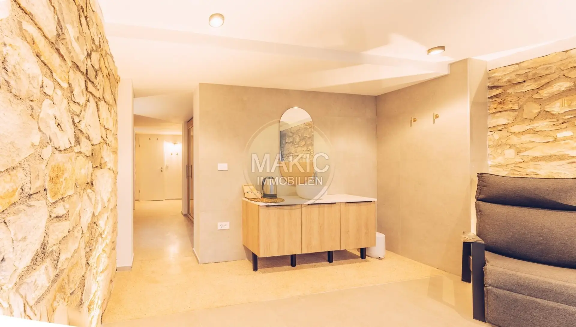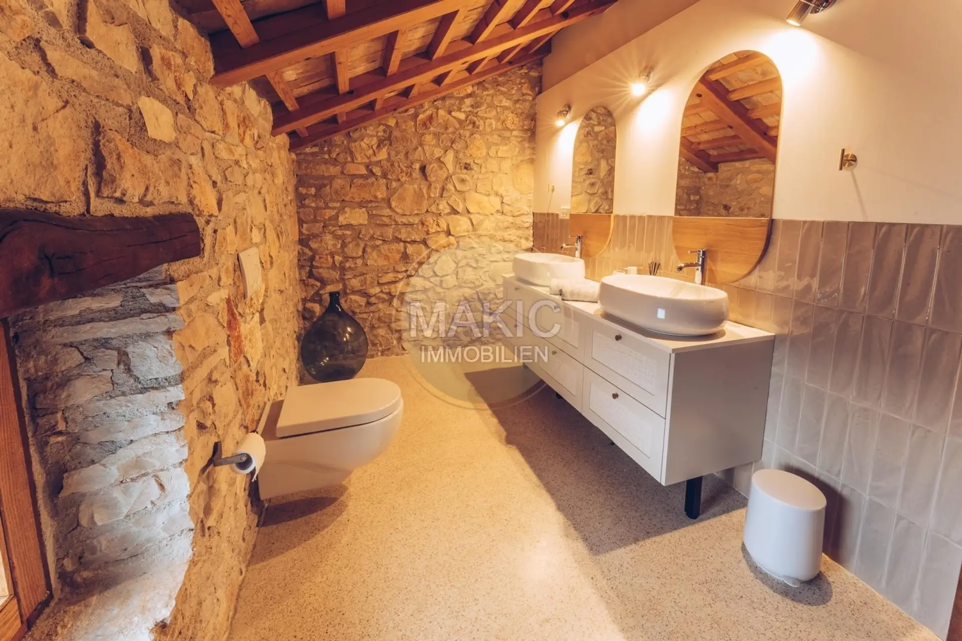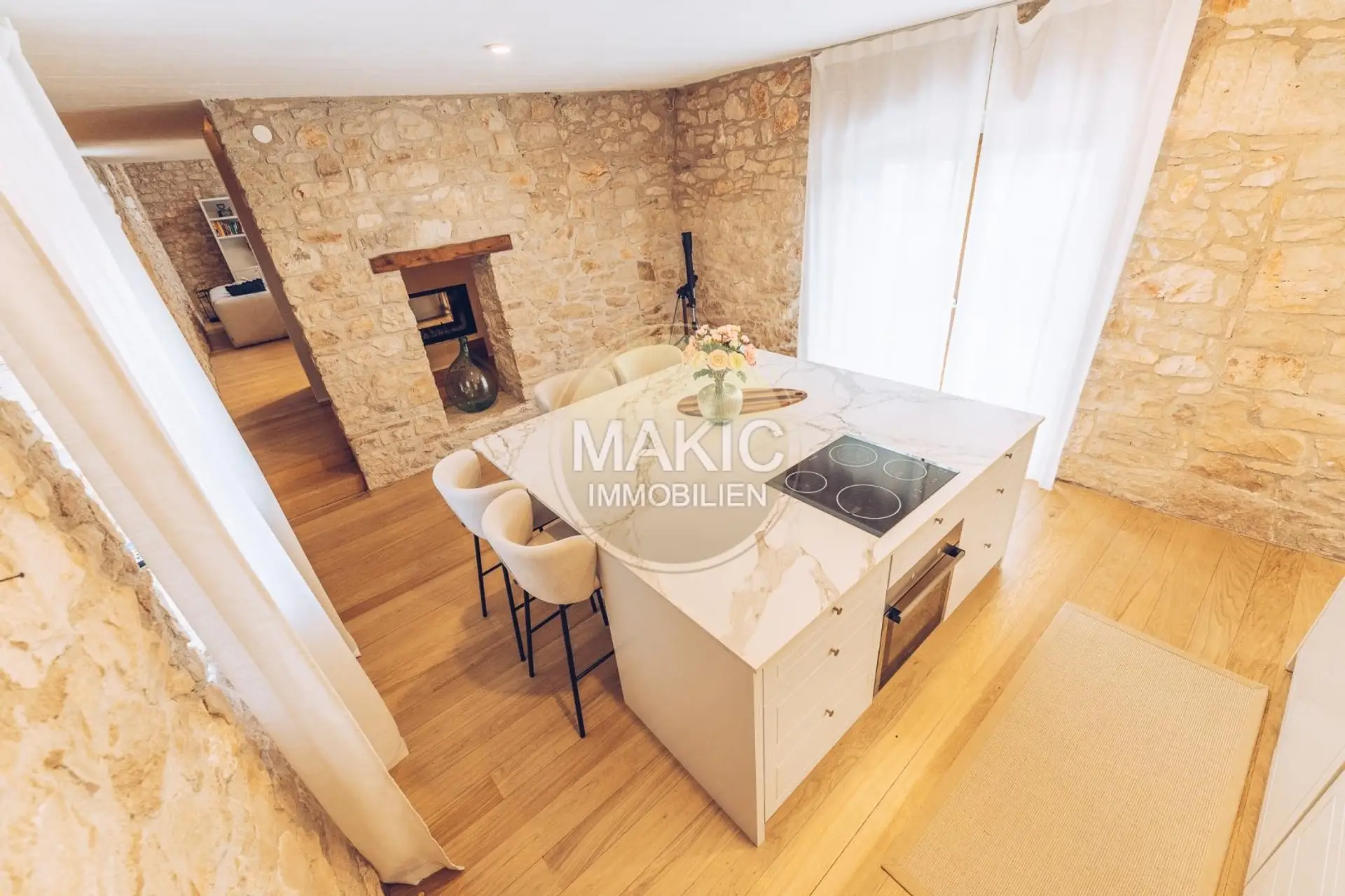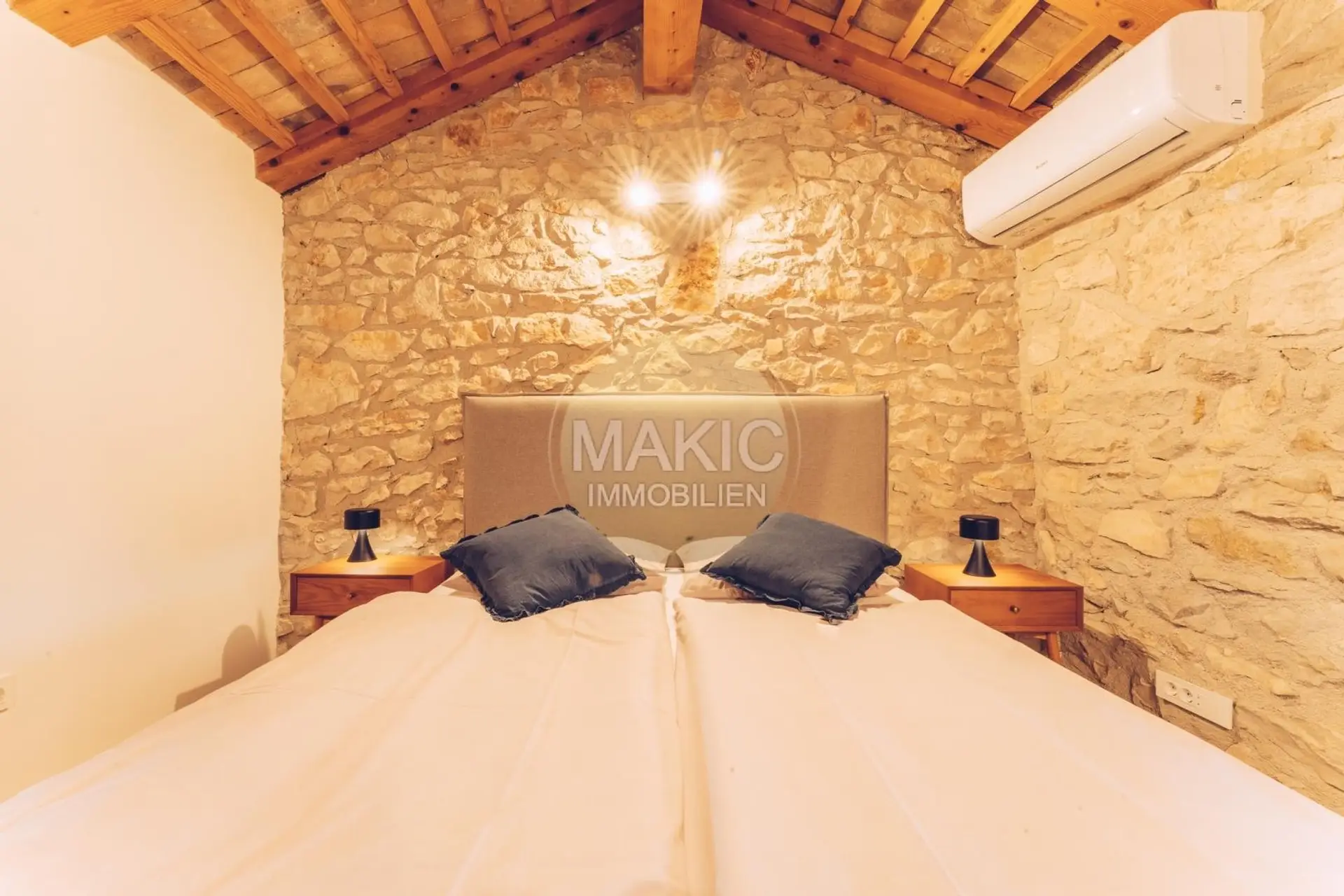 Die Renovierung dieser Villa erfolgte mit höchster Sorgfalt und Liebe zum Detail. Sie wurde komplett renoviert und geschmackvoll eingerichtet, wobei ein einzigartiger Mix aus einem traditionellen istrischen Steinhaus und moderner Funktionalität geschaffen wurde. Das Wohnzimmer ist mit einem Kamin ausgestattet, der nicht nur für Wärme sorgt, sondern auch eine gemütliche Atmosphäre schafft.