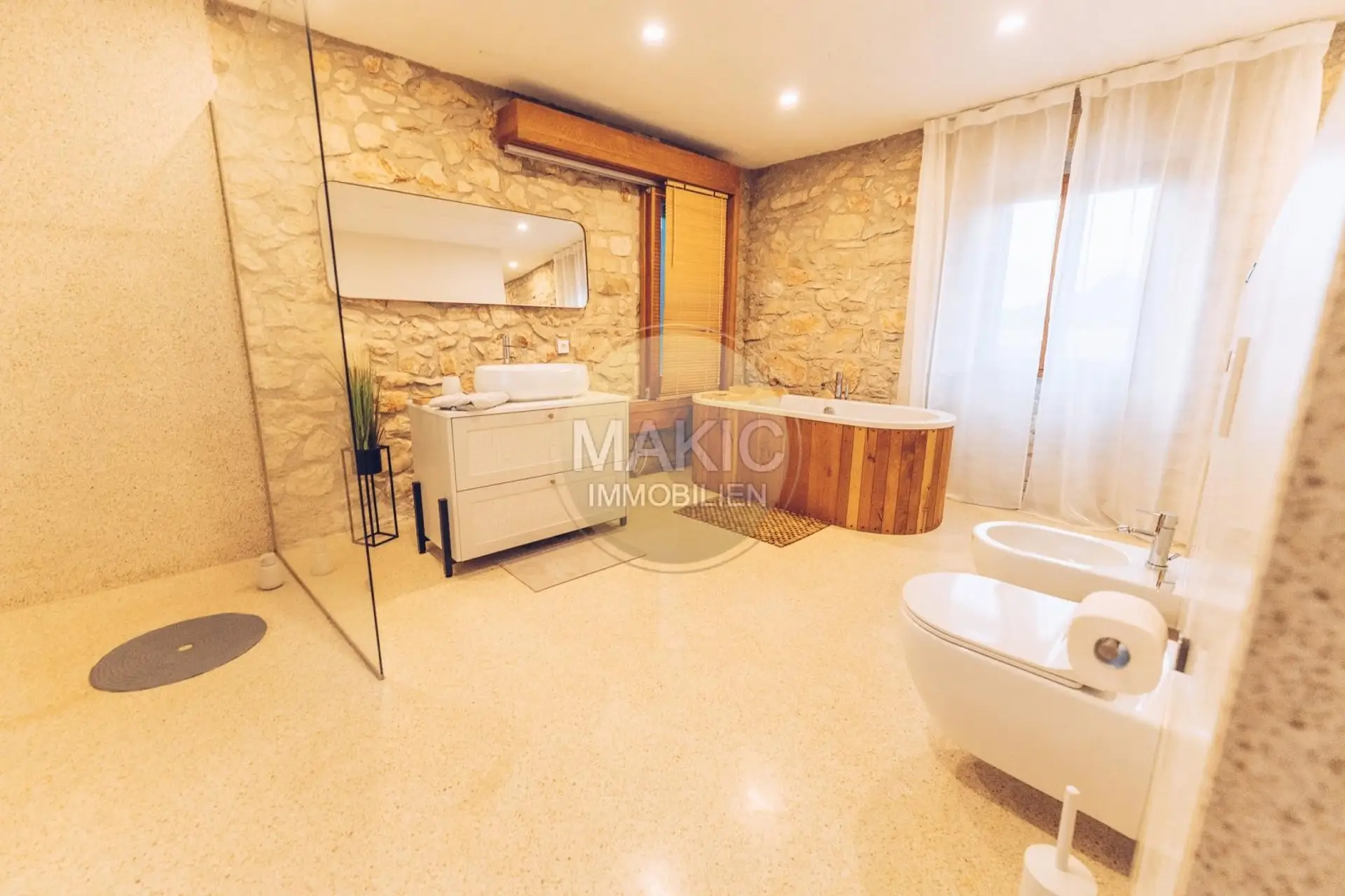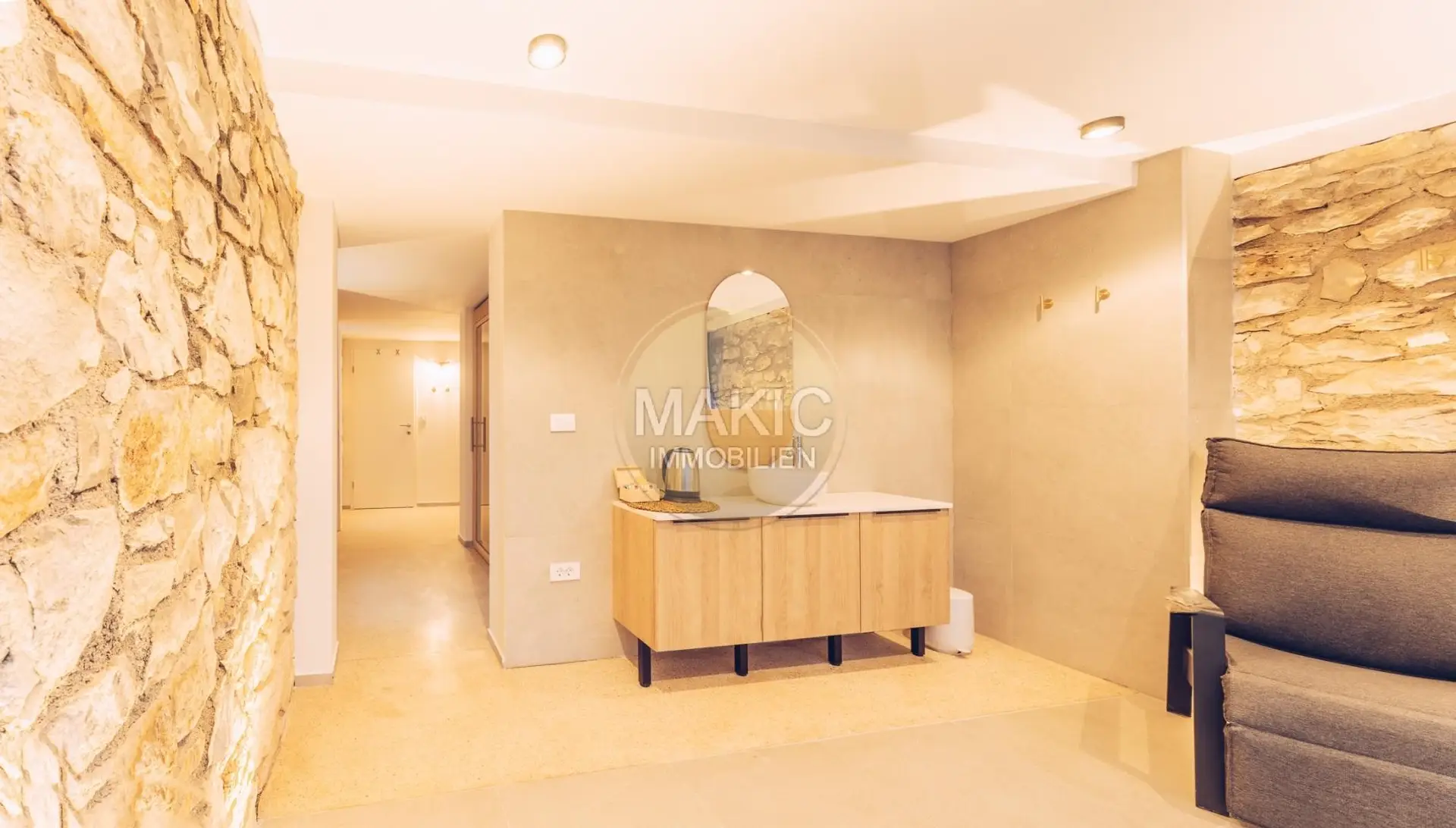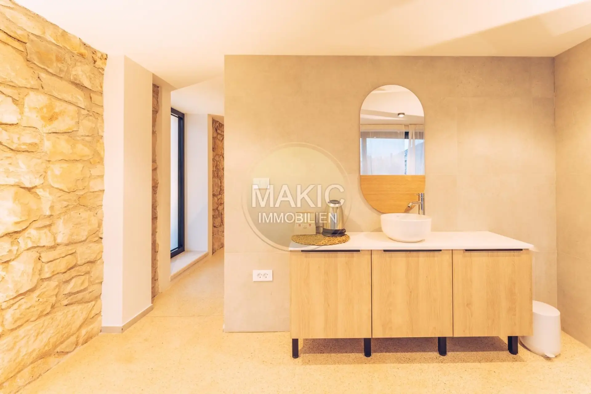 Die Renovierung dieser Villa erfolgte mit höchster Sorgfalt und Liebe zum Detail. Sie wurde komplett renoviert und geschmackvoll eingerichtet, wobei ein einzigartiger Mix aus einem traditionellen istrischen Steinhaus und moderner Funktionalität geschaffen wurde. Das Wohnzimmer ist mit einem Kamin ausgestattet, der nicht nur für Wärme sorgt, sondern auch eine gemütliche Atmosphäre schafft.