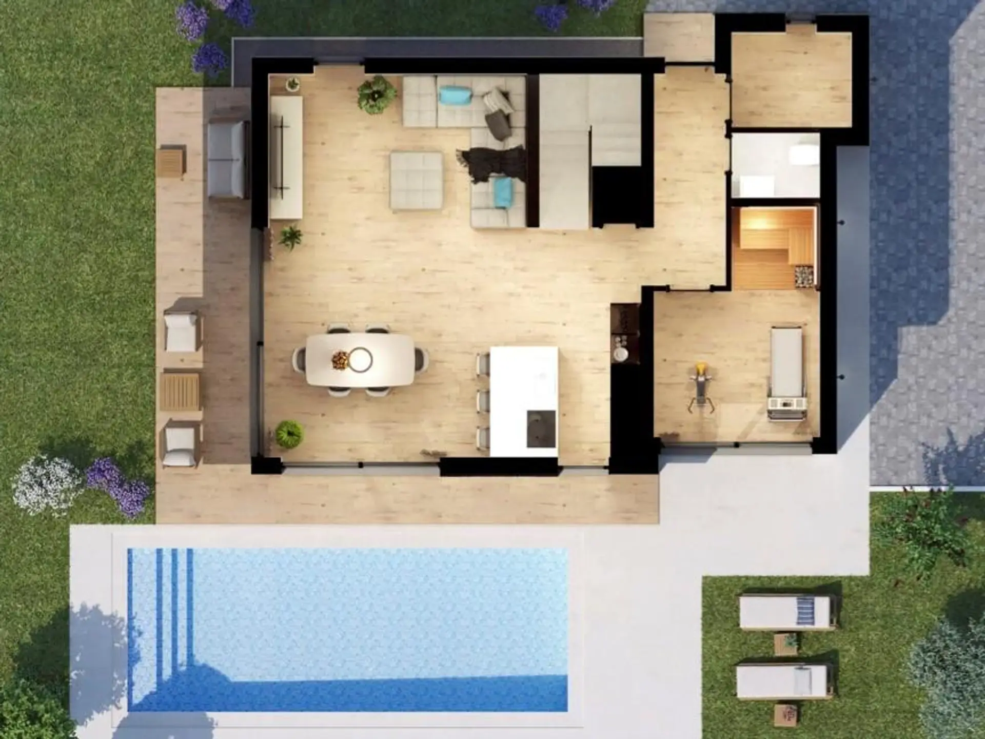 Das Erdgeschoss wird aus einem Technikraum, einem Abstellraum, einer Toilette, einem Wellnessbereich und einer Küche mit Esszimmer und einem offenen Wohnzimmer mit Zugang zu einer überdachten Terrasse mit Blick auf den Swimmingpool und den Garten bestehen.