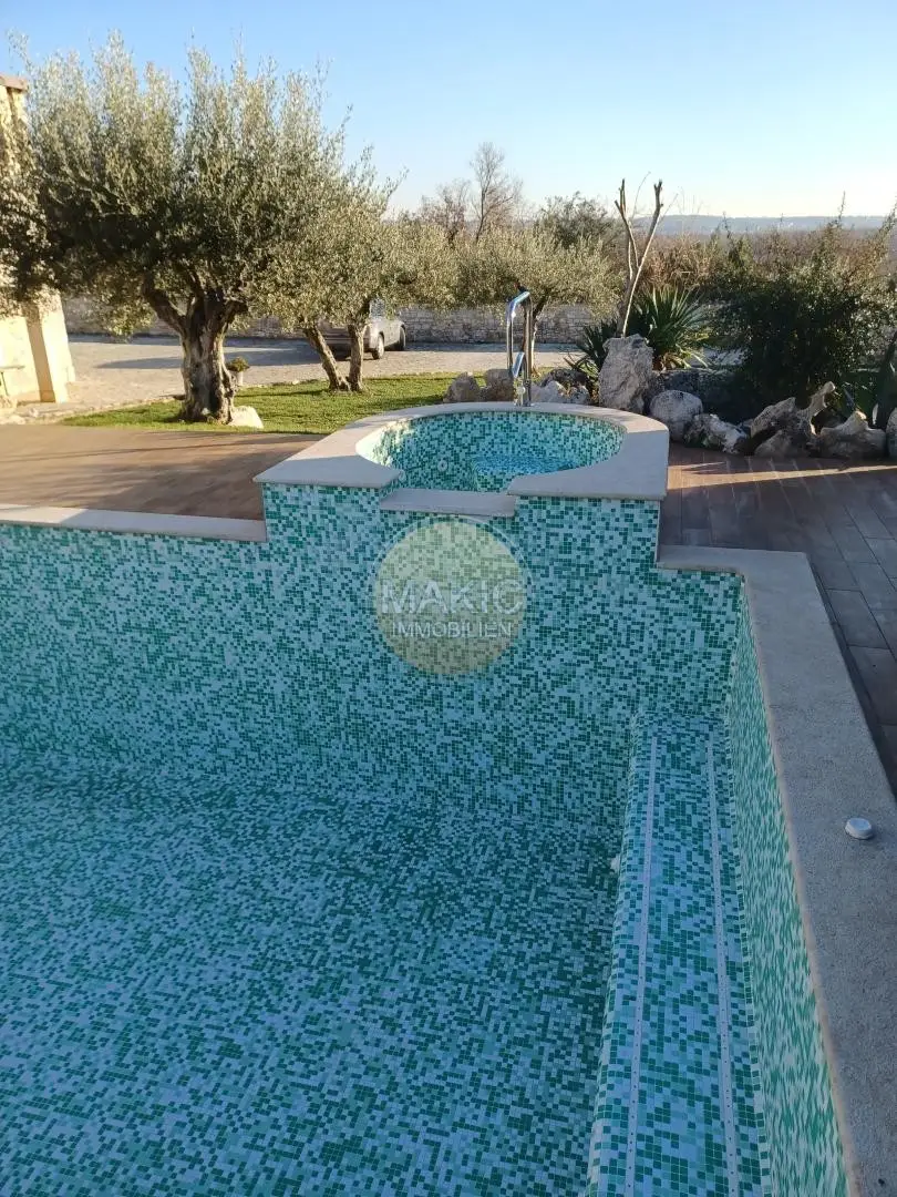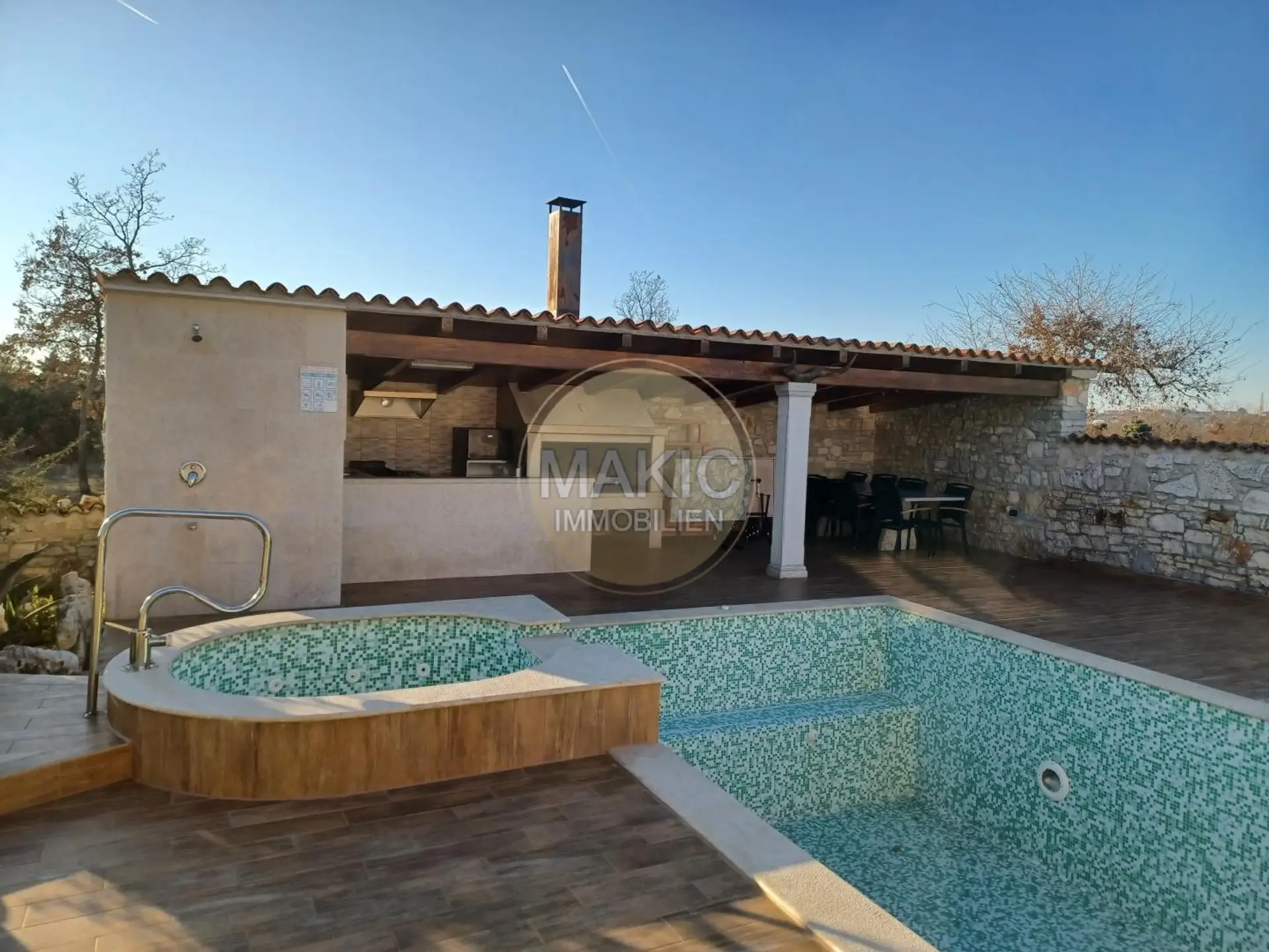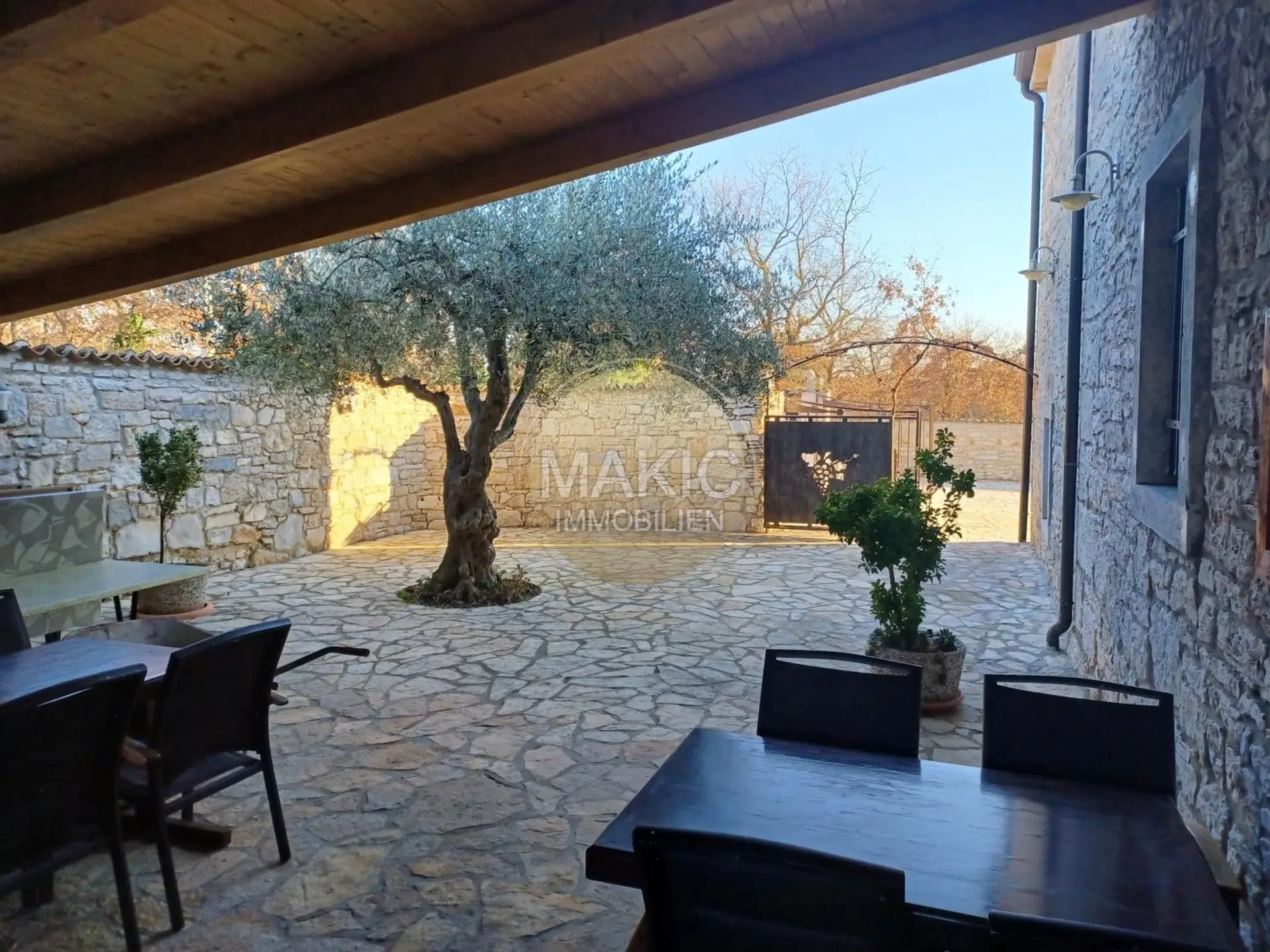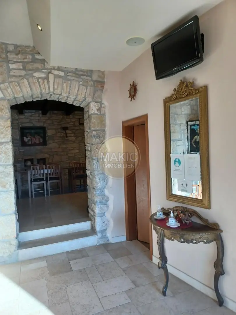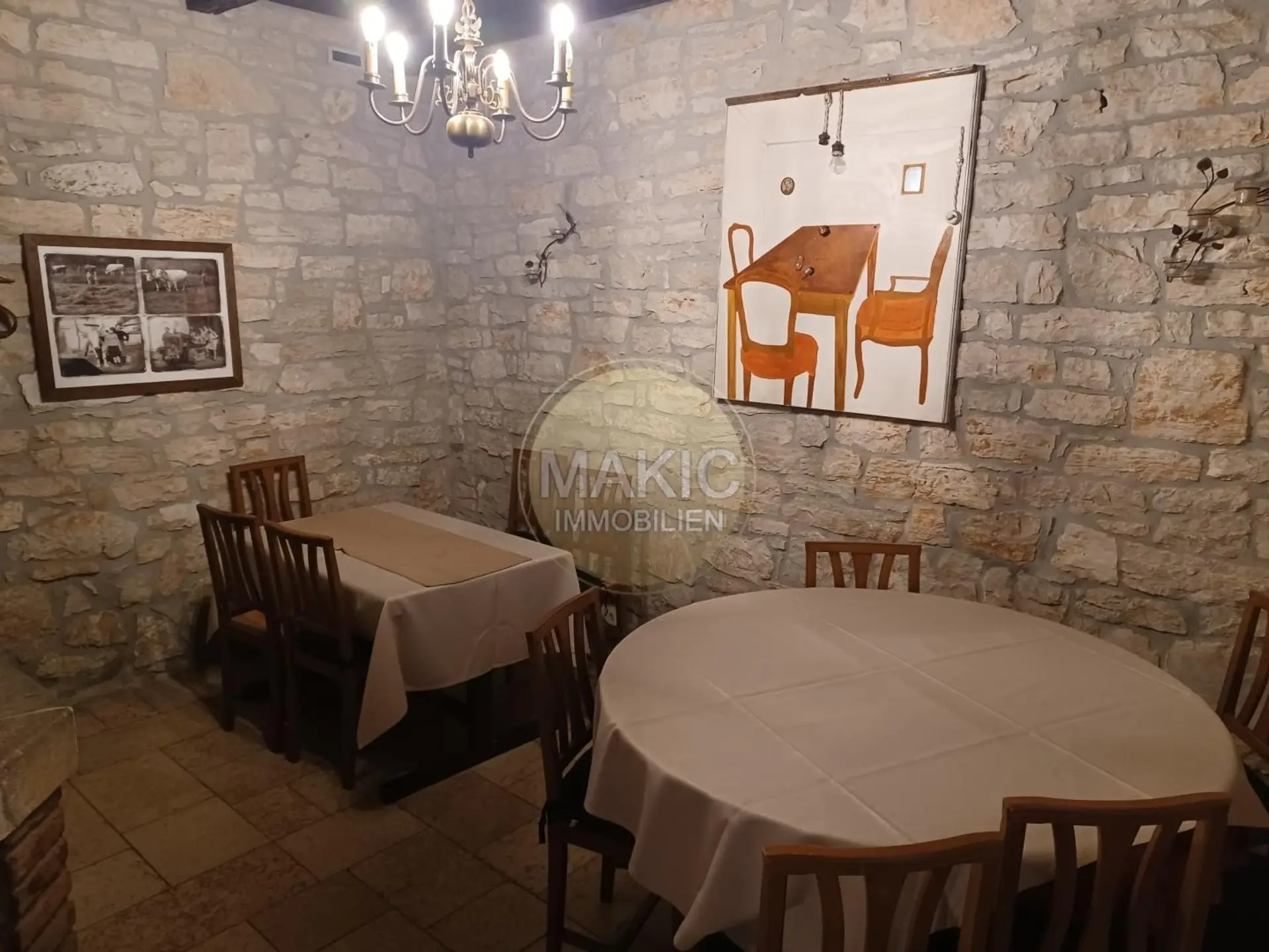 Das wunderschön und hochwertig renovierte Anwesen liegt direkt an einer nicht zu stark befahrenen Straße und besteht aus einer ca. 170 m² großen Konoba mit ca. 60 Sitzplätzen innen und 60 Sitzplätzen auf einer überdachten Terrasse. Der eigene Hof verfügt über ausreichend PKW-Abstellmöglichkeiten. Eine voll ausgestattete Restaurantküche mit allen Geräten, Heißluftöfen, Kühlgeräten, Spüle, Lagerräumen, Keller und Umkleiden ist genauso vorhanden wie eine einladende Bar, ein beidseitig beheizbarer istrischer Kamin und eine Fußbodenheizung in den Gasträumen. Auf der Terrasse kann zusätzlich in einem Holzofen aromatische Pizza zubereitet werden.