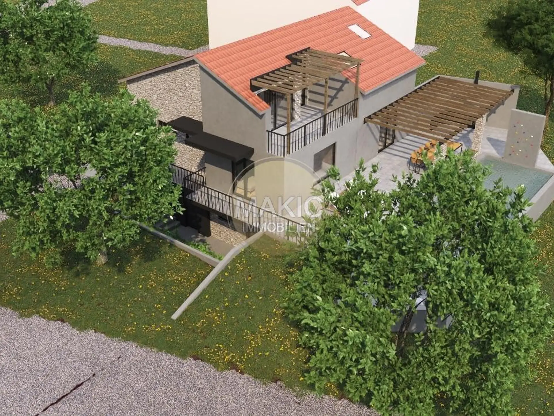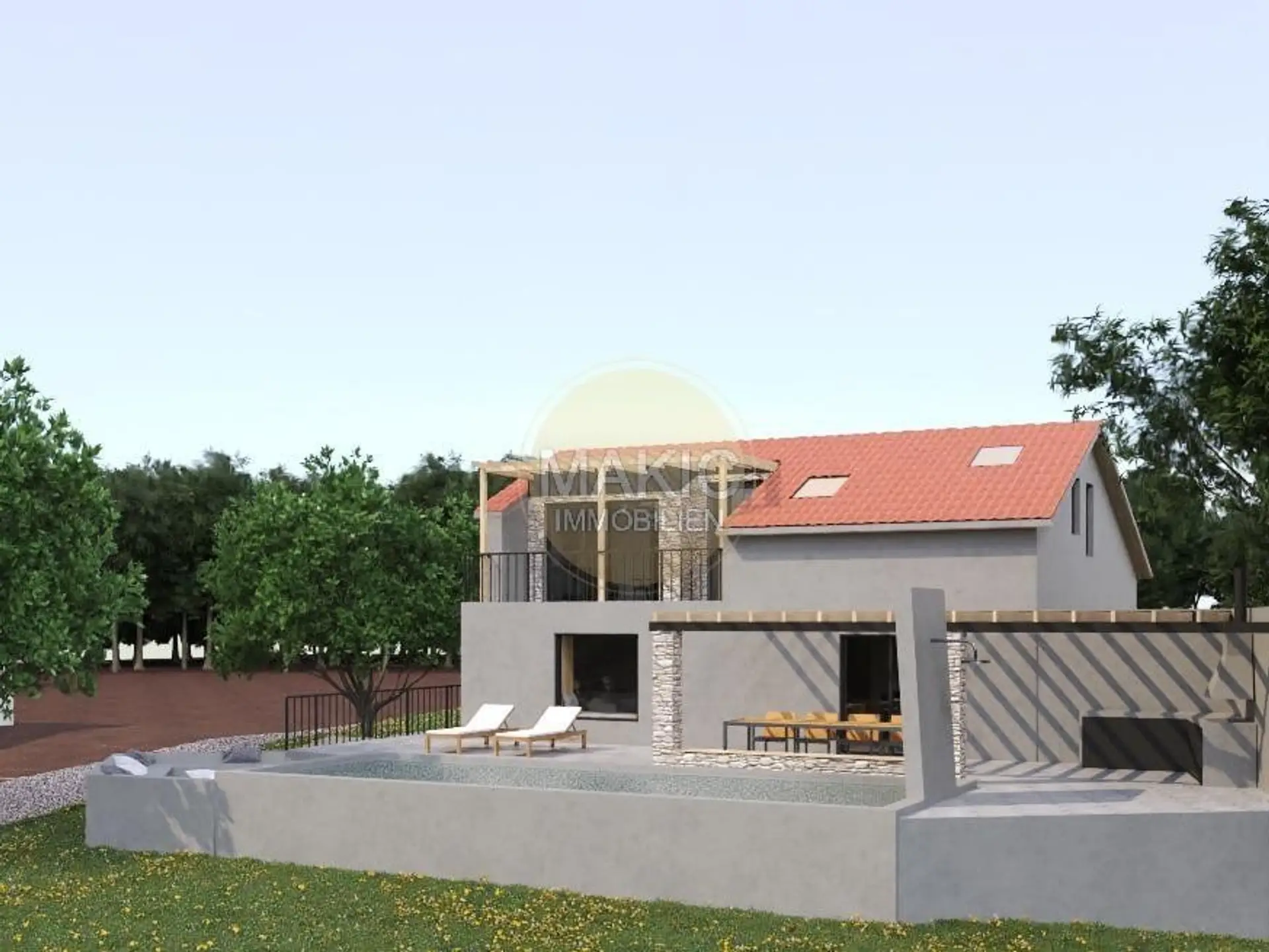 Auf der rechten Seite des Flurs befinden sich drei Treppen, die zu einem großzügigen offenen Raum führen. Dieser Raum ist eine Kombination aus einer modernen Küche, einem geräumigen Esszimmer und einem komfortablen Wohnzimmer. Hier können Sie kulinarische Kreationen genießen und die Familie zu gemeinsamen Mahlzeiten versammeln. Vom Wohnzimmer aus haben Sie direkten Zugang zur Terrasse mit wunderschönem Blick auf Ihren eigenen Pool von ca. 30 m2 und ein Sonnendeck. Der Pool ist so konzipiert, dass er alle Ihre Bedürfnisse erfüllt – er verfügt über einen flachen Teil für Kinder und einen tieferen Teil zum Schwimmen. Hier können Sie erfrischende Momente und Spaß im Freien genießen.