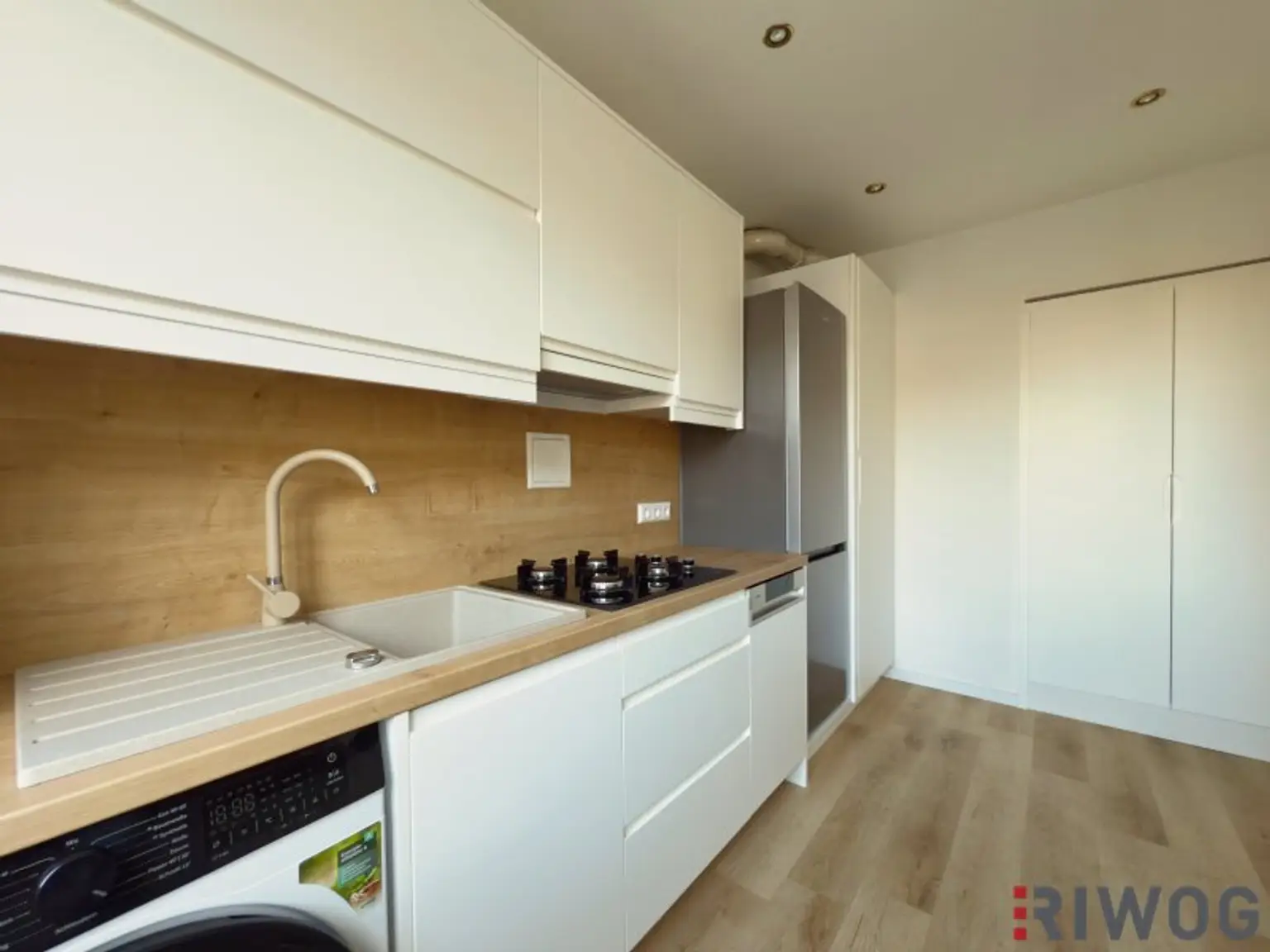 * eine hochwertige Einbauküche mit Markengeräten (Gorenje/Beko) wie z. B. eine Gefrierkombination, Backrohr, Mikrowelle, Gas-Herd sowie eine Waschmaschine
