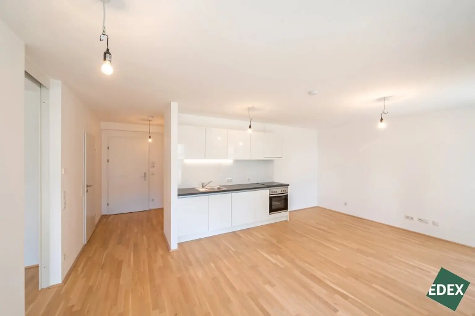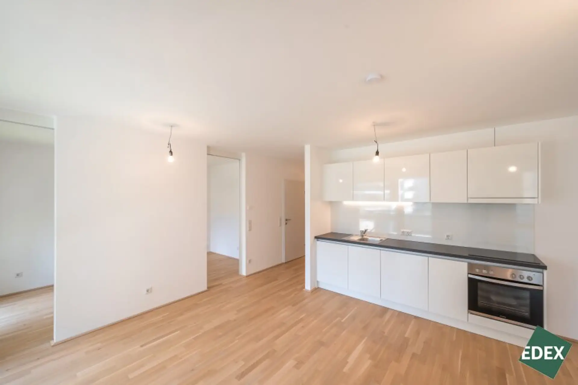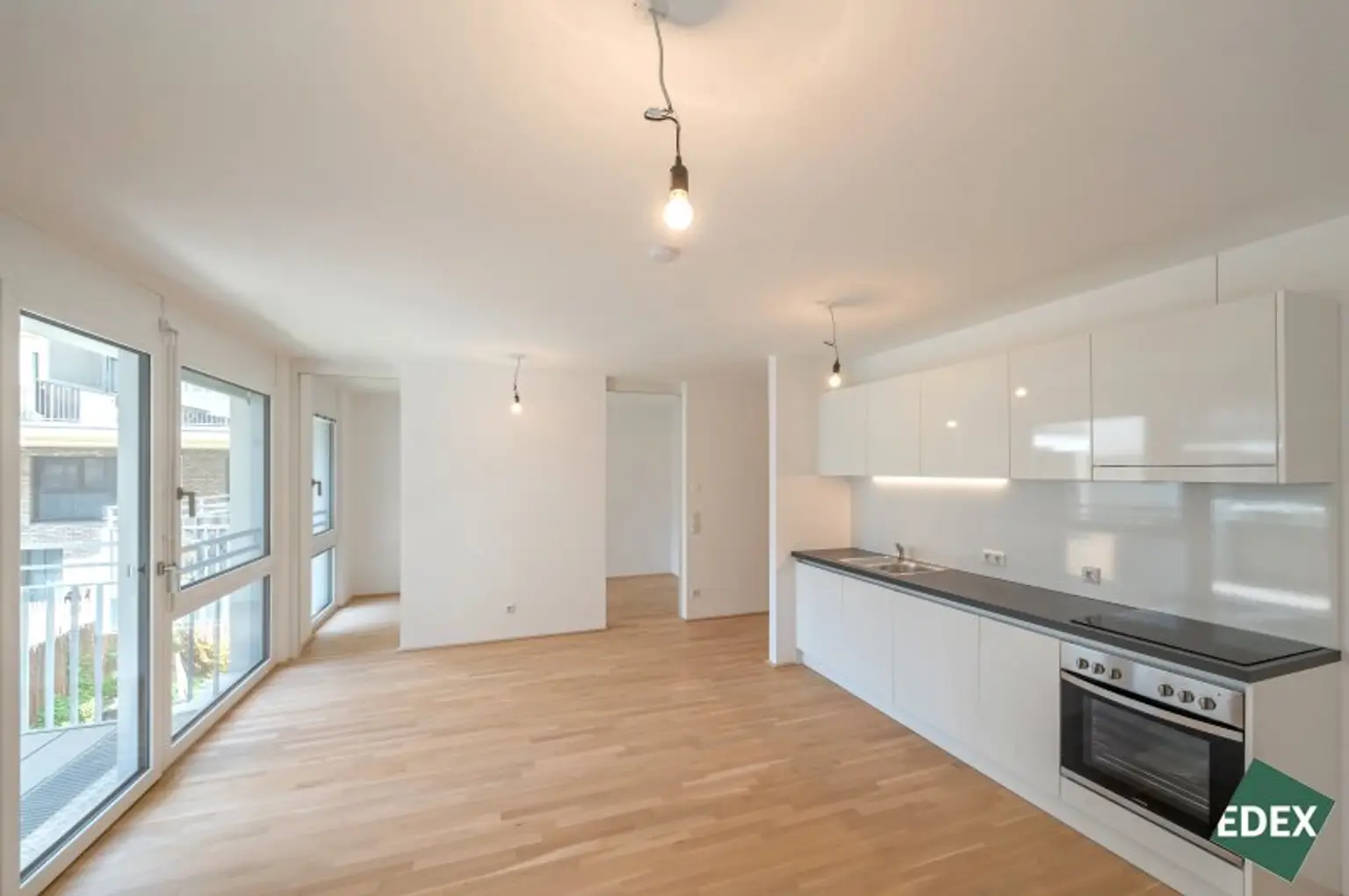Zur Vermietung gelangt eine 2-Zimmer Wohnung in idyllischer und urbaner Atmosphäre. Die lichtdurchflutete Wohnung verfügt über einen Vorraum, einen Abstellraum, eine separate Toilette, ein modernes Badezimmer mit Badewanne und Waschmaschinenanschluss, einen großzügigen Wohnbereich mit einer modernen, offenen Küche mit Zugang zu einem schönen Balkon sowie über ein Schlafzimmer. Die 3-fach-verglasten Fenster sind mit einem hochwertigen Sonnenschutz ausgestattet. Die Wohnräume sind mit schönem Parkettboden ausgestattet und die Nassräume mit Fliesen verlegt. Weiters verfügt die Wohnung über ein Kellerabteil. Im Haus befinden sich Kinderwagen- und Fahrradabstellräume.