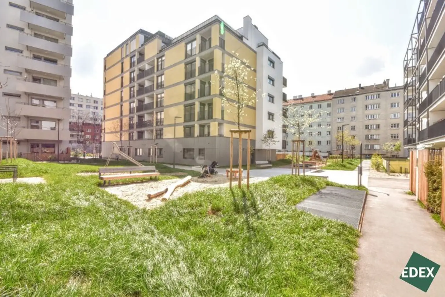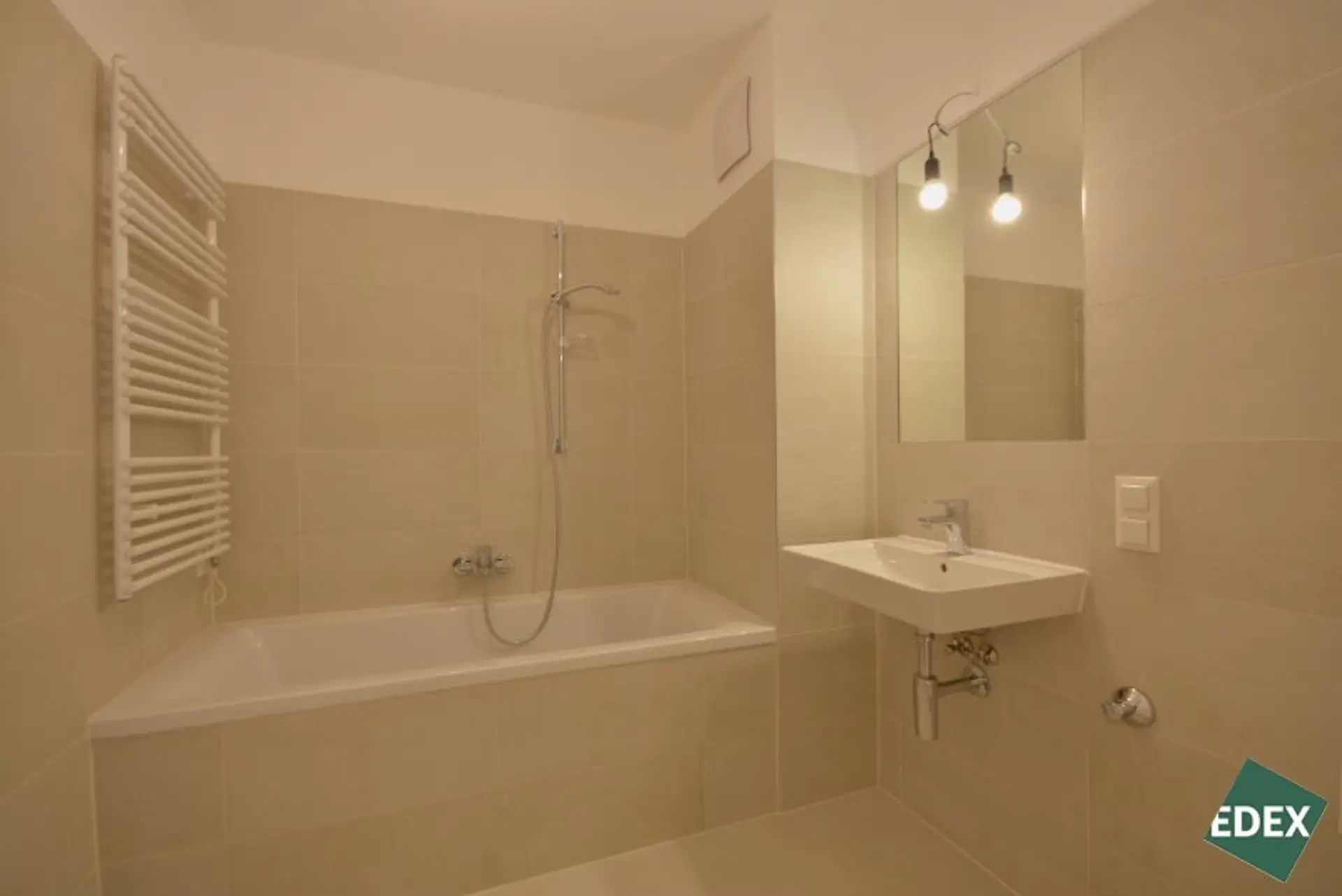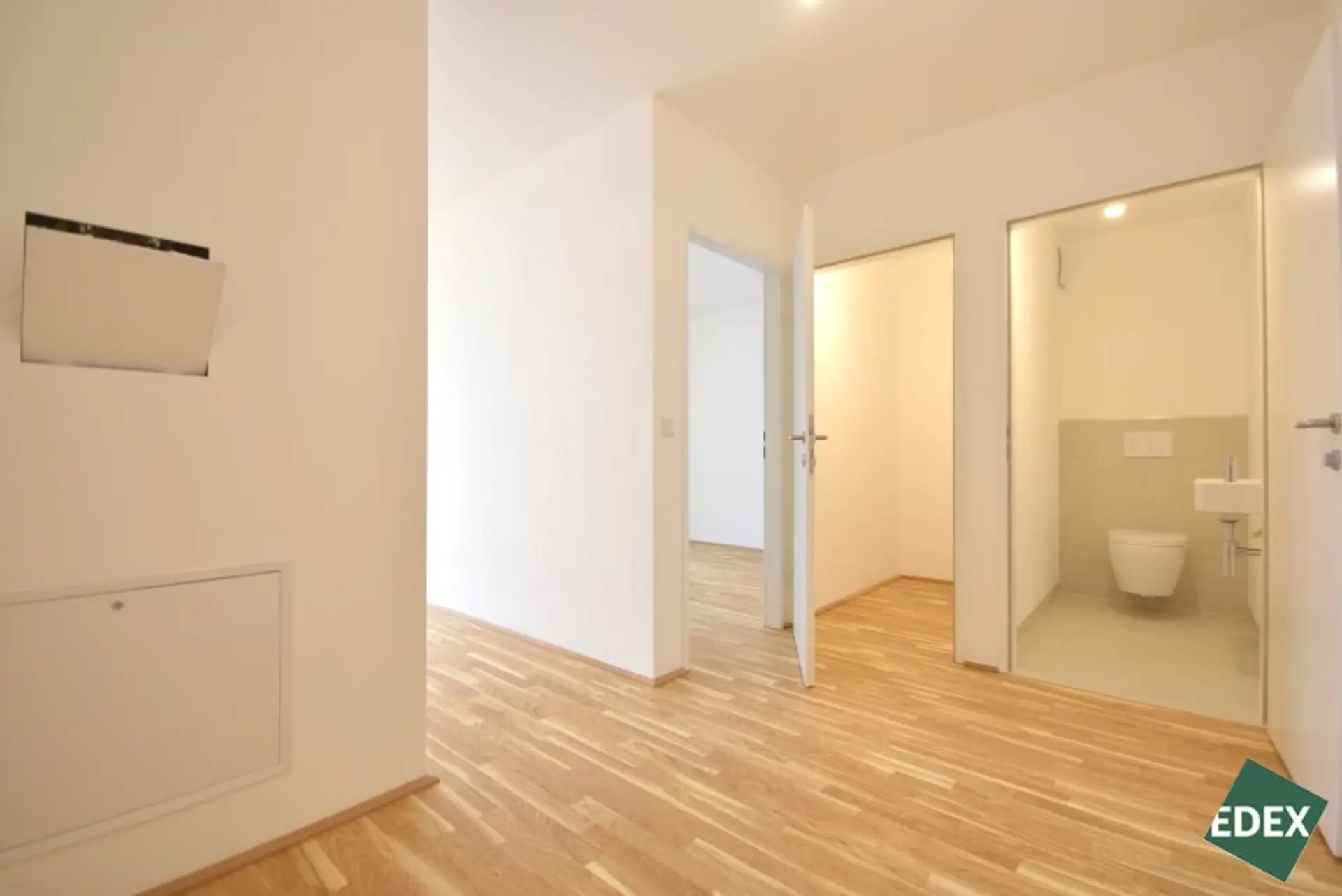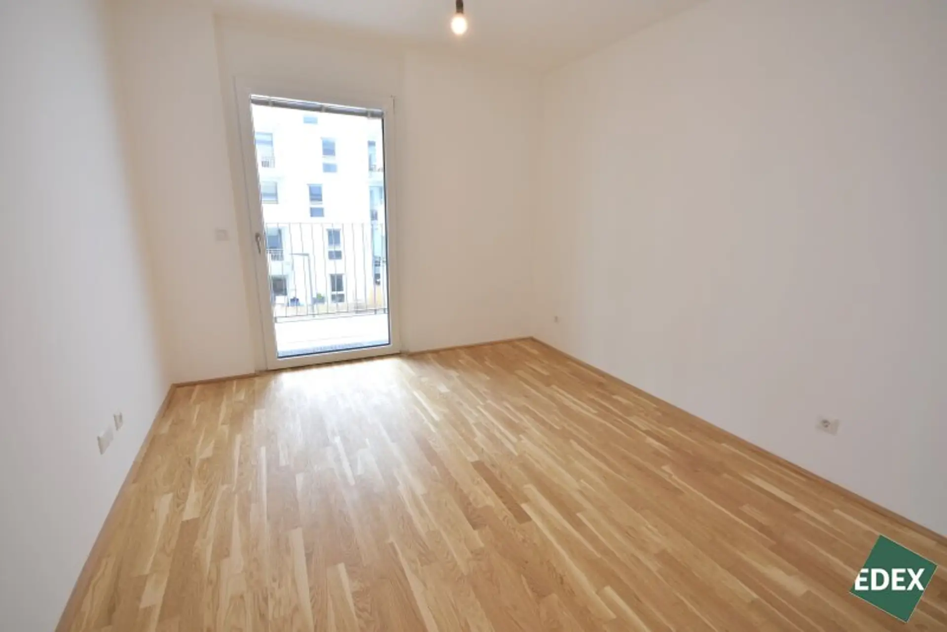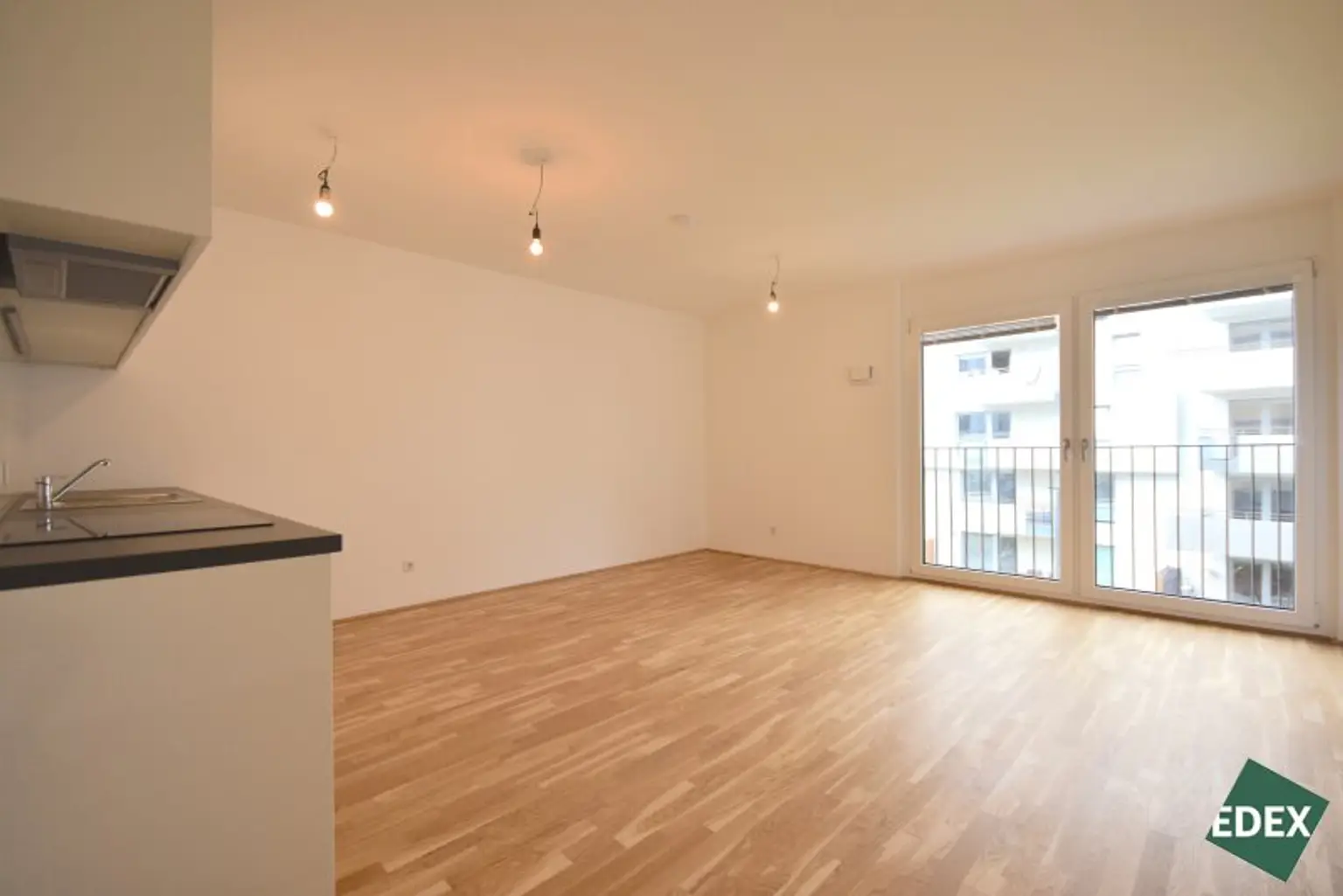 Zur Vermietung gelangt eine 2-Zimmer Wohnung in idyllischer und urbaner Atmosphäre. Die lichtdurchflutete Wohnung verfügt über einen Vorraum, einen Abstellraum, eine separate Toilette, ein modernes Badezimmer mit Badewanne und Waschmaschinenanschluss, einen großzügigen Wohnbereich mit einer modernen, offenen Küche sowie über ein Schlafzimmer. Die schöne Loggia ist sowohl über das Wohnzimmer, als auch über das Schlafzimmer begehbar. Die 3-fach-verglasten Fenster sind mit einem hochwertigen Sonnenschutz ausgestattet. Die Wohnräume sind mit schönem Parkettboden ausgestattet und die Nassräume mit Fliesen verlegt. Weiters verfügt die Wohnung über ein Kellerabteil. Im Haus befinden sich Kinderwagen- und Fahrradabstellräume.