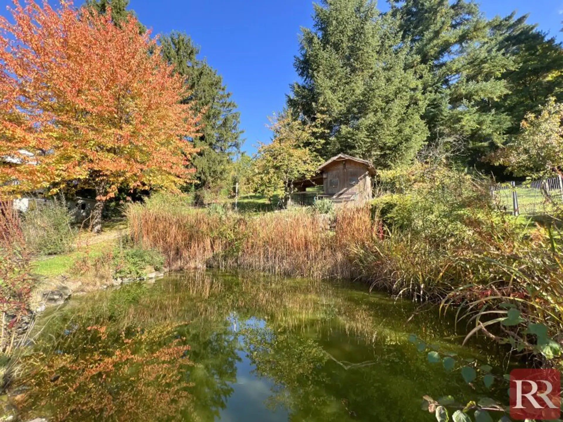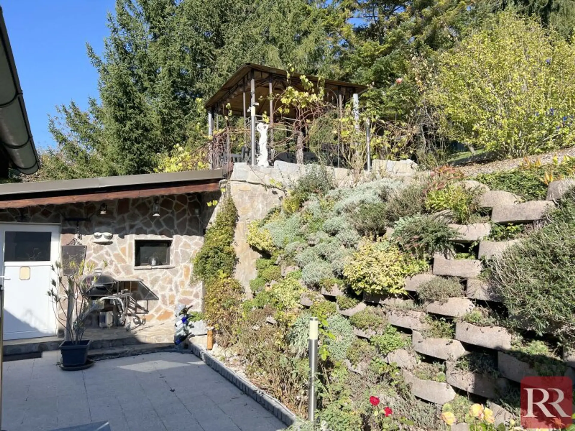 Rund um das Haus befinden sich umfangreiche betonierte und verflieste Außenflächen. An die große gartenseitige Terrasse schließen ein Pool, ein Saunahäuschen mit Dusche sowie ein weiteres Häuschen mit erdversenktem Weinkeller an. Im Garten finden sich ein kleiner Teich mit Wasserzulauf (Pumpe) sowie mehrere Schuppen als Holzlager und Geräteabstellräume.