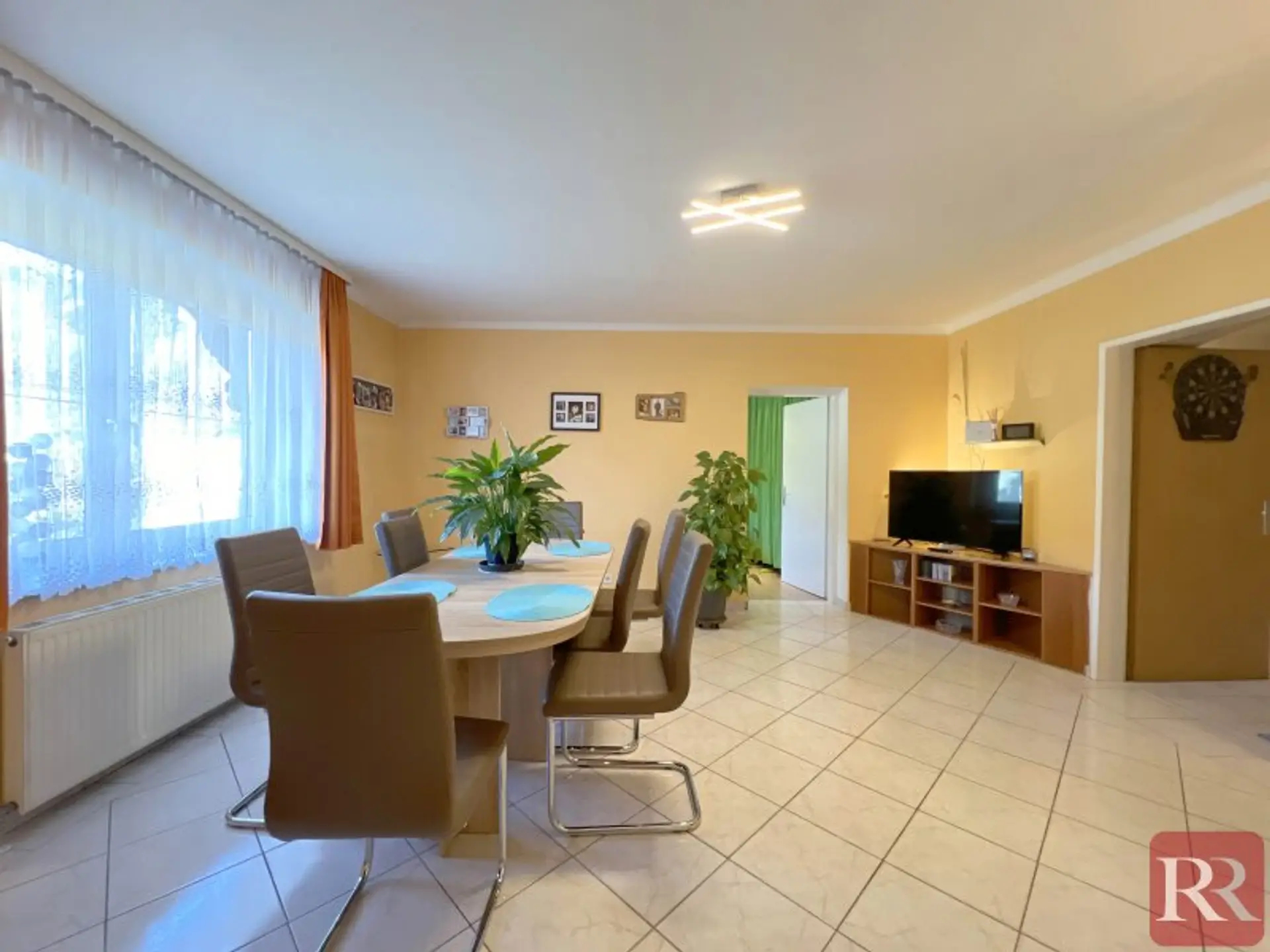 Erdgeschoß (Eingang gartenseitig bei der großen Terrasse): Vorraum mit Zugang zum Stiegenhaus, Küche und Wohnzimmer mit Balkon. Das Wohnzimmer führt in zwei weitere Zimmer. Ein Wintergarten ist direkt von der Terrasse zugängig.