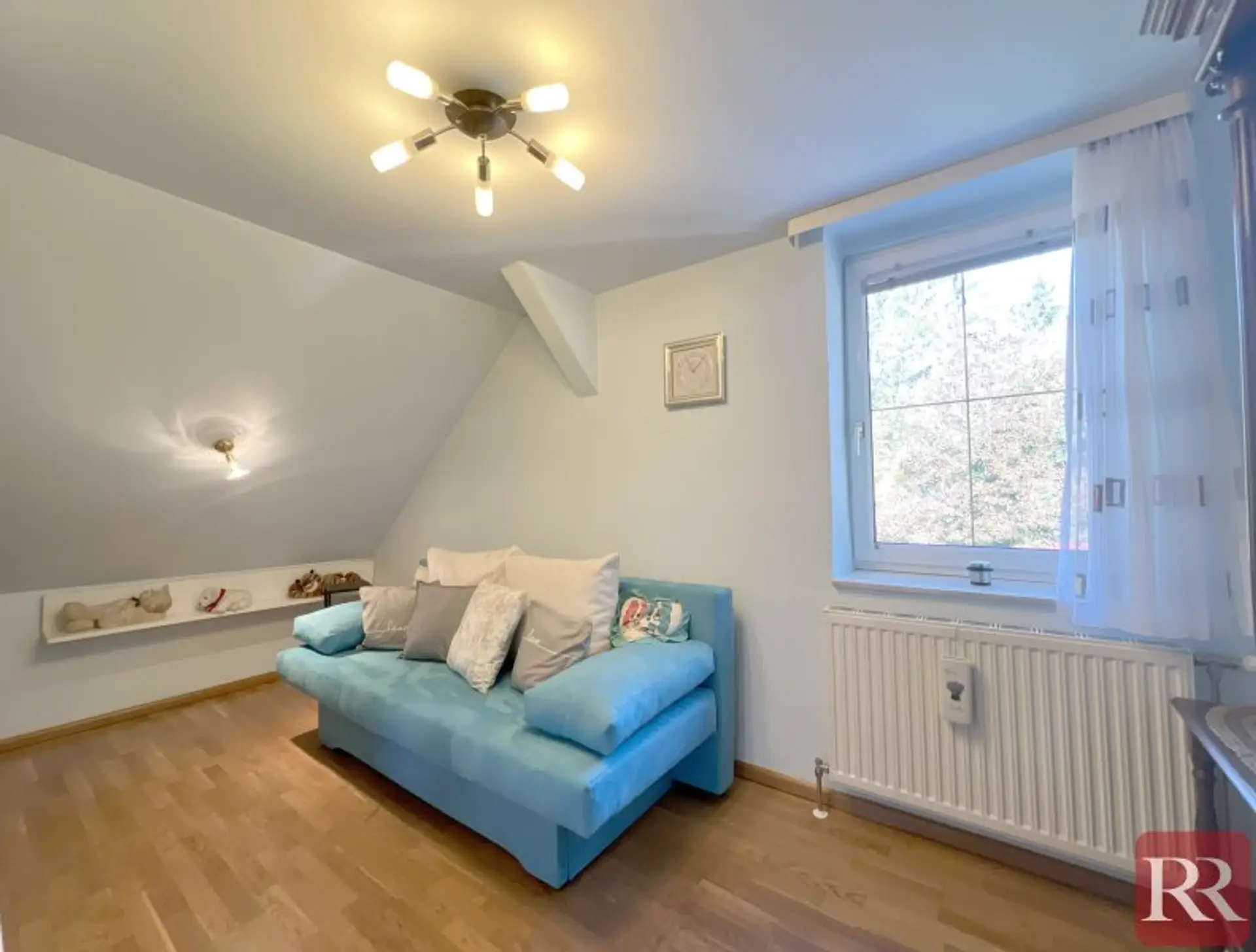 Obergeschoß: Ein weiterer Wohnbereich, drei unterschiedlich große (Schlaf-)Zimmer sowie ein Badezimmer.