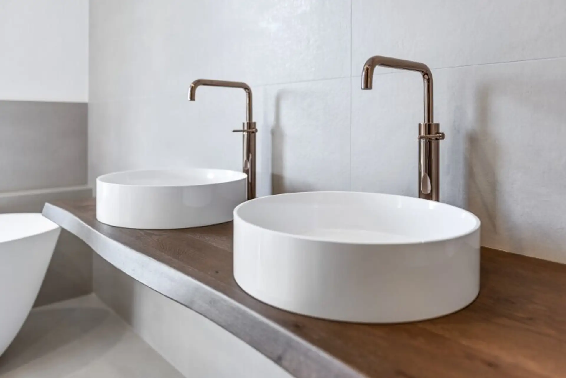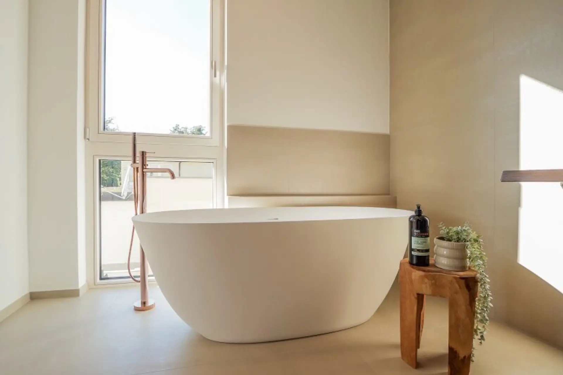 Die Bäder sind mit burgbad-Waschbecken und Waschtischplatten ausgestattet. Burgbad ist seit 2016 klimaneutral und trägt renommierte Nachhaltigkeitssiegel wie Blauer Engel und EcoVadis Bronze. Mineralguss-Waschbecken bestehen zu rund 80 % aus natürlichen Rohstoffen. Der innovative CleanFlow-Siphon reduziert Wasserverbrauch, Materialeinsatz und Reinigungsmittel – ein perfektes Zusammenspiel von Design, Hygiene und Nachhaltigkeit.
