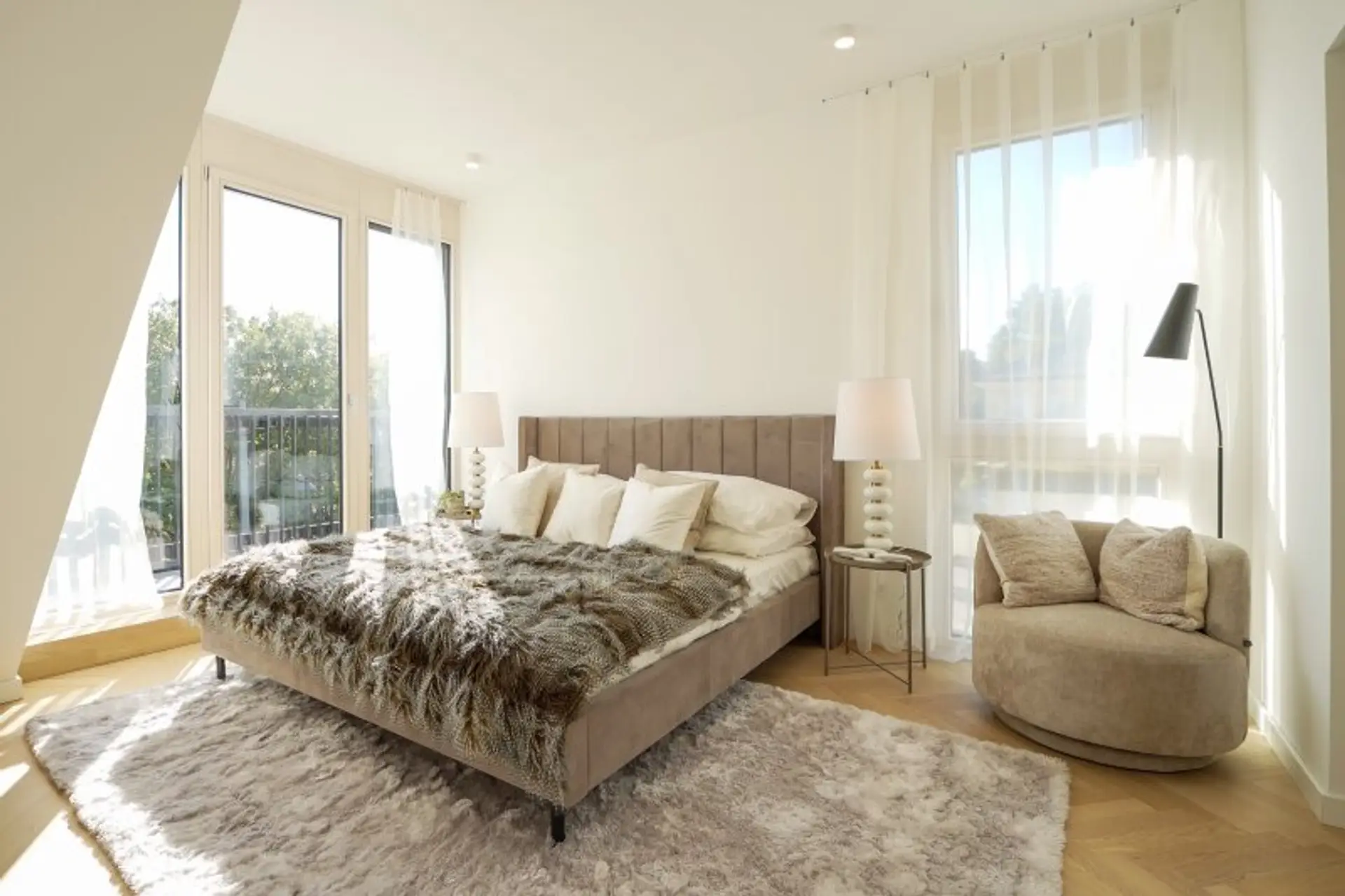 Nicht weniger spektakulär und vor allem ideal aufgeteilt ist der Master-Bedroom des Penthouses, welcher rund 30 m² umfasst und nicht nur über ein Tageslicht-Badezimmer mit Dusche, Wanne, WC und Doppelwaschbecken sowie eine begehbare Garderobe verfügt, sondern auch über eine kleine, süd/ost-seitige Terrasse mit Wien-Blick. Durch die herrliche Raumhöhe von 2,85 m wirken die einzelnen Bereiche offen und luftig und bieten für hohe Einbauschränke tolle Staumöglichkeiten um auch für umfangreichere Garderobe geeignet zu sein.