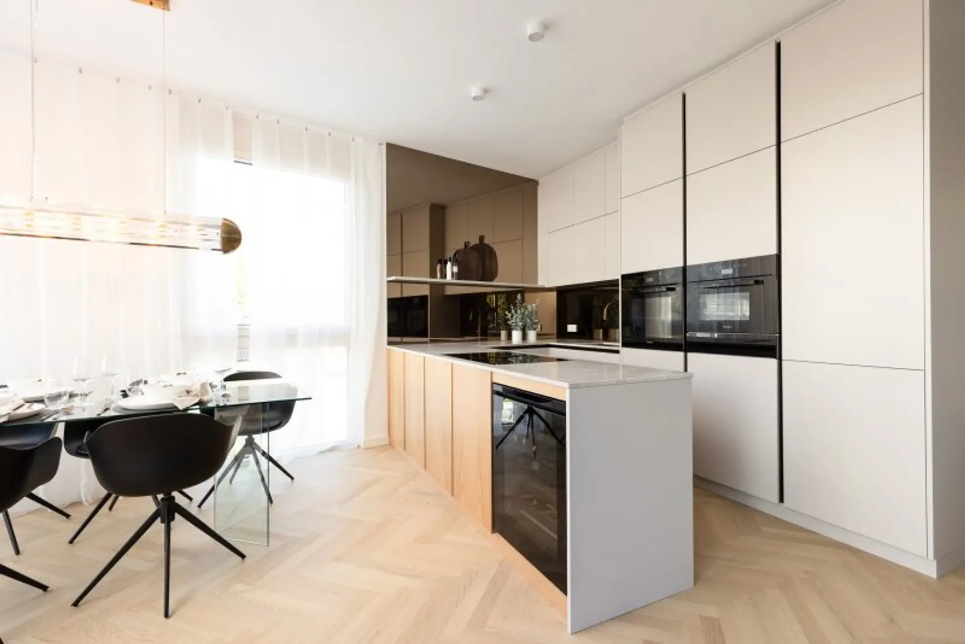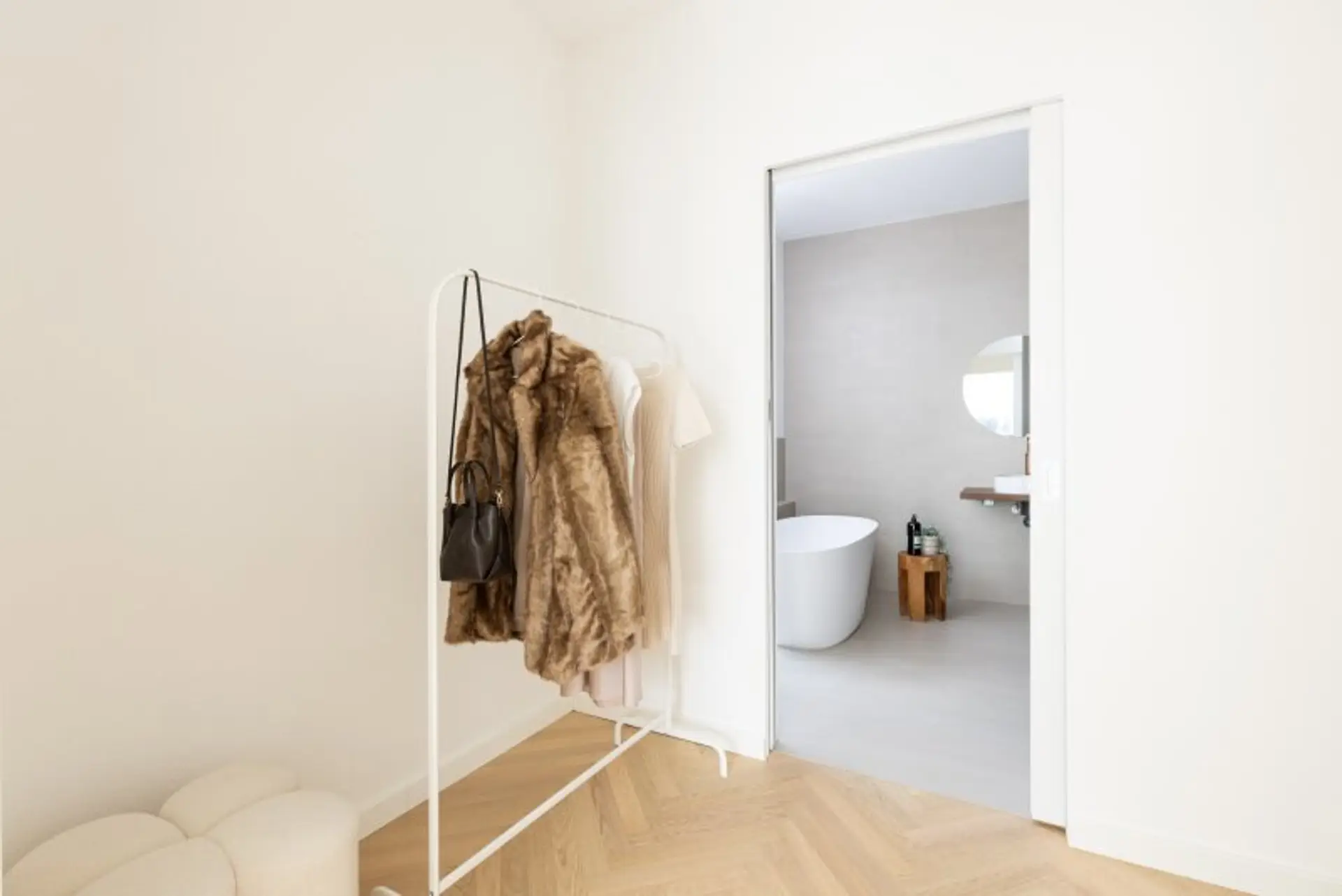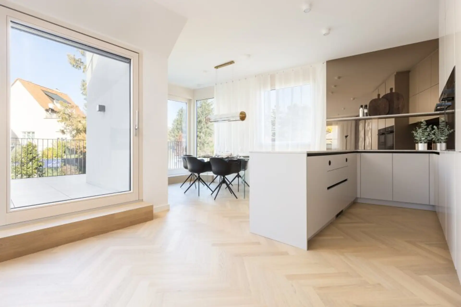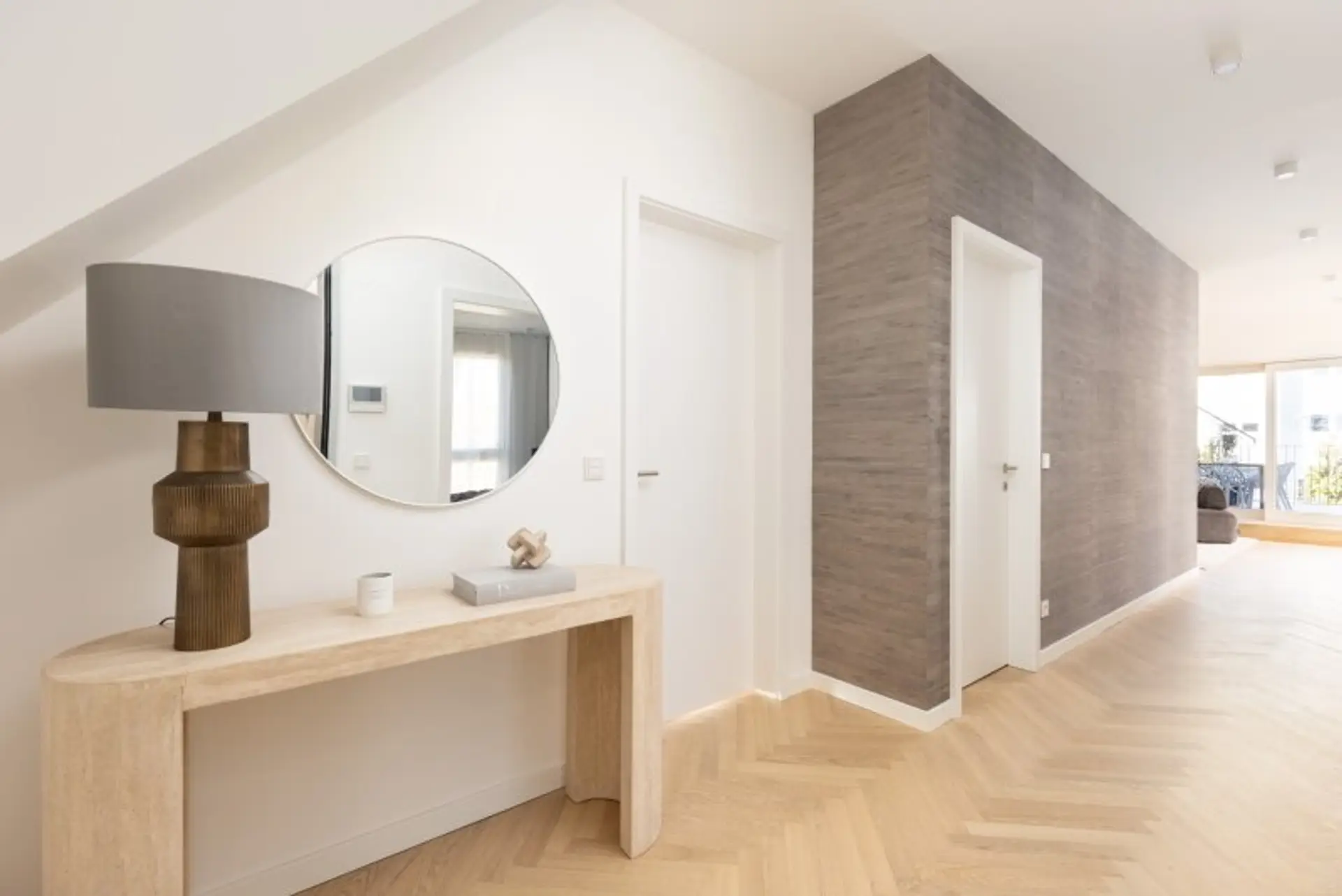 Der französische Chic des Namens spiegelt sich auch in der Auswahl der Materialen wieder. Formschöne Eleganz bei hochwertigem Parkett (Fischgrät Optik) trifft großformatiges Feinsteinzeug sowie durchdachte Lichtplanung, gesundheits- und raumklimabewusste Wandgestaltung (Lehmputz in den Schlafbereichen), zukunftsweisende Kühlung und Heizung (Luftwärmepumpe) und generelle stimmige, zeitlos elegante Ausführung im Designkonzept und überhohe Türen.
