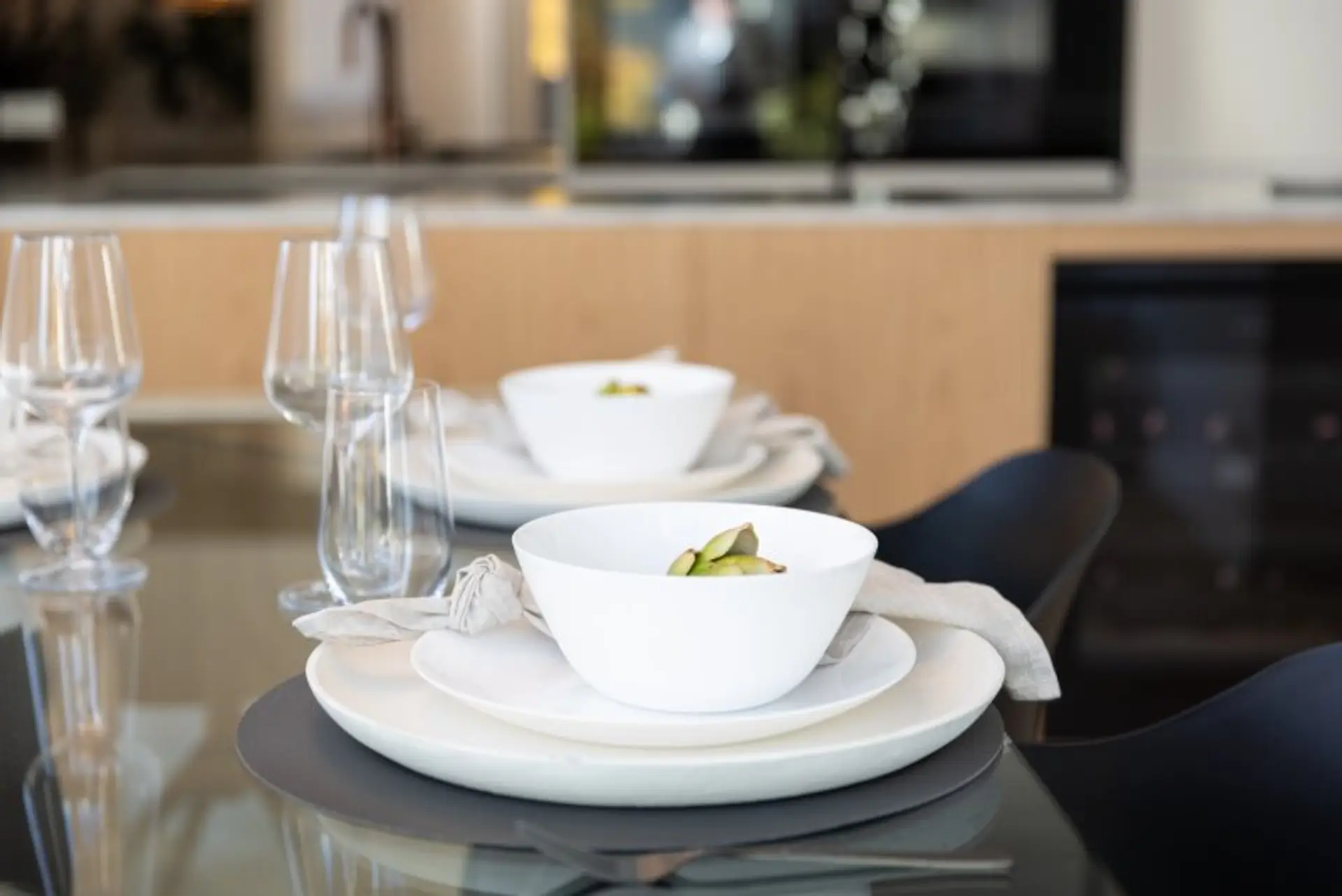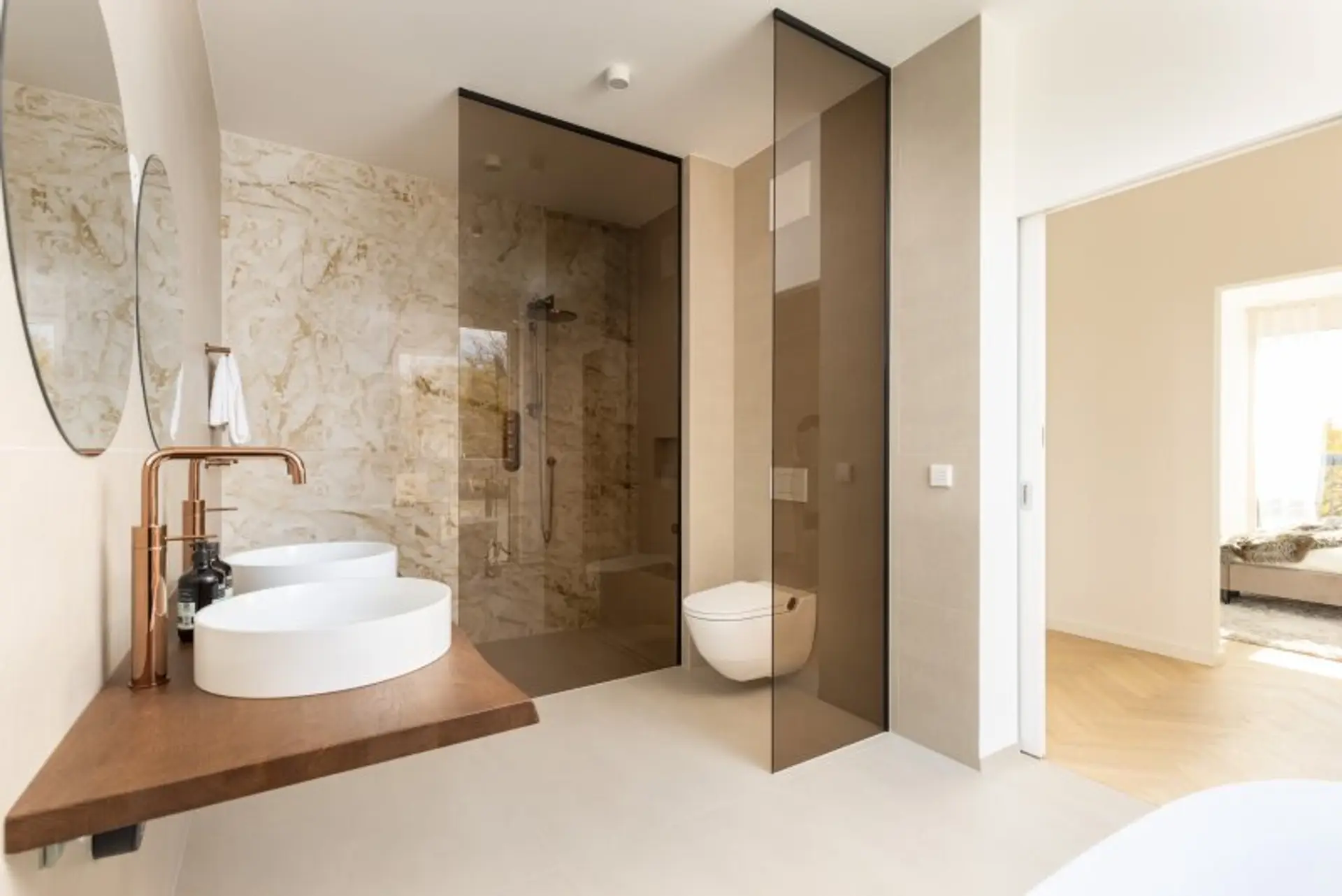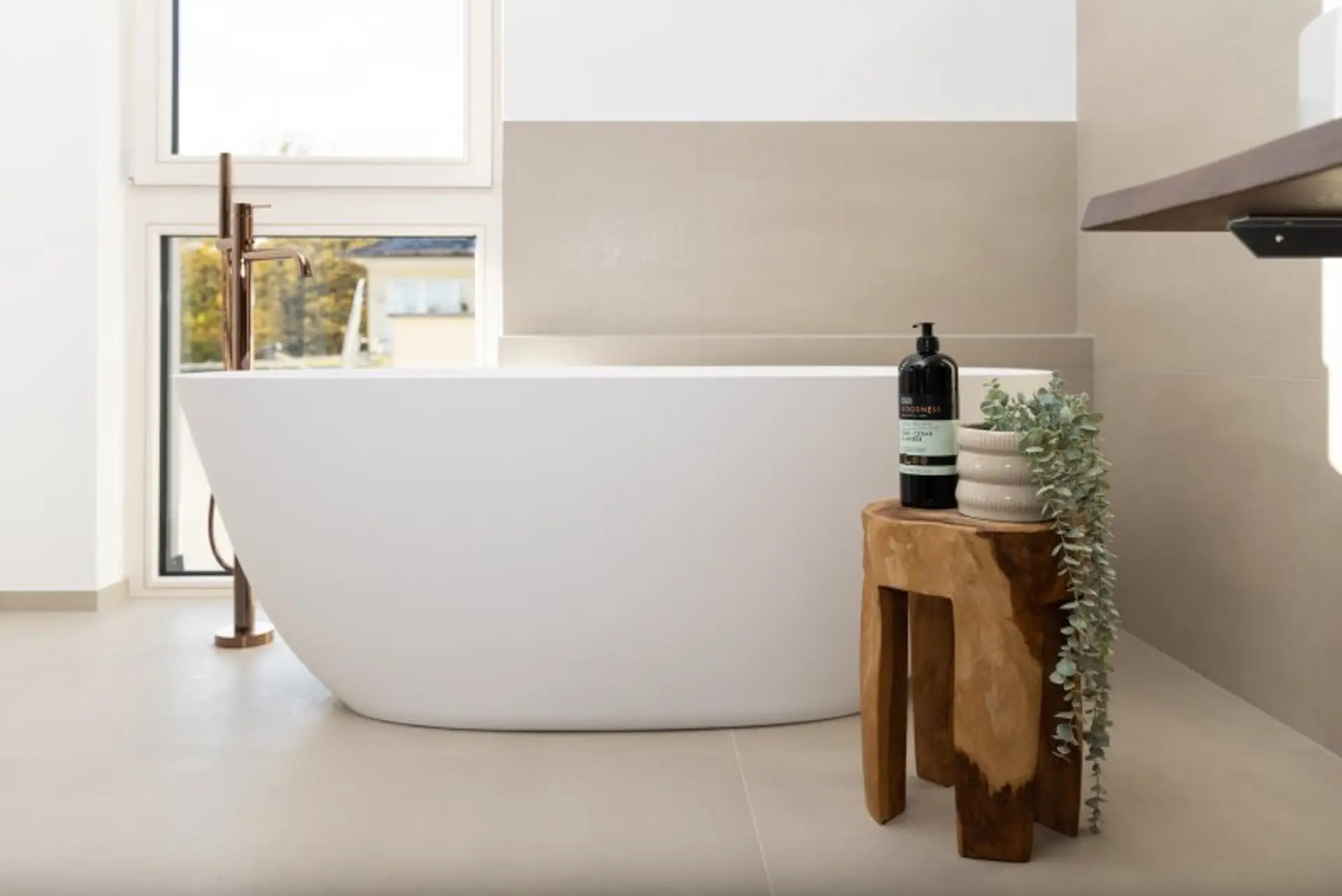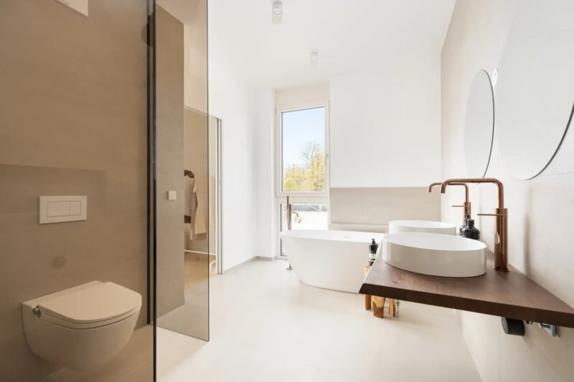 Die Bäder sind mit burgbad-Waschbecken und Waschtischplatten ausgestattet. Burgbad ist seit 2016 klimaneutral und trägt renommierte Nachhaltigkeitssiegel wie Blauer Engel und EcoVadis Bronze. Mineralguss-Waschbecken bestehen zu rund 80 % aus natürlichen Rohstoffen. Der innovative CleanFlow-Siphon reduziert Wasserverbrauch, Materialeinsatz und Reinigungsmittel – ein perfektes Zusammenspiel von Design, Hygiene und Nachhaltigkeit.