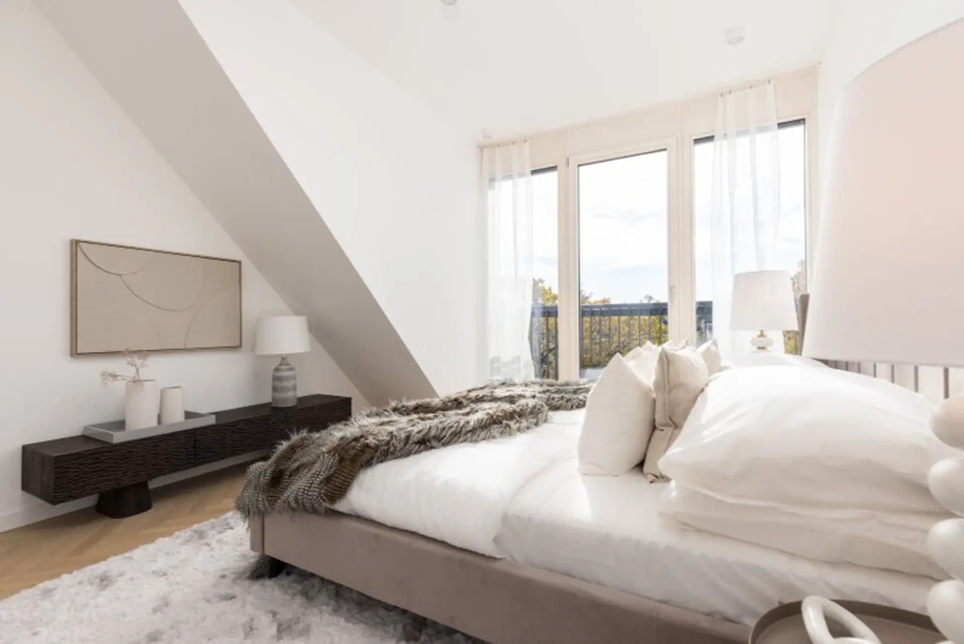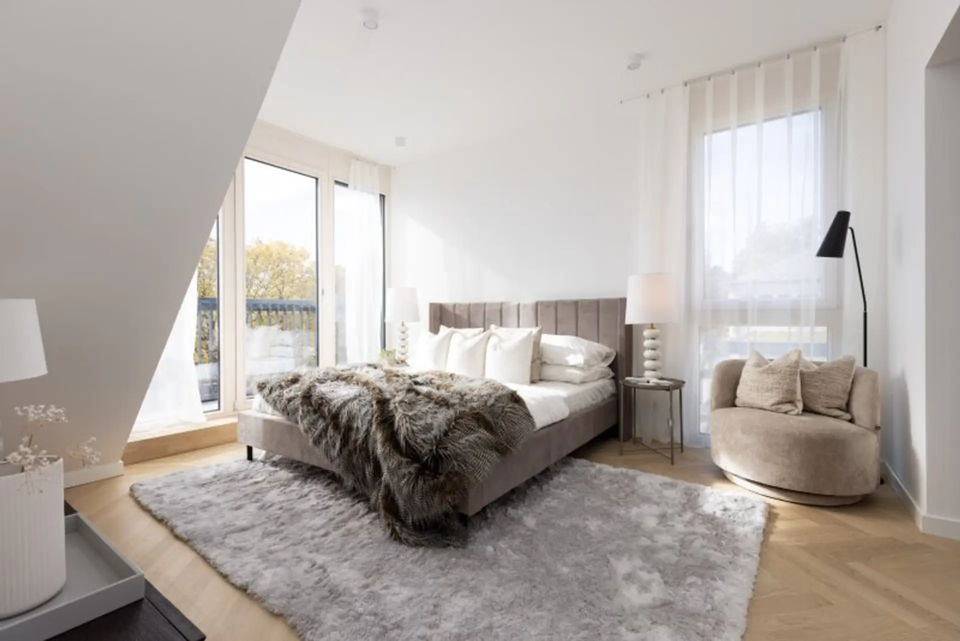 Nicht weniger spektakulär und vor allem ideal aufgeteilt ist der Master-Bedroom des Penthouses, welcher rund 30 m² umfasst und nicht nur über ein Tageslicht-Badezimmer mit Dusche, Wanne, WC und Doppelwaschbecken sowie eine begehbare Garderobe verfügt, sondern auch über eine kleine, süd/ost-seitige Terrasse mit Wien-Blick. Durch die herrliche Raumhöhe von 2,85 m wirken die einzelnen Bereiche offen und luftig und bieten für hohe Einbauschränke tolle Staumöglichkeiten um auch für umfangreichere Garderobe geeignet zu sein.