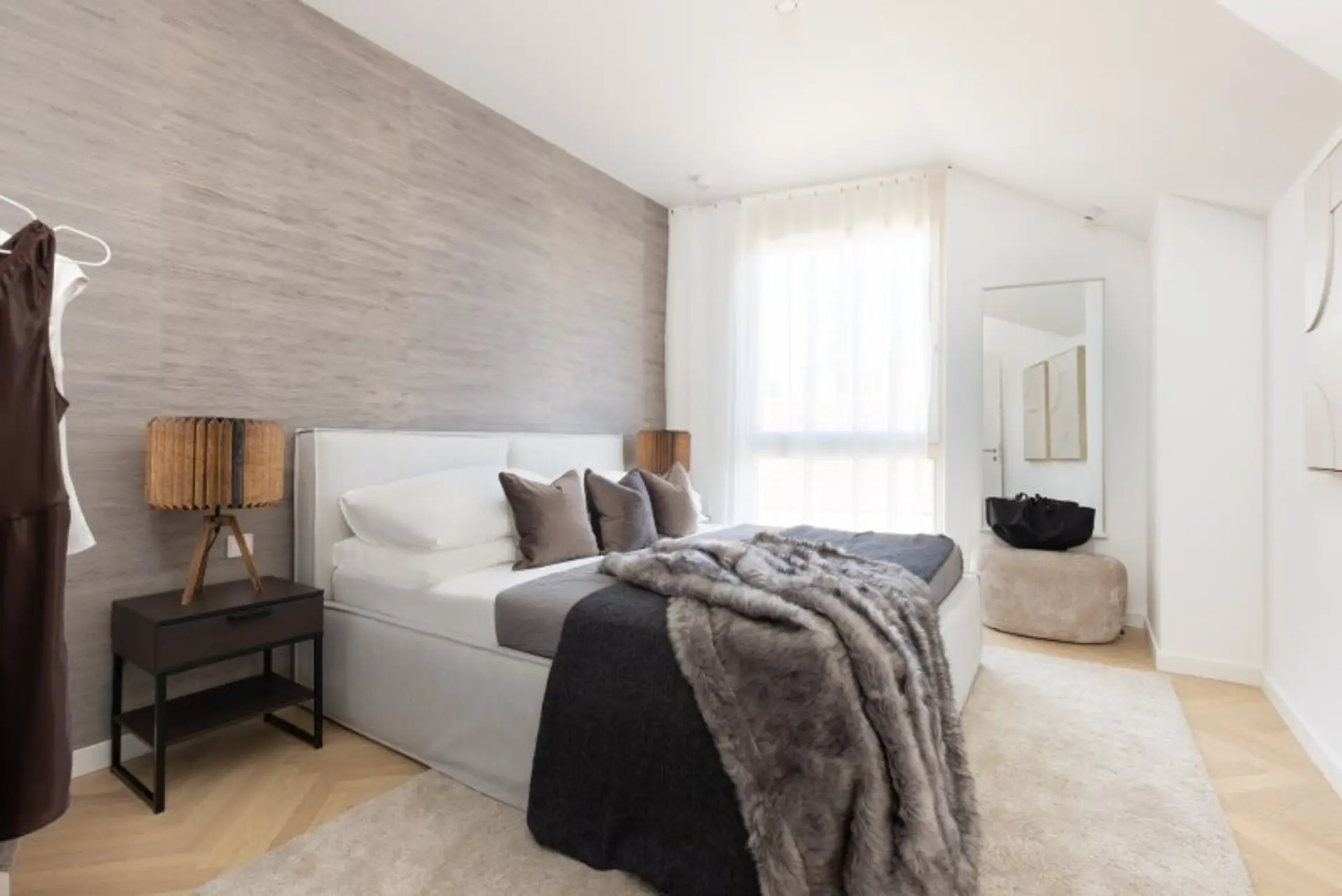 Neben dem Master-Bedroom verfügt das Penthouse über ein weiteres Schlafzimmer, welche natürlich auch als Gäste- oder Bürobereich ideal geeignet ist. Auch hier gibt es neben gut nutzbaren Stauflächen im Raum selbst eine eigene begehbare Garderobe durch welche das separate WC sowie ein weiteres Tageslicht-Badezimmer mit Dusche und Doppelwaschtisch zu betreten sind.